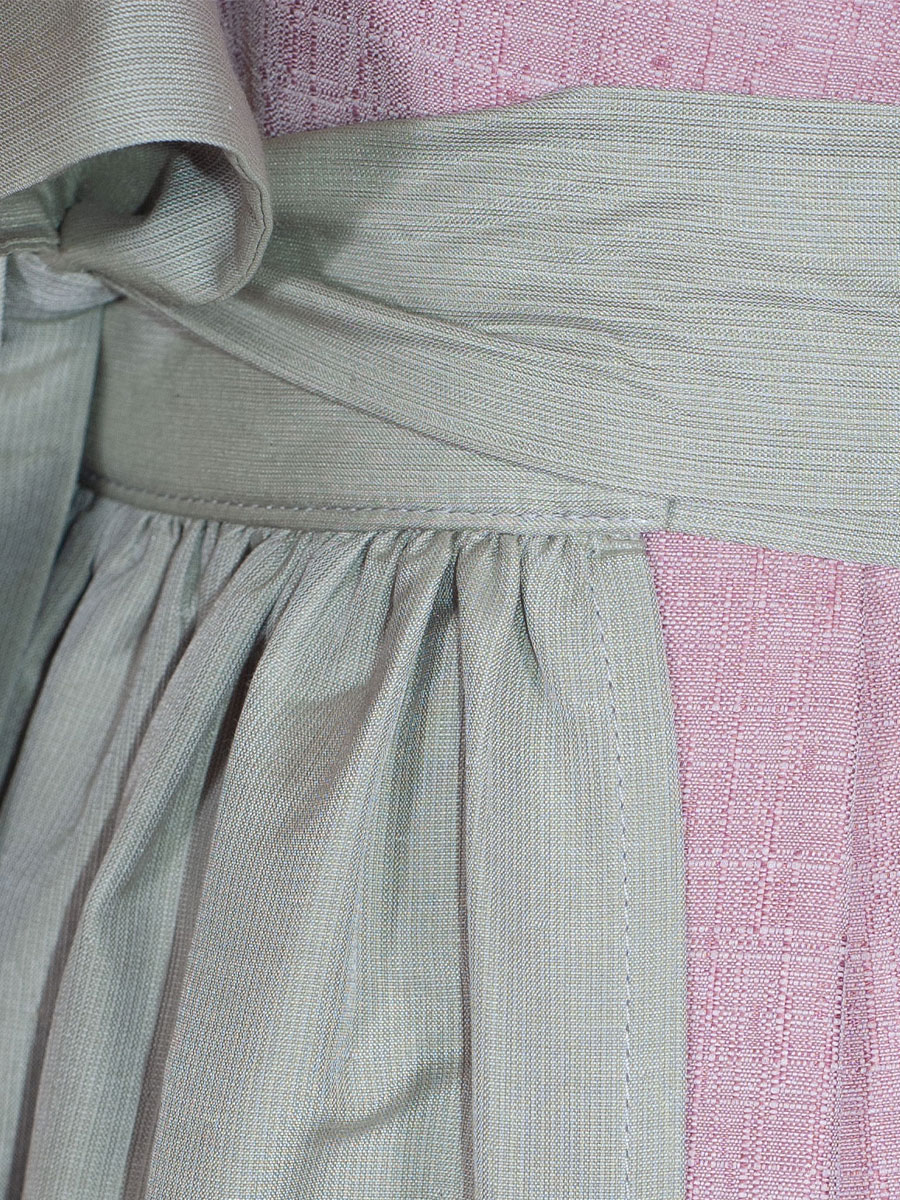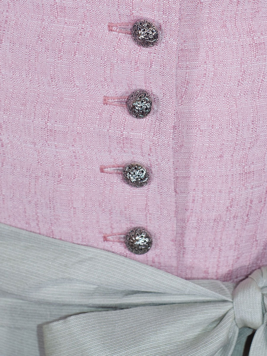 Elegantes und hochwertiges Midi-Dirndl Arelie von Anno Domini Design in Heugrün. Das wunderschöne Sommerdirndl in zartrose ist überall ein Hingucker. Das schlichte Oberteil ist aus Leinenstoff gefertigt und wird mit gemusterten Knöpfen geschlossen. Ebenfalls rosa ist der Rock, welcher mit zwei Samtborten am Abschluss verziert ist. Eine heufarbene Schürze rundet das Bild ab.