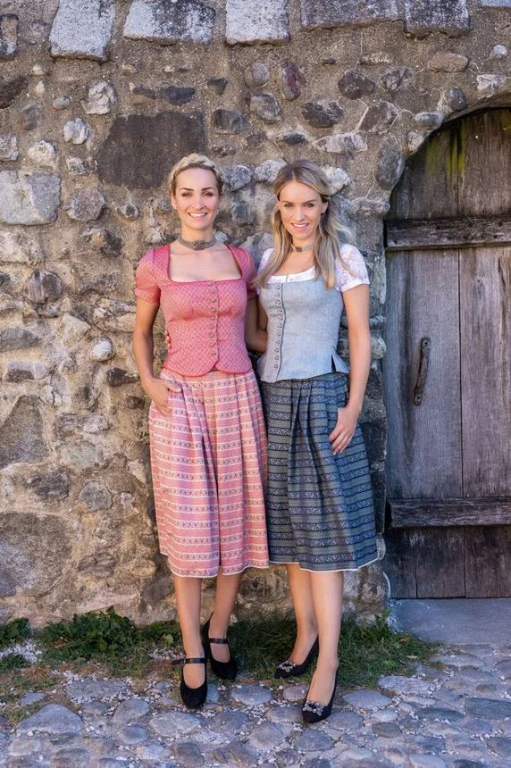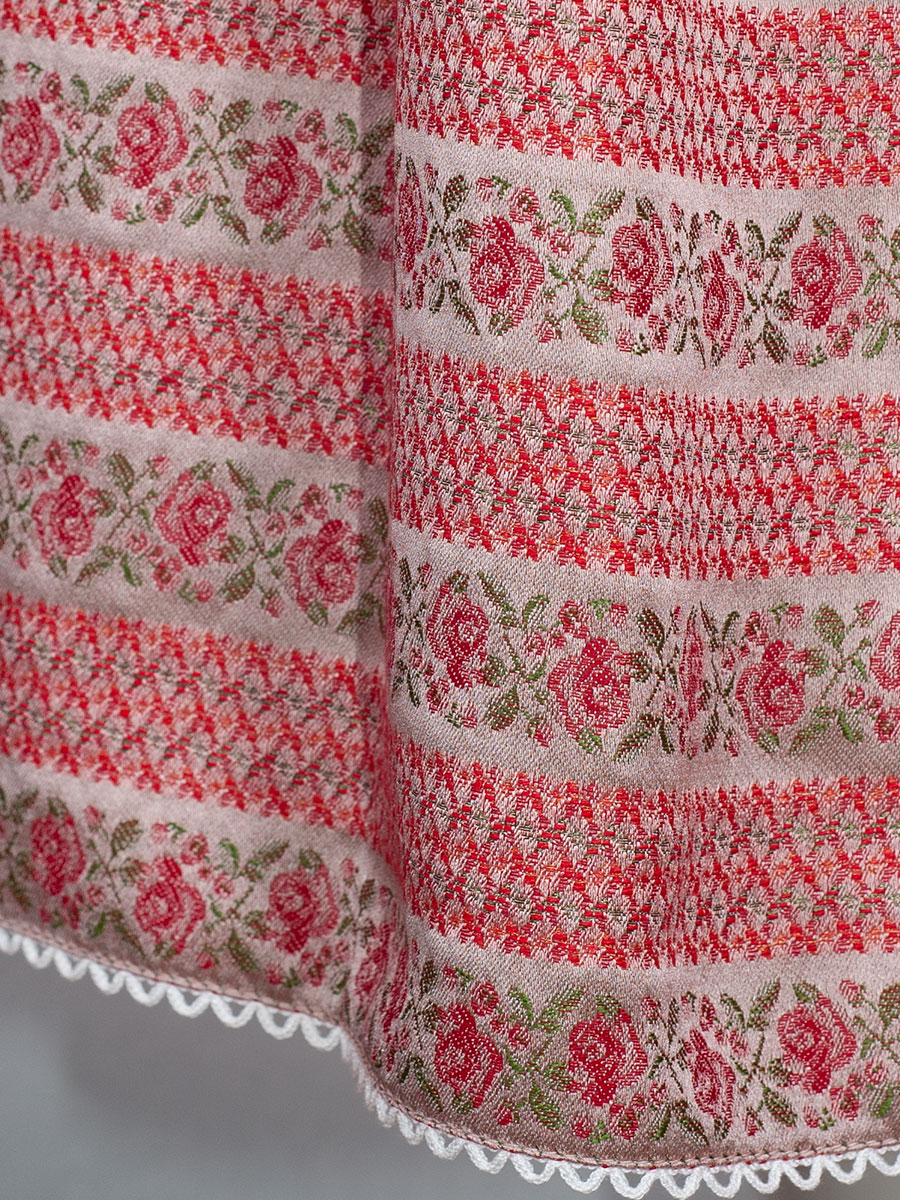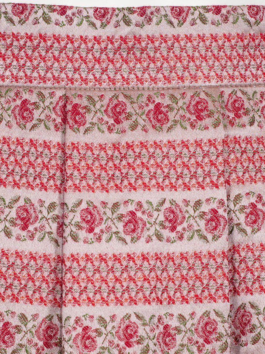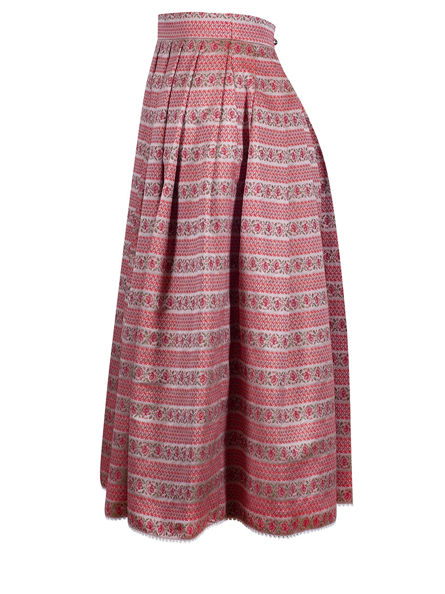 Eleganter Rock der Firma Anno Domini Design in hochwertiger Qualität. Der festliche Damenrock ist in Falten gelegt und hat einen schmalen Bund, der im Rücken mit einem gemusterten Knopf und Reißverschluss geschlossen wird. Ein mohnrotes Rosenmuster ziert in Querstreifen den Rock. Recht und links gibt es je eine Einschubtasche.