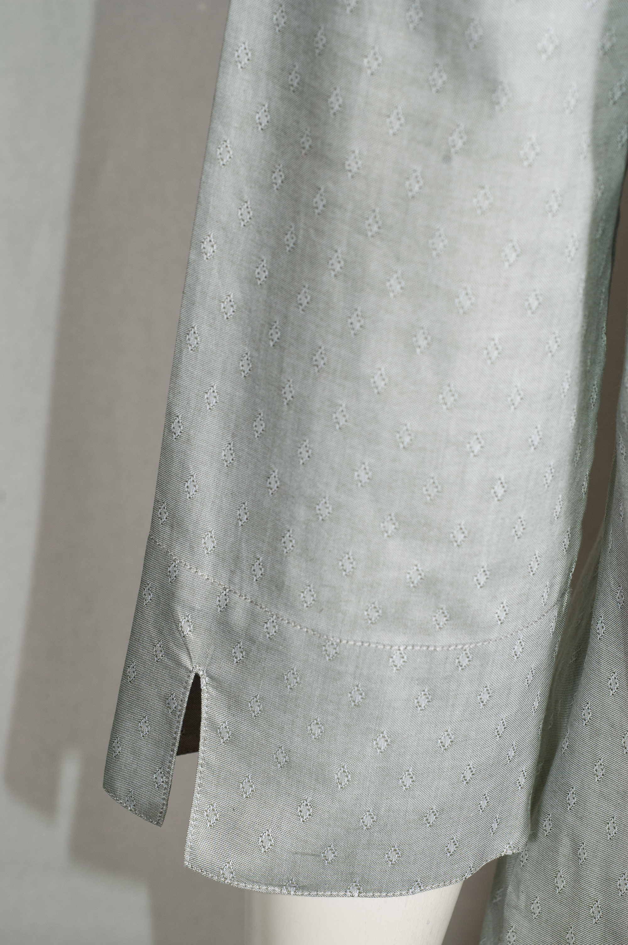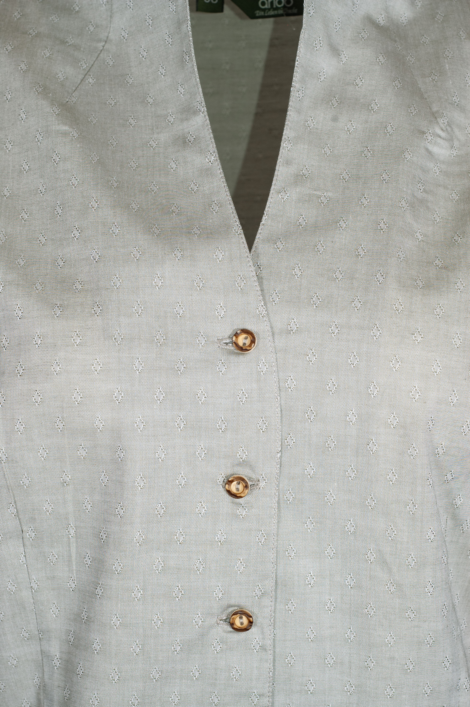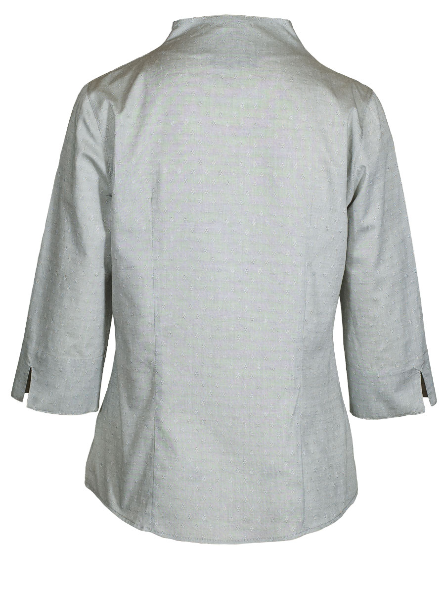 Hellgrüne Damenbluse der Firma Arido mit 3/4-Armen. Die Bluse ist in sich gemustert und hat einen Kelchkragen sowie V-Ausschnitt. Geschlossen wird die Damenbluse mit kleinen Hirschhornknöpfen.