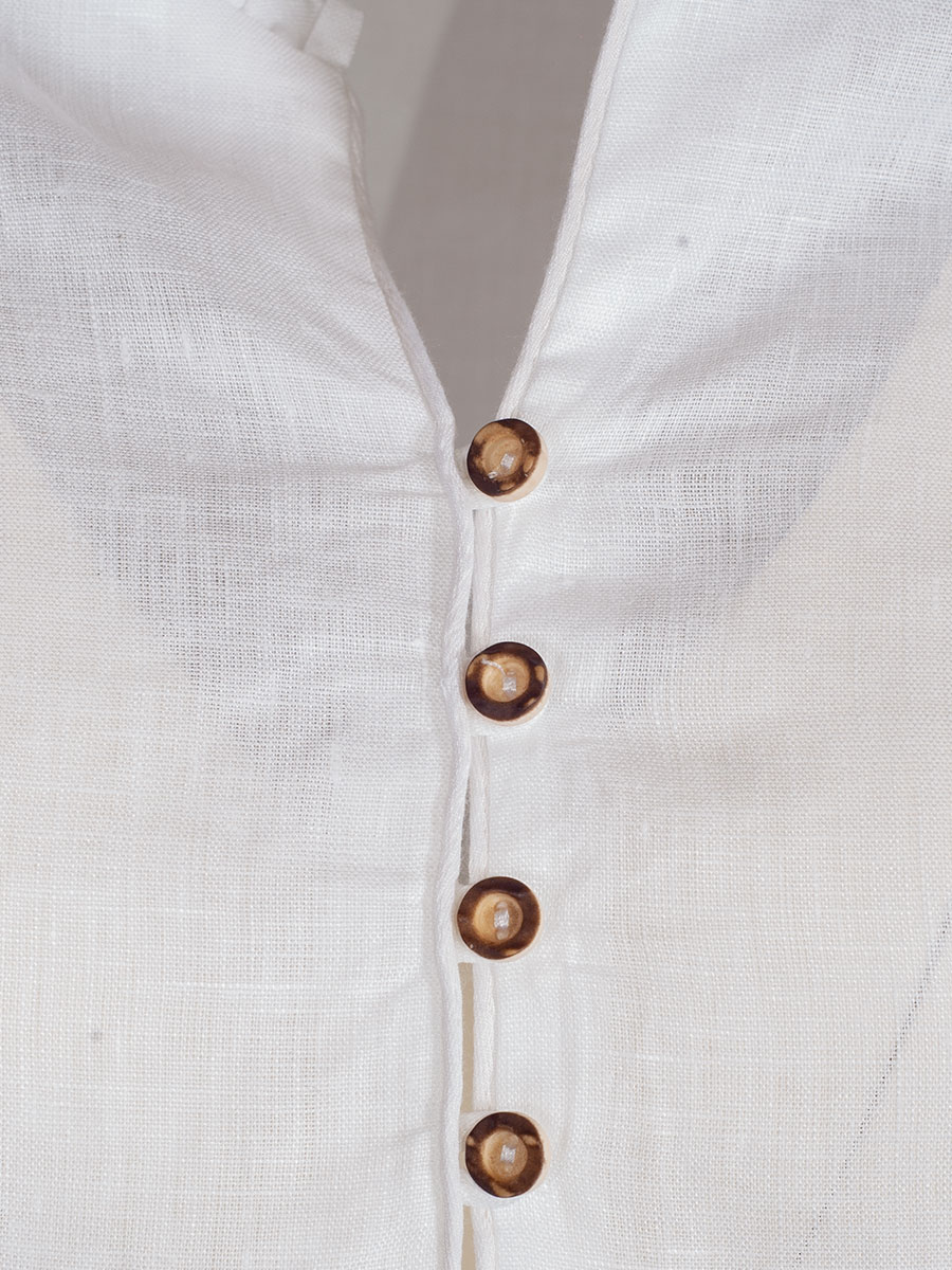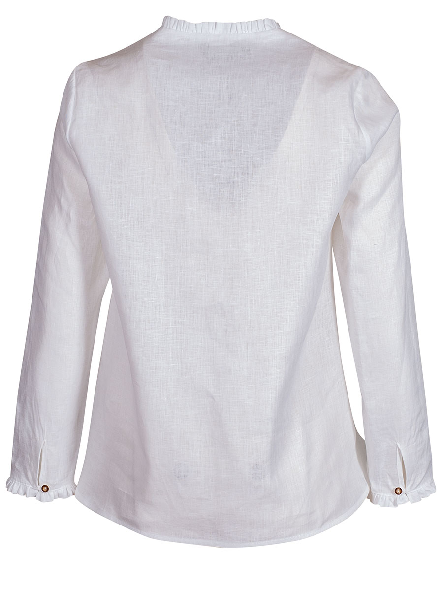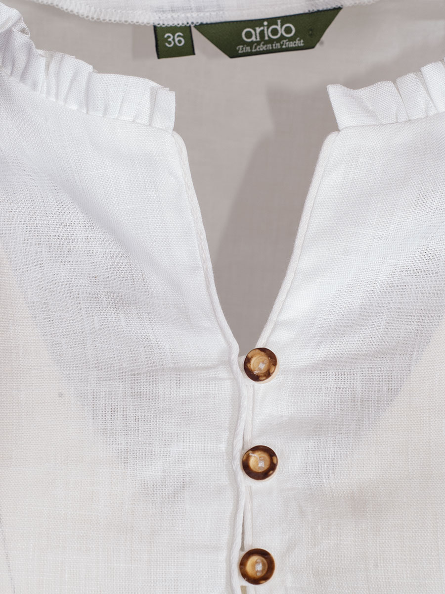 Langarmbluse der Markenfirma Arido in leichtem Leinenstoff. Die Damenbluse hat einen V-Ausschnitt und wird mit kleinen Hirschhornknöpfen geschlossen. Den Armabschluss und den Kragen umspielen dezente Rüschen.