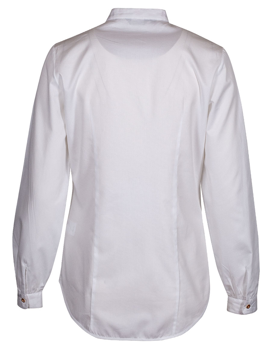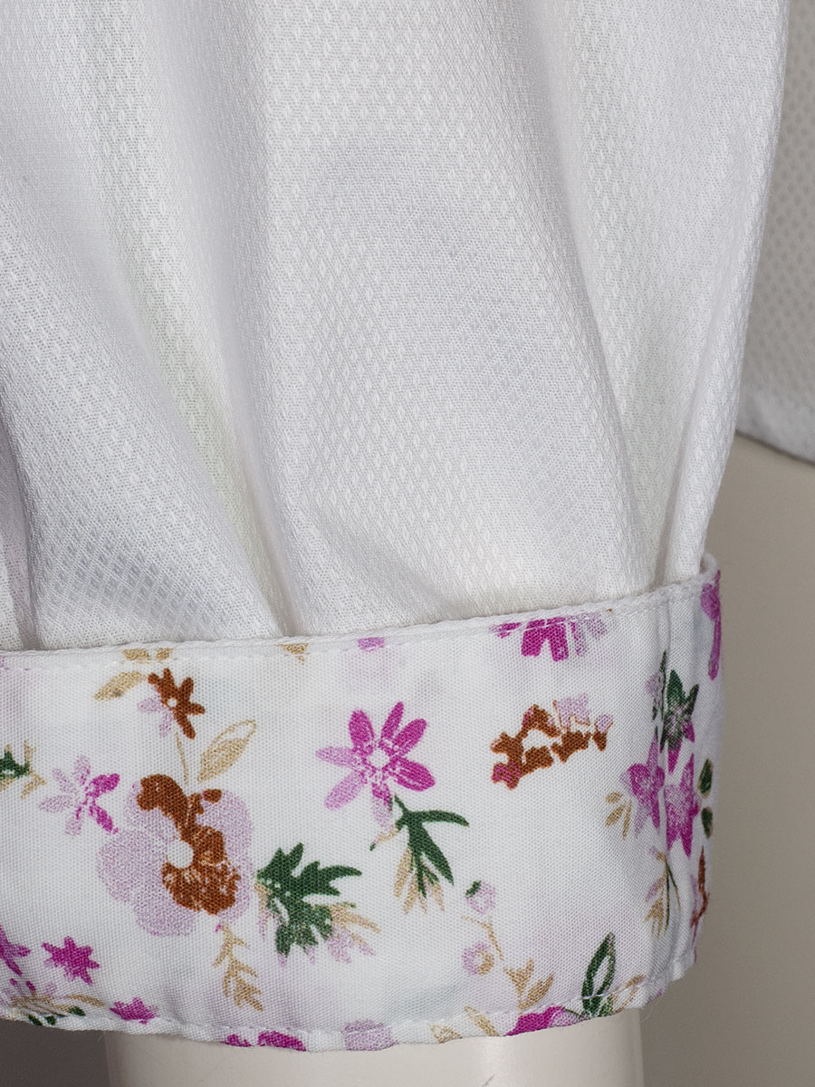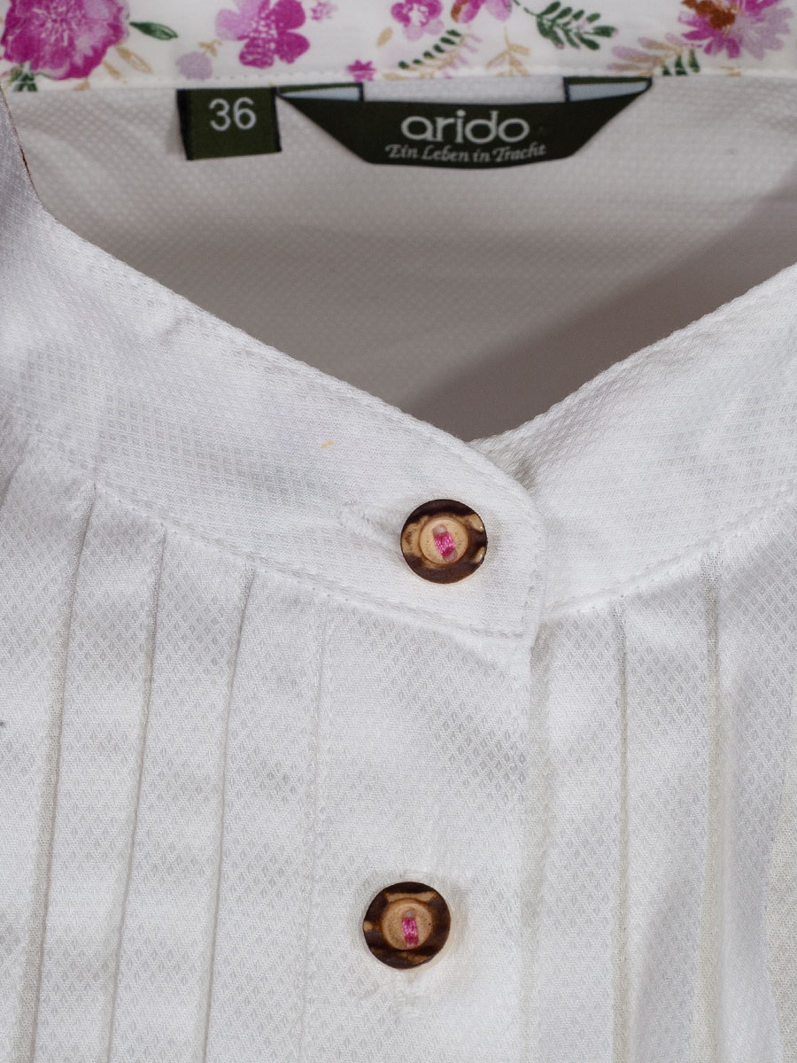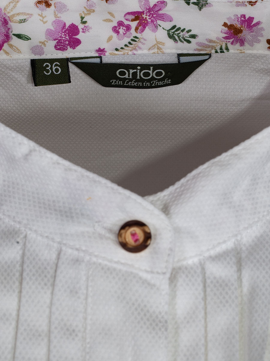 Luftige Damenbluse in weißem strukturiertem Stoff der Firma Arido. Die Bluse ist durchgeknöpft, hat einen Liegekragen und entlang der Knopfleiste abgesteppte Nähte. Das Rückenteil ist länger geschnitten. Die Innenseite der Manschetten und des Kragens sind mit einem pinken Blumenmuster bedruckt.
