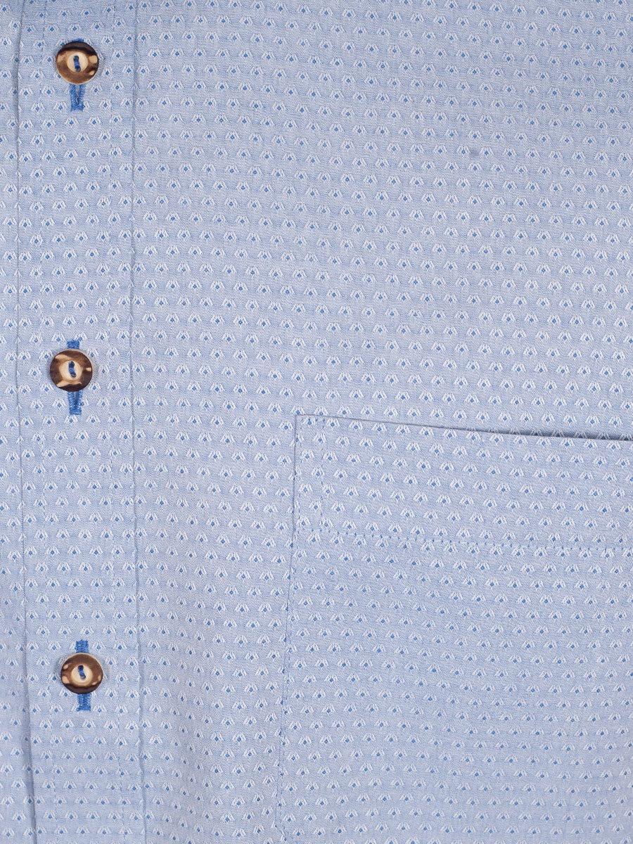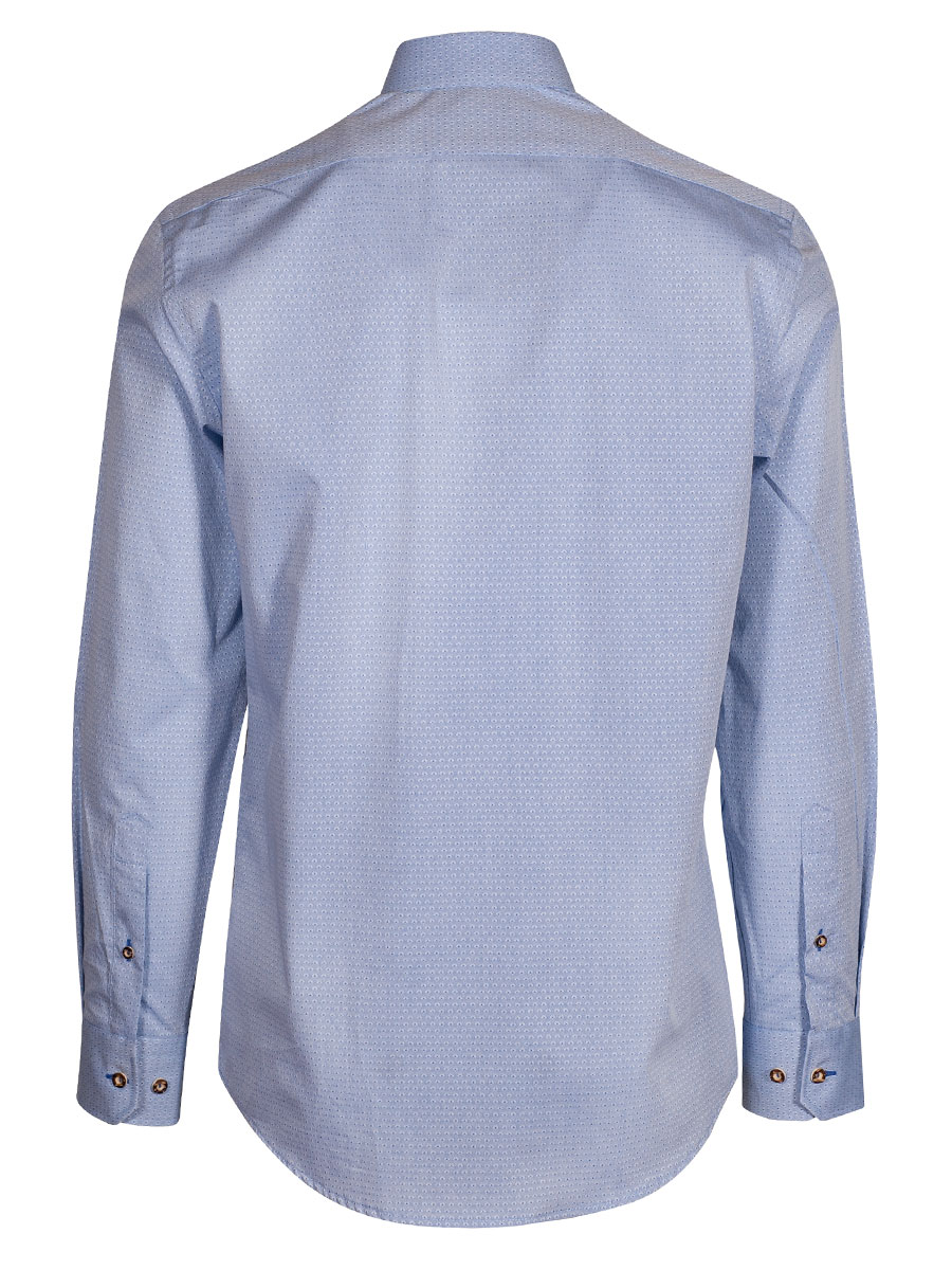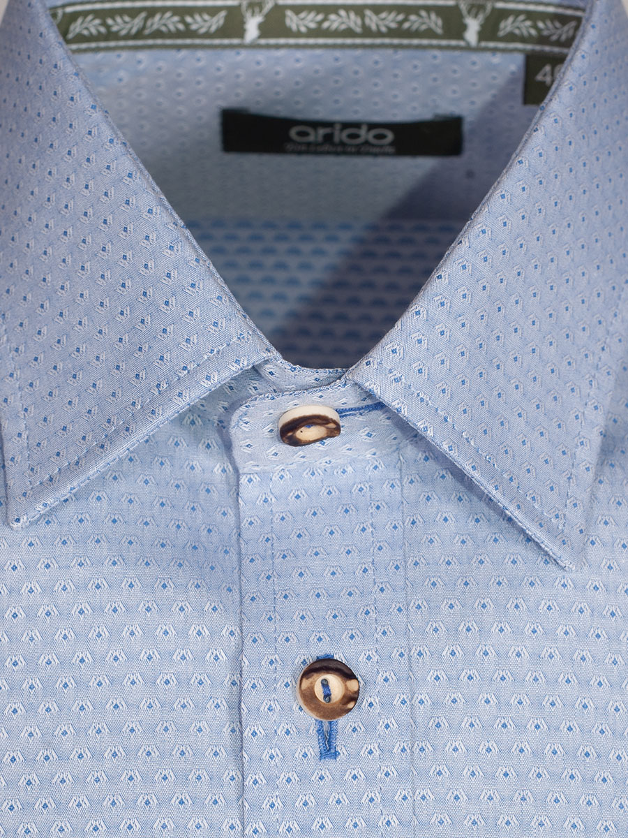 Blaues Herrenhemd der Firma Arido mit Liegekragen und Hirschhornknöpfe. Das Hemd ist in sich strukturiert und hat eine Brusttasche.