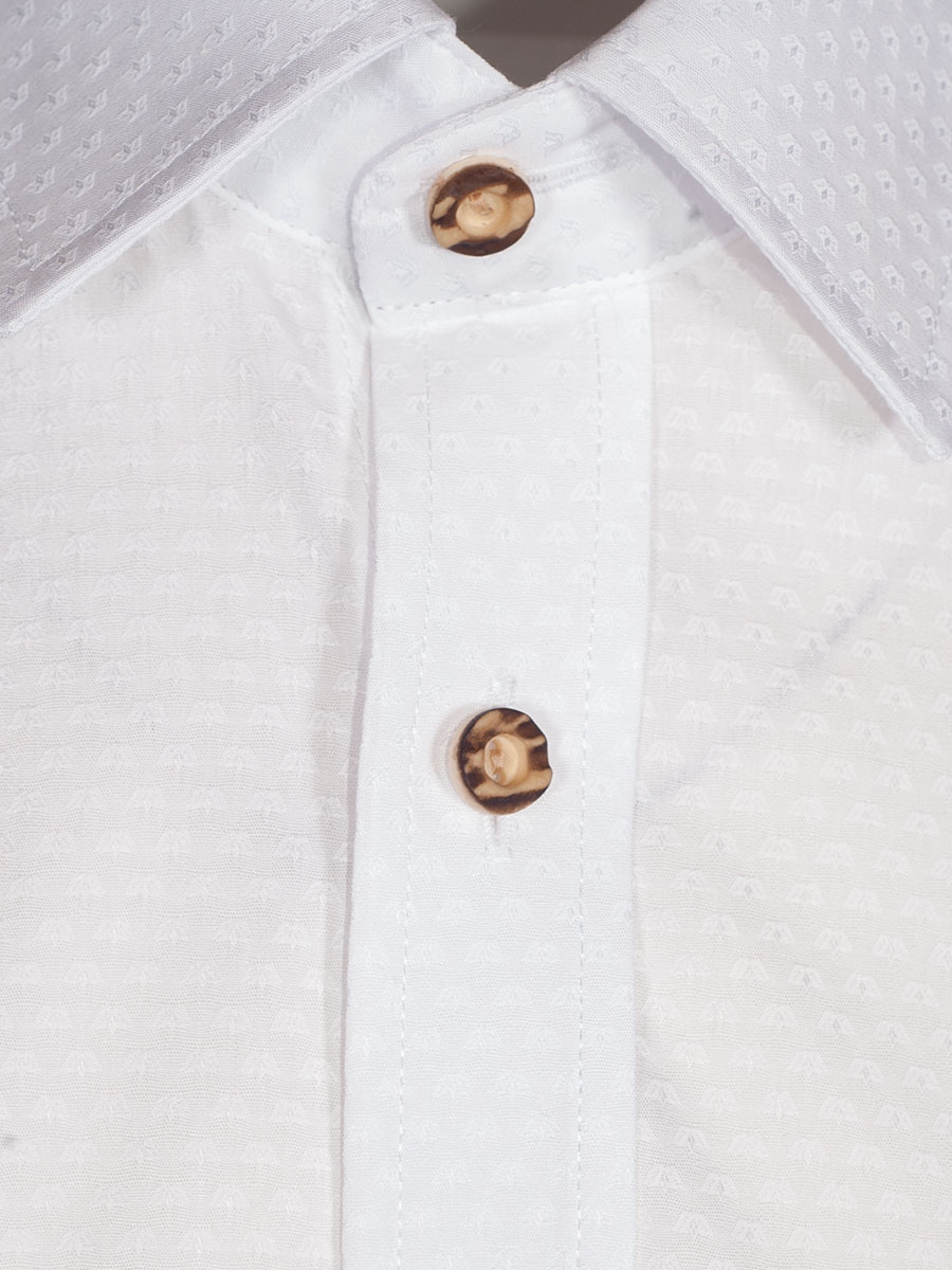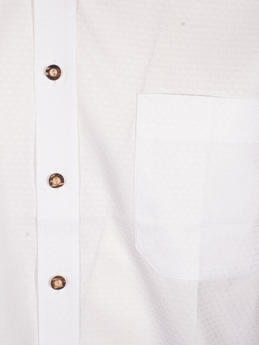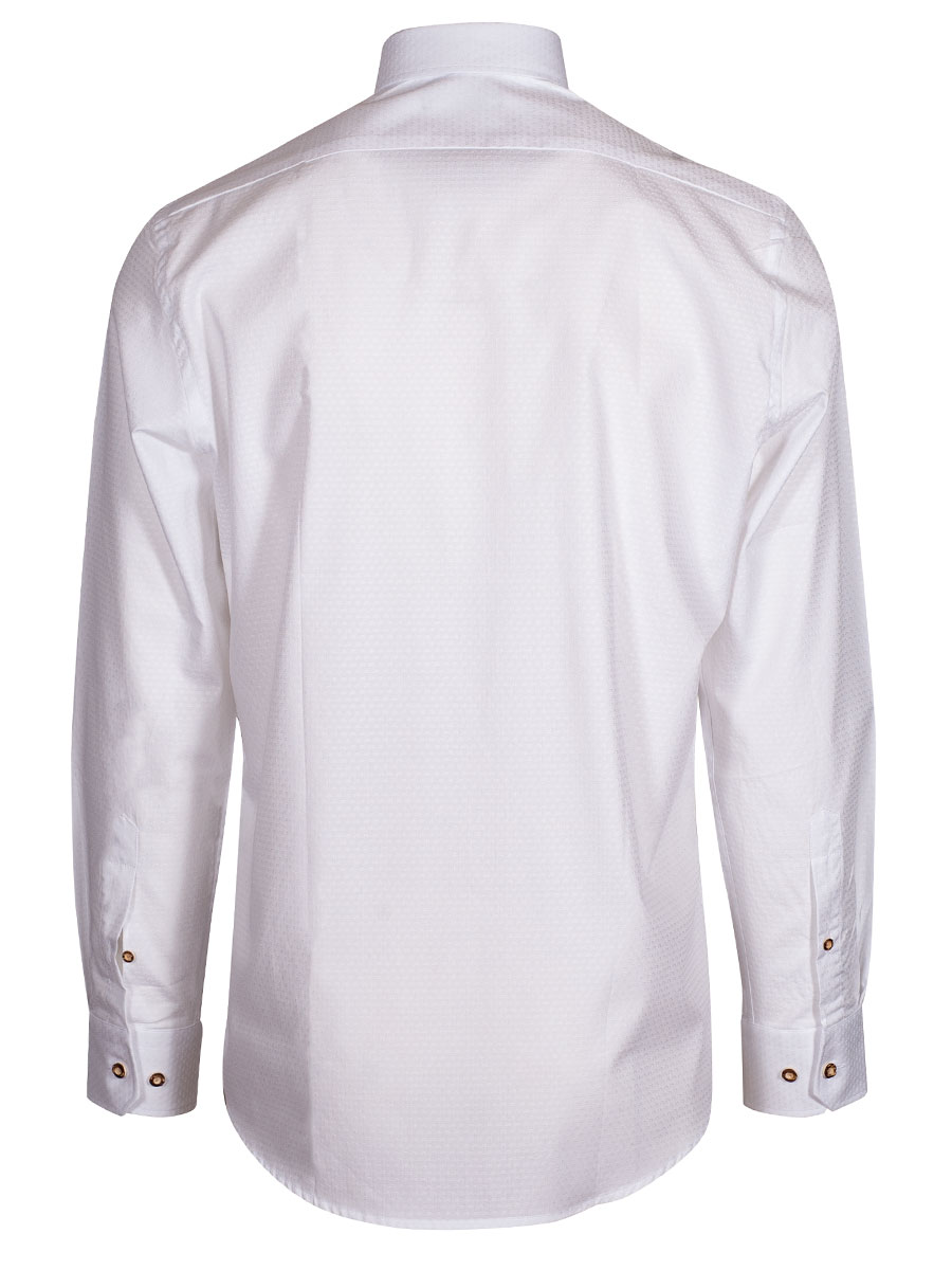 Weißes Herrenhemd der Firma Arido mit Liegekragen und Hirschhornknöpfe. Das Hemd ist in sich strukturiert und hat eine Brusttasche.