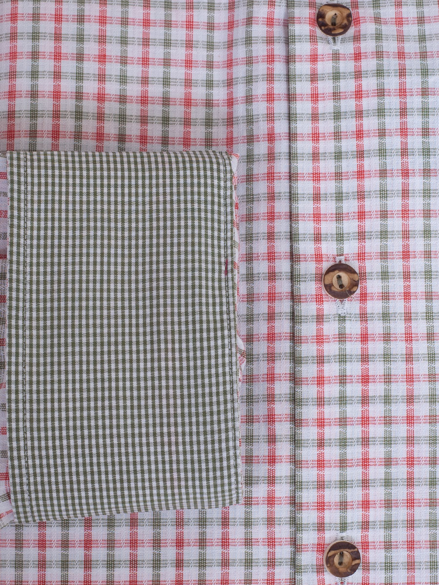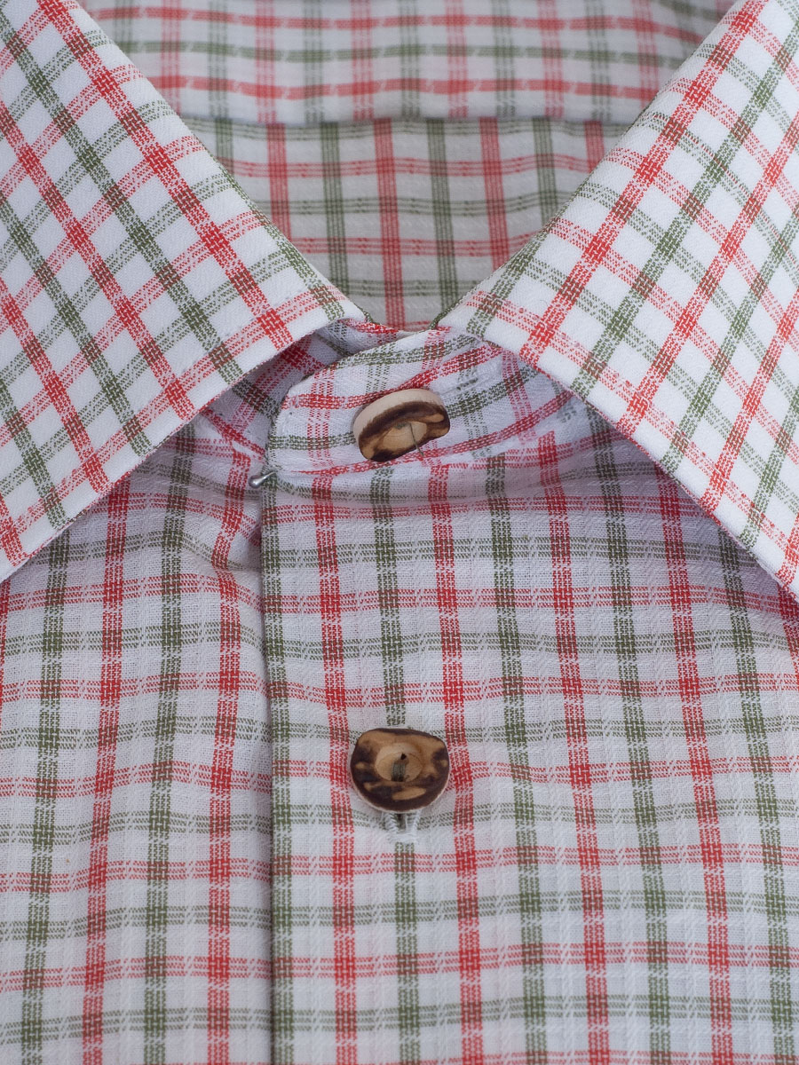 Klassisches, durchgeknöpftes Karohemd mit Liegekragen in rot und grün. Hirschhornknöpfe schließen das Herrenhemd. Die Krageninnenseite und die Innenseite der Manschetten sind grün kariert.