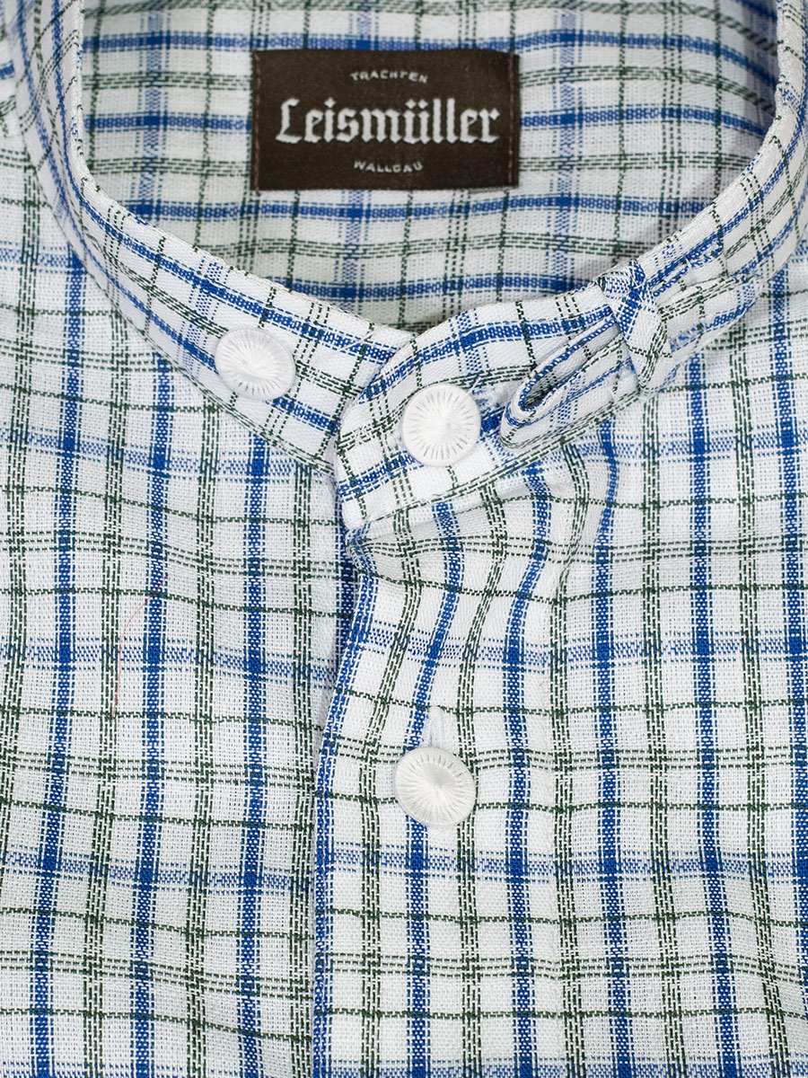 Trachtiges Karohemd für Herren in blau und grün der Firma Arzberger. Das Baumwollhemd hat einen Stehkragen und ist mit Riegel als Pfoad gearbeitet. Geschlossen wird das Herrenhemd mit weißen Wäscheknöpfen.