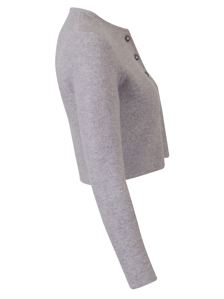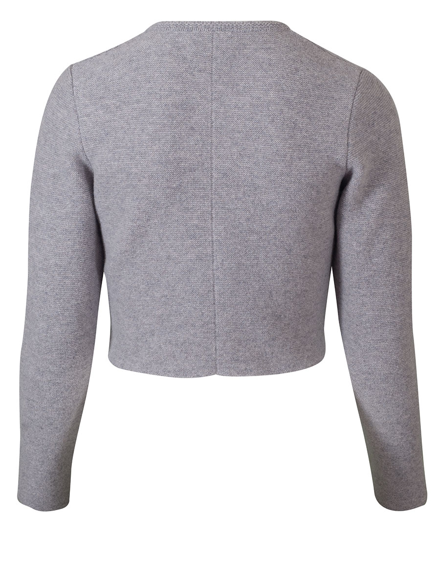 Kuschlige, kurze Dirndl-Strickjacke der bayerischen Qualitätsfirma Astrifa. Die kurze, hellgraue Jacke hat einen runden Ausschnitt und wird mit silberfarbenen Kugelknöpfen geschlossen. Um den Halsausschnitt und entlang der Knopfleiste verläuft ein anders gestrickter Abschluss. Den Rücken ist glatt gestrickt.