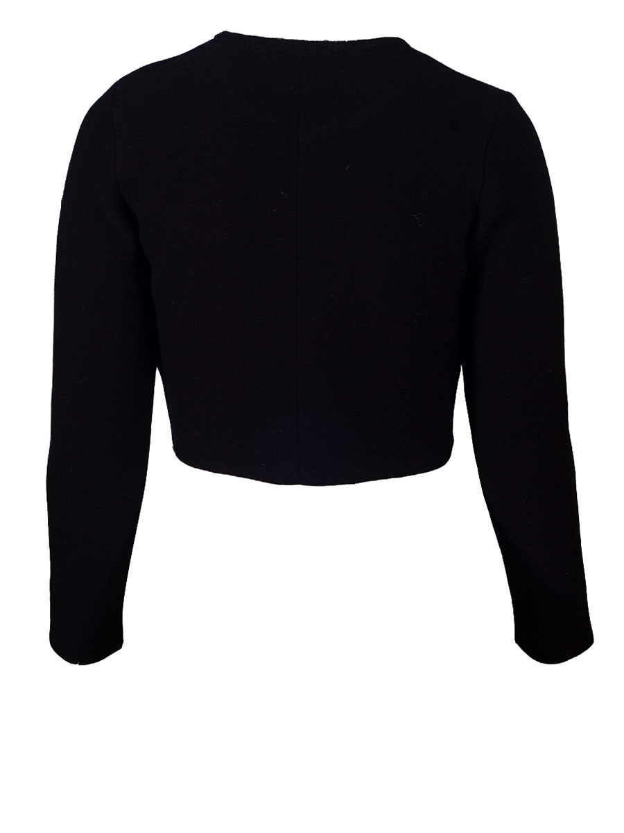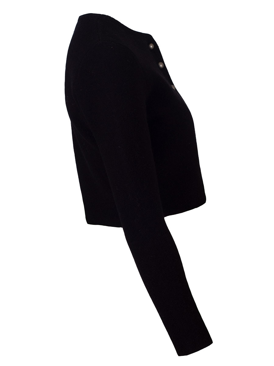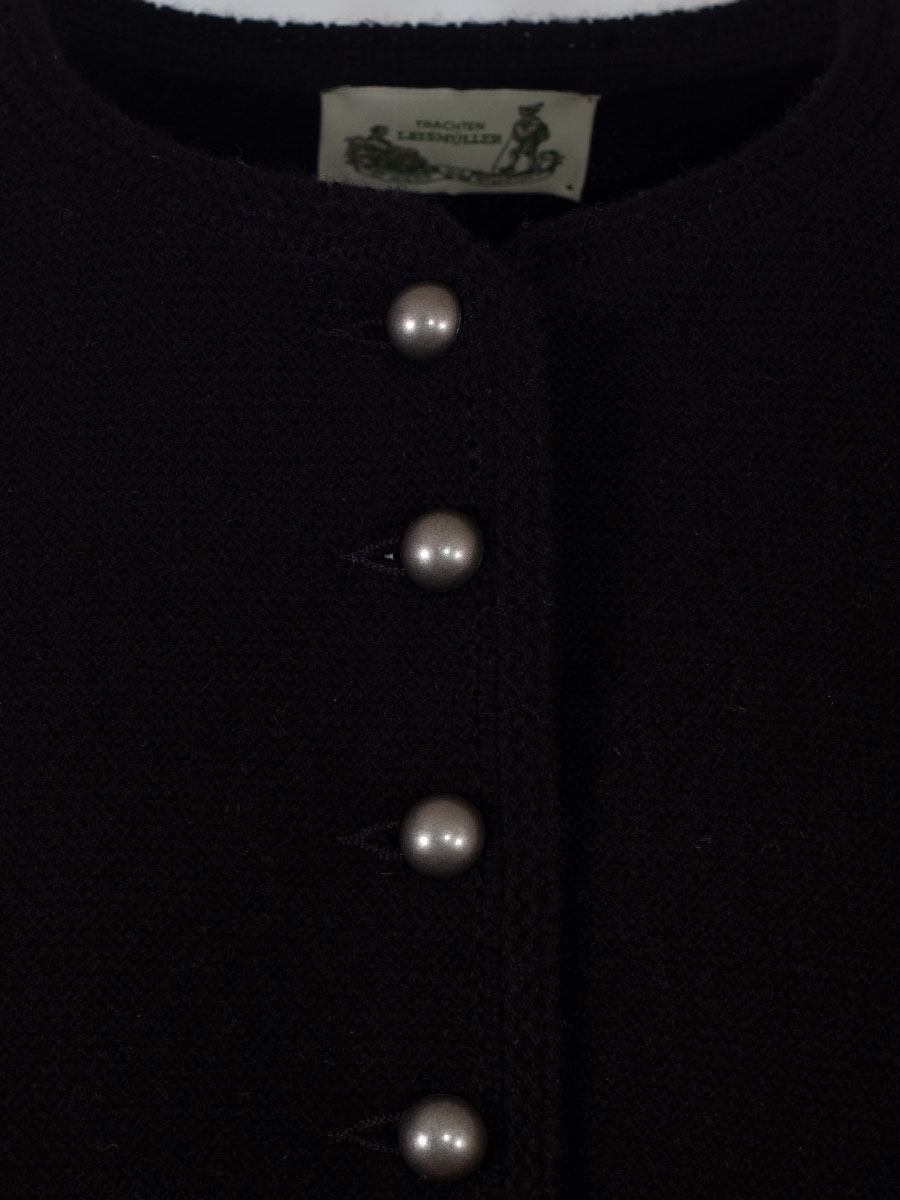 Kuschlige, kurze Dirndl-Strickjacke der bayerischen Qualitätsfirma Astrifa. Die kurze, schwarze Jacke hat einen runden Ausschnitt und wird mit silberfarbenen Kugelknöpfen geschlossen. Um den Halsausschnitt und entlang der Knopfleiste verläuft ein anders gestrickter Abschluss. Den Rücken ist glatt gestrickt.