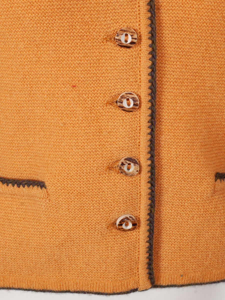 Kuschlige Strickjacke der bayerischen Qualitätsfirma Astrifa. Die goldgelbe Dirndlstrickjacke ist an allen Abschlüssen braun eingefasst und wird mit Hirschhornknöpfe geschlossen. Auf beiden Seiten der Damenstrickjacke befindet sich je eine kleine Tasche, die ebenfalls braun eingefasst ist.