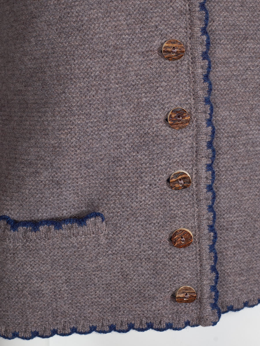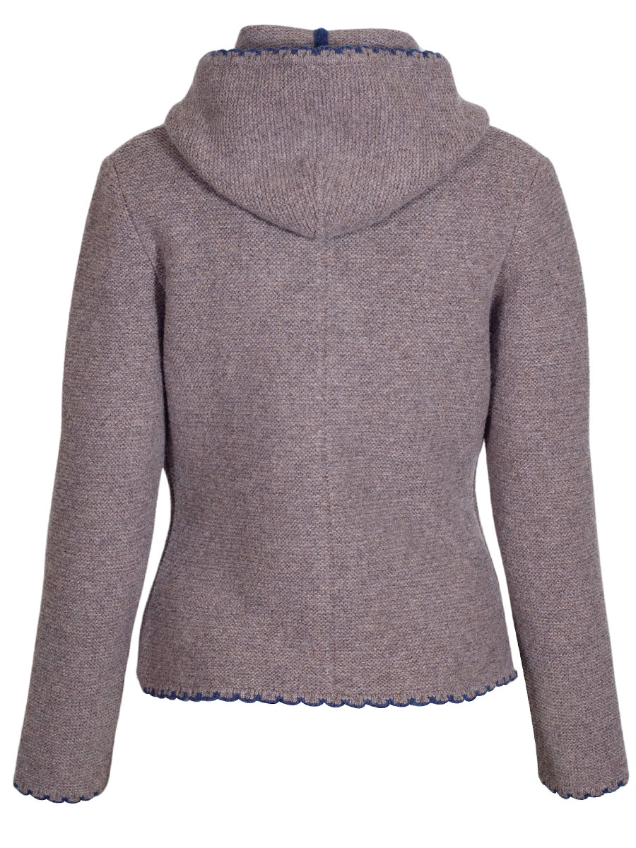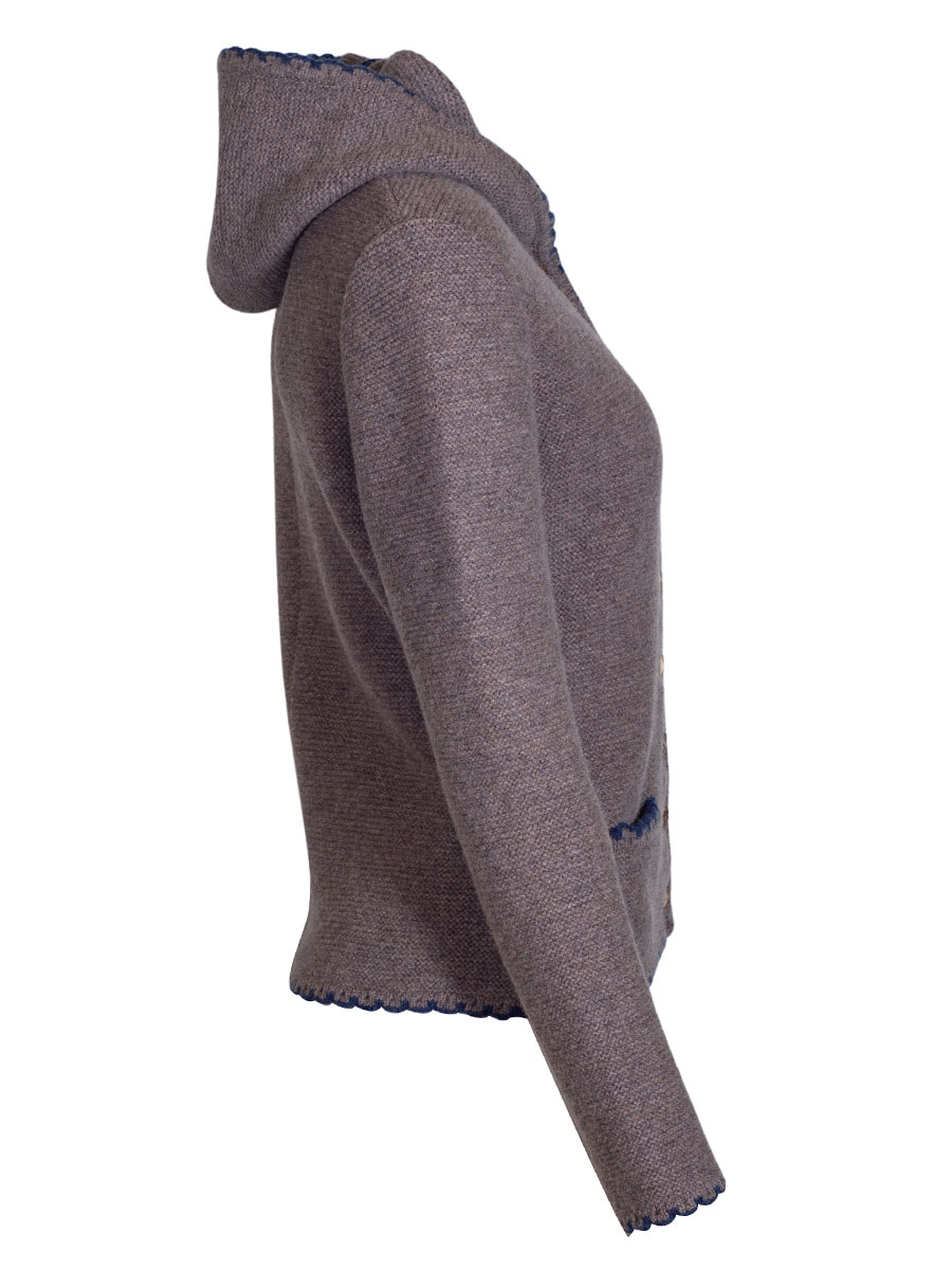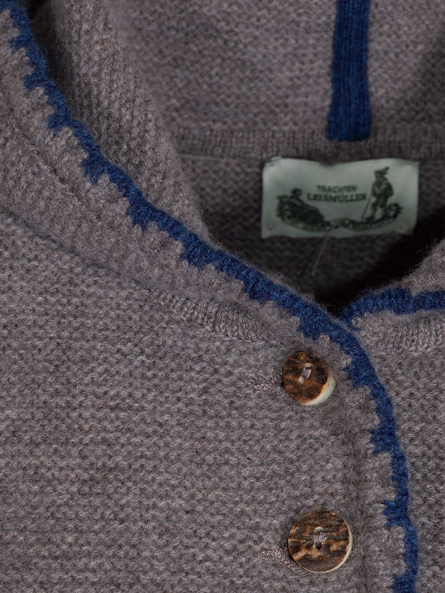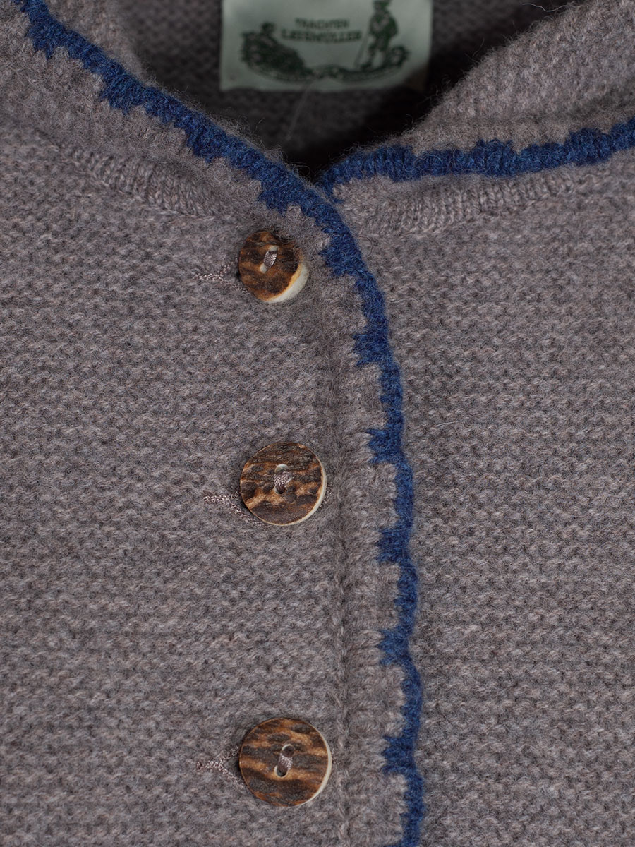 Kuschlige Strickjacke der bayerischen Qualitätsfirma Astrifa. Die schlammfarbene Jacke hat eine Kapuze und ist an allen Abschlüssen blau eingefasst. Hirschhornknöpfe schließen die Jacke. Auf beiden Seite gibt es eine kleine Einschubtasche, die ebenfalls blau eingefasst ist.