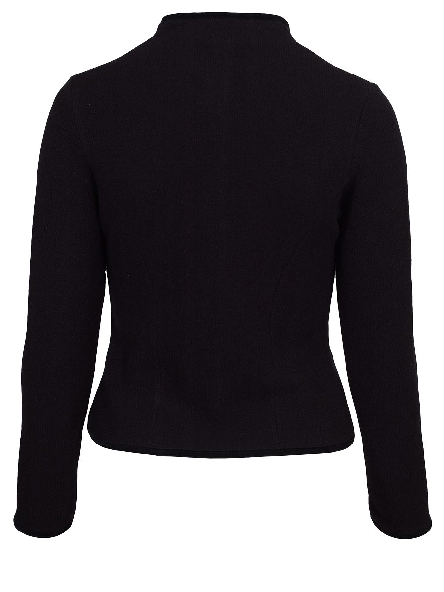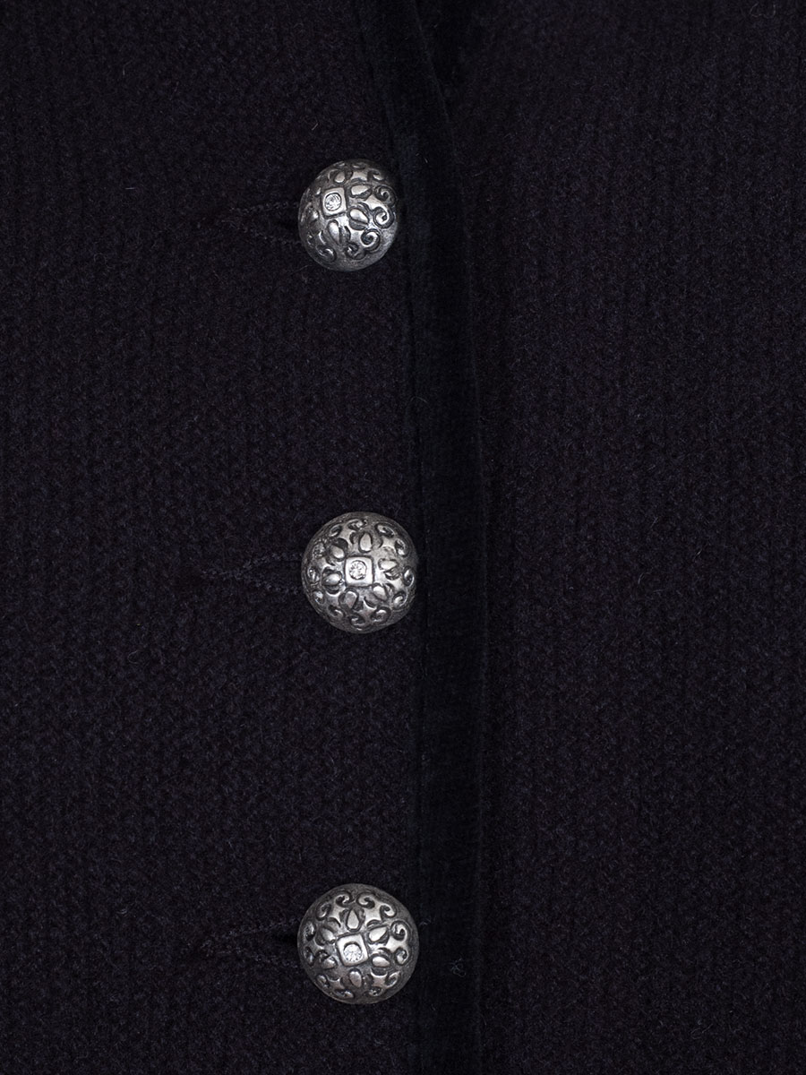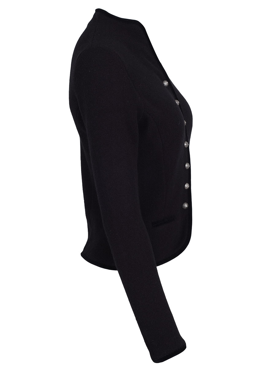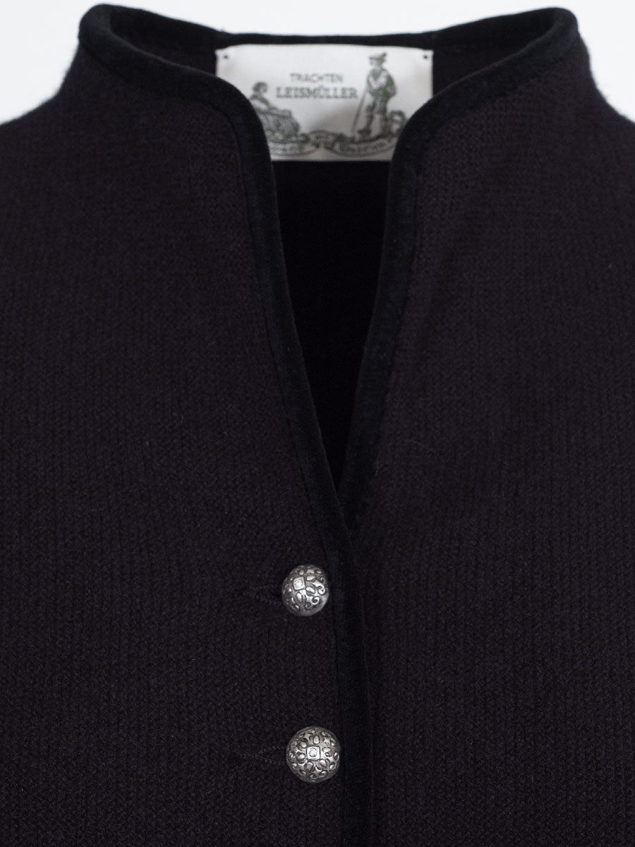 Elegante und weiche Strickjacke der bayerischen Qualitätsfirma Astrifa. Die schwarze Jacke hat an allen Abschlüssen eine schwarze Samteinfassung. Geschlossen wird die Dirndlstrickjacke mit kleinen verzierten Knöpfen. Auf beiden Seiten befindet sich je eine kleine Tasche, die ebenfalls mit schwarzem Samt eingefasst ist. Die Jacke können Sie sehr gut zu Ihrem Dirndl oder auch zum Trachtenrock kombinieren. Der Schnitt ist figurbetont und vorne am Abschluss zur Knopfleiste hin abgerundet.