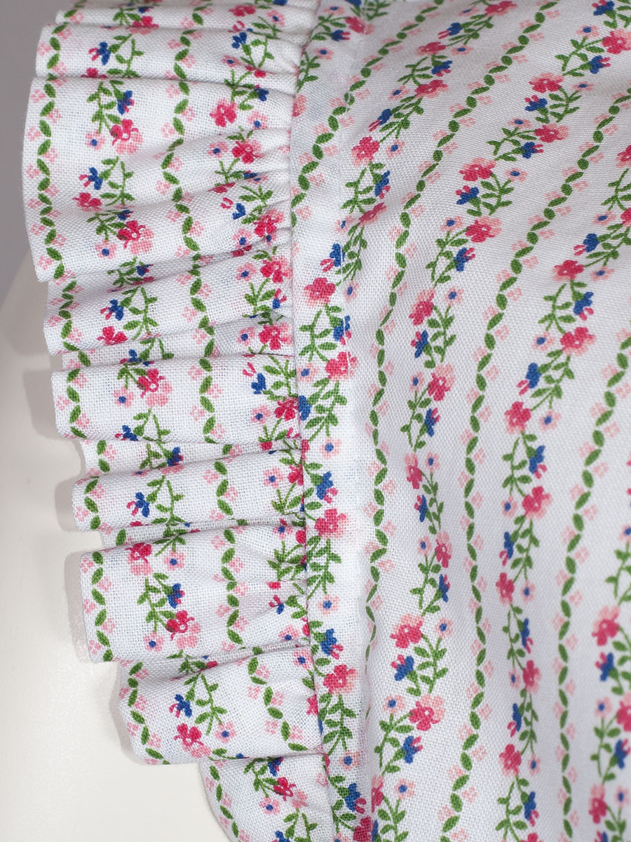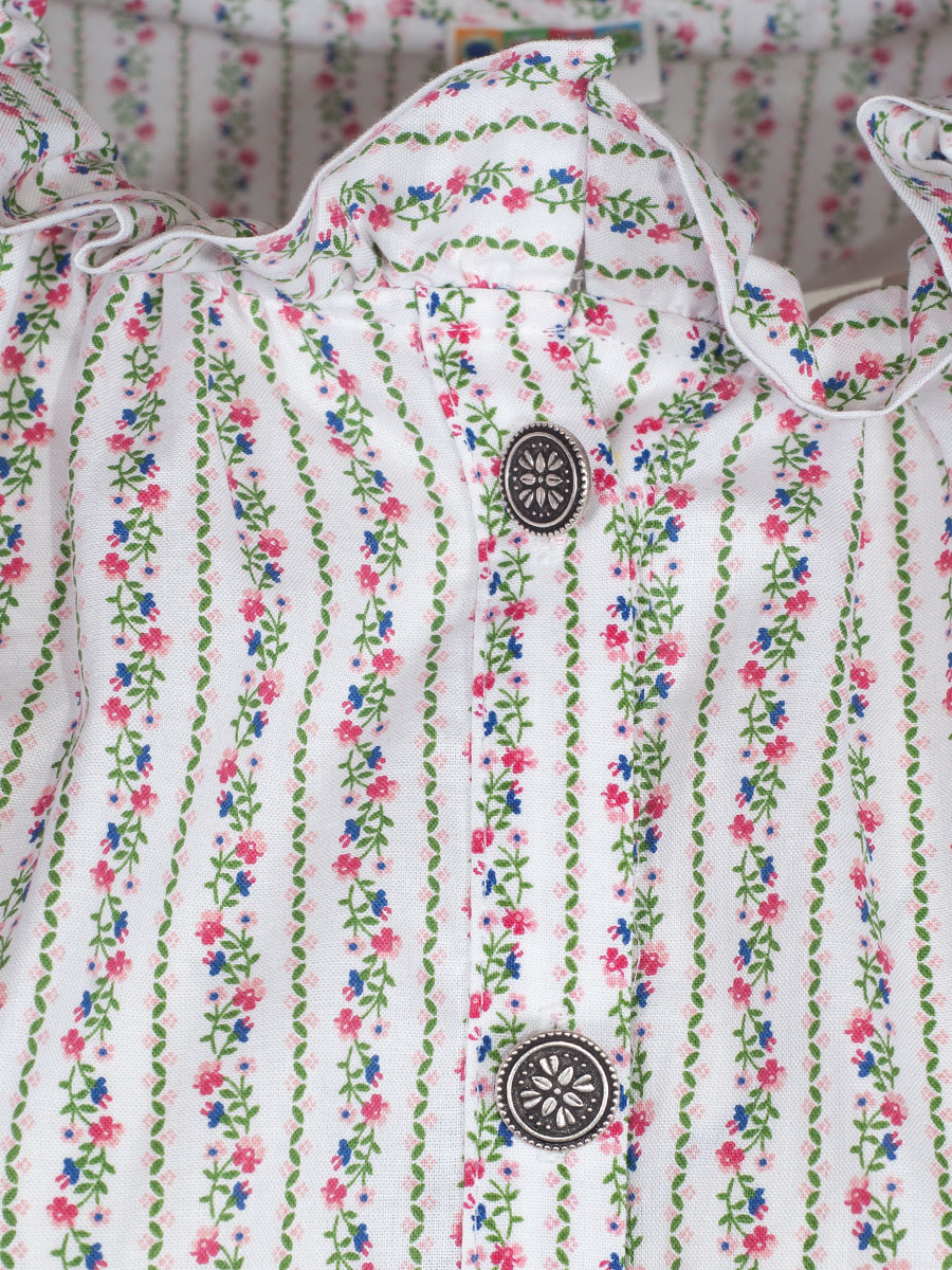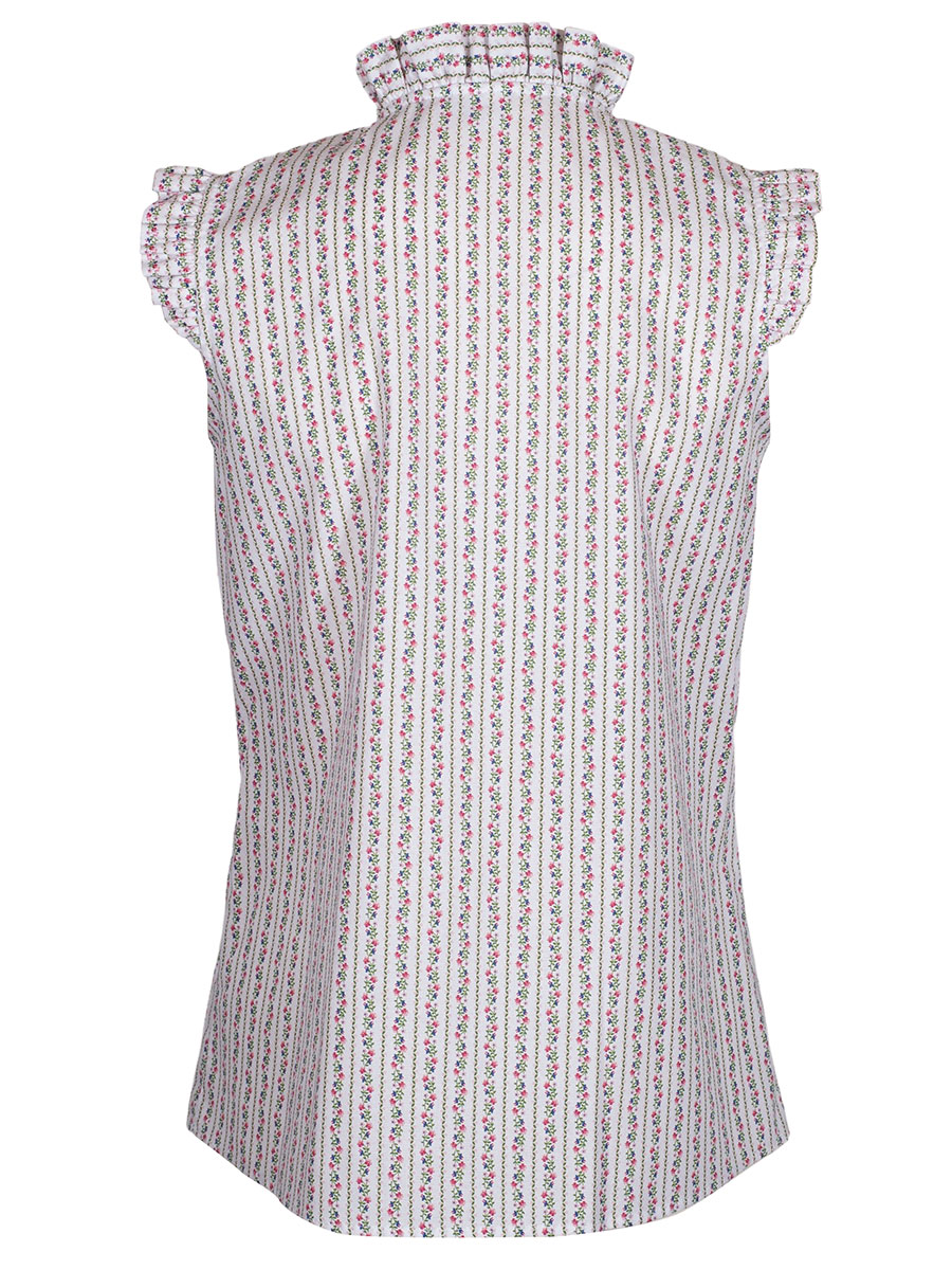 Geblümtes Sommertop mit Rüschenkragen der Firma Berwin & Wolff. Die ärmellose Bluse ist mit Blumenranken bedruckt und wird mit Perlmuttknöpfen geschlossen.