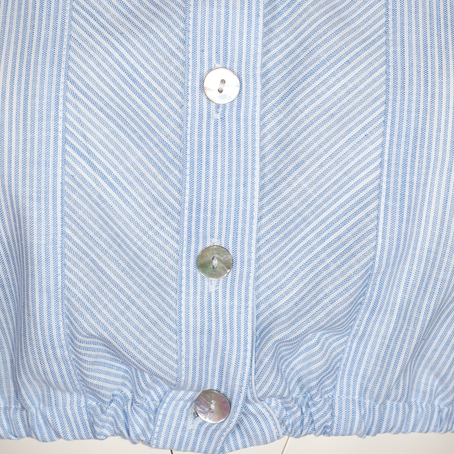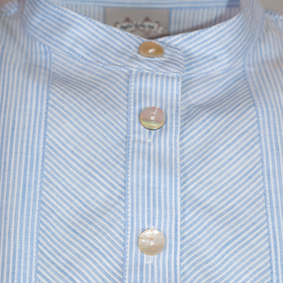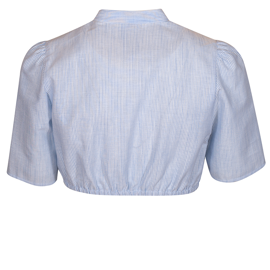 Hochgeschlossene Dirndlbluse mit kurzen Armen der Firma Berwin & Wolff. Die hellblaue Bluse ist fein gestreift und wird mit Perlmuttknöpfen geschlossen. Auf beiden Seiten der Knopfleiste verläuft das Streifenmuster schräg und gibt so der Bluse eine interessante Optik. Ein Gummizug sorgt für einen sicheren Sitz der Bluse.
