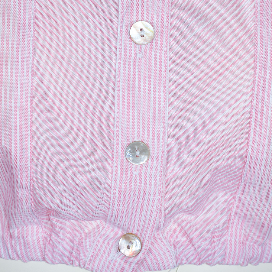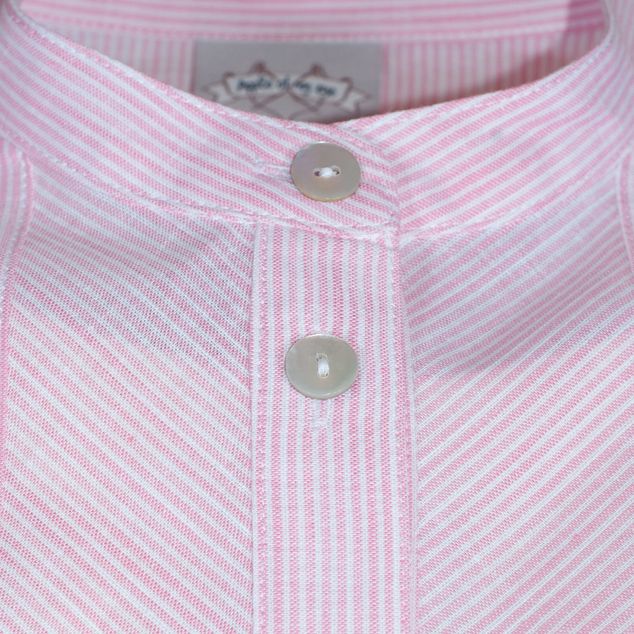 Hochgeschlossene Dirndlbluse mit kurzen Armen der Firma Berwin & Wolff. Die rosefarbene Bluse ist fein gestreift und wird mit Perlmuttknöpfen geschlossen. Auf beiden Seiten der Knopfleiste verläuft das Streifenmuster schräg und gibt so der Bluse eine interessante Optik. Ein Gummizug sorgt für einen sicheren Sitz der Bluse.
