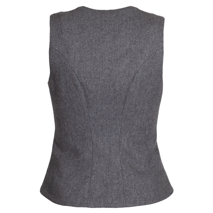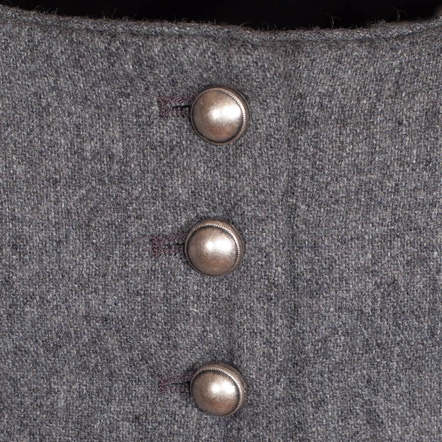 Schlichtes, hellgraues Lodenmieder der Firma Berwin & Wolff. Der Spenzer ist tailliert geschnitten und wird mit eher schlichten Kugelknöpfen geschlossen.