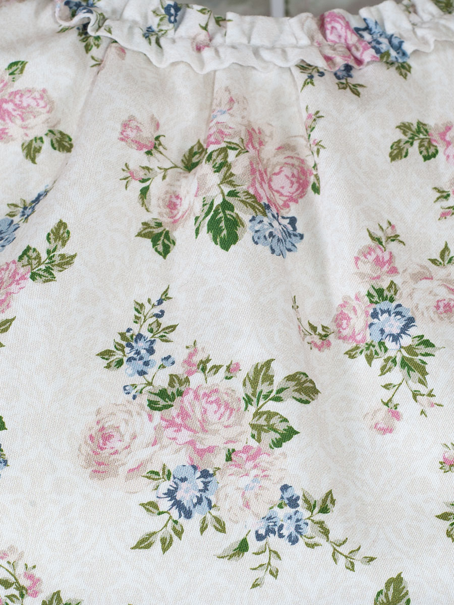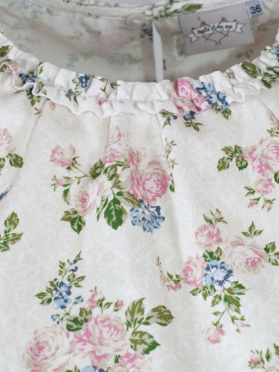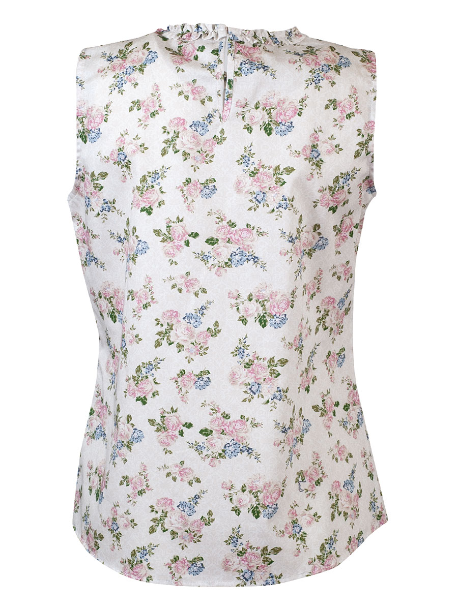Süßes, ärmellose Baumwoll-Blusentop der Firma Berwin & Wolff. Das Top ist mit rosa Blümchen gemustert und hat um den Ausschnitt herum niedliche Rüschen. Im Nacken wird das Oberteil mit einem Knopf geschlossen.