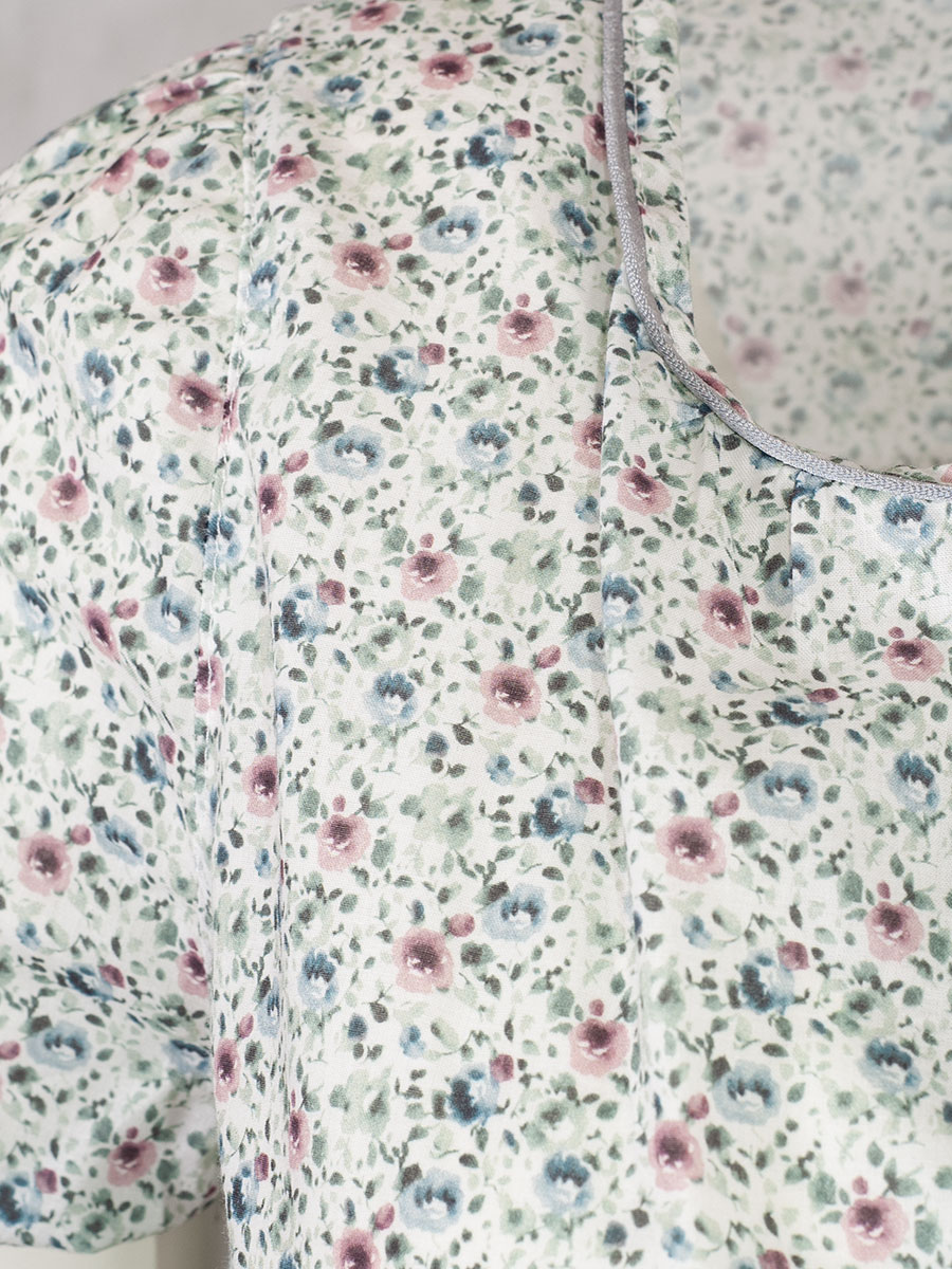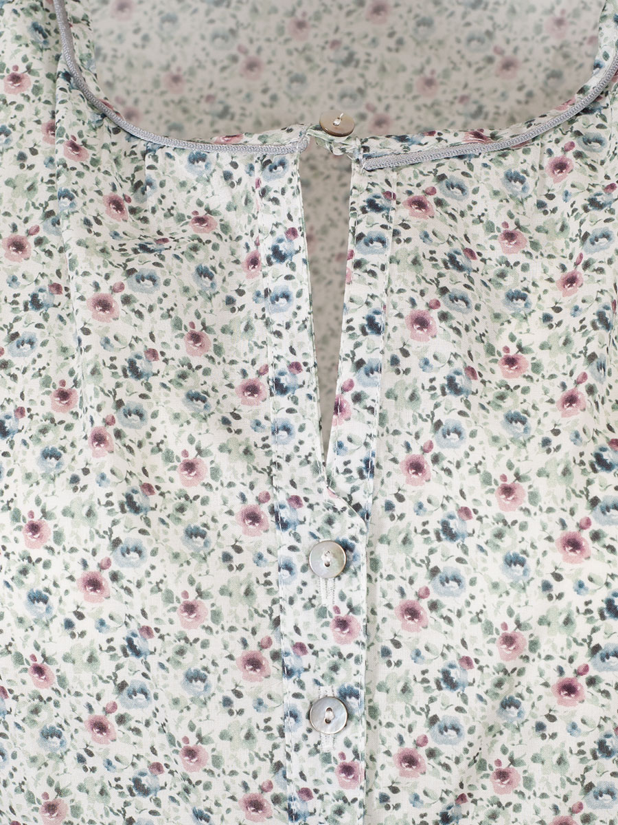 Luftig leichte Sommerbluse in creme mit rosa und blauem Blümchendruck. Die Kurzarmbluse ist durchgeknöpfe und wird mit Perlmuttknöpfen geschlossen. Auch am Ausschnitt befindet sich ein Knopf. Dieser ist zudem mit einer schmalen, grauen Borte verziert.