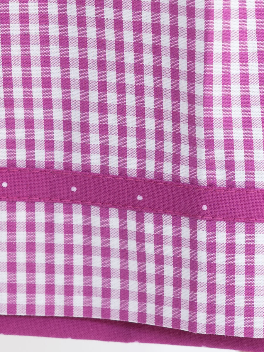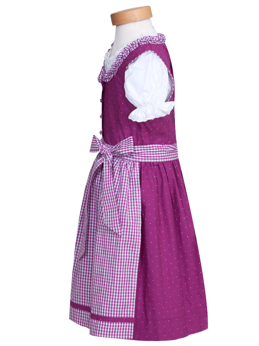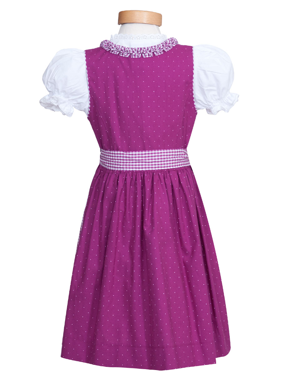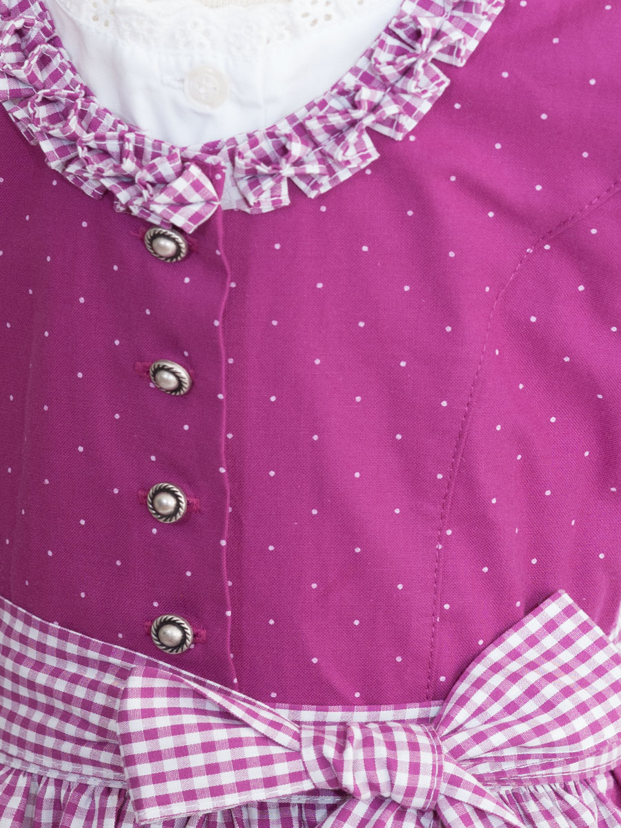 Fröhliches Kinderdirndl in Beere bedruckt mit rosa Tupfen. Der runde Ausschnitt ist mit Froschmäulchen in beere-weiß karierten Stoff verziert. Kleine Silberknöpfe schließen das Kleid. Die Schürze ist passend in beere-weiß kariertem Stoff genäht und wird am Abschluss mit einer Borte umrandet.