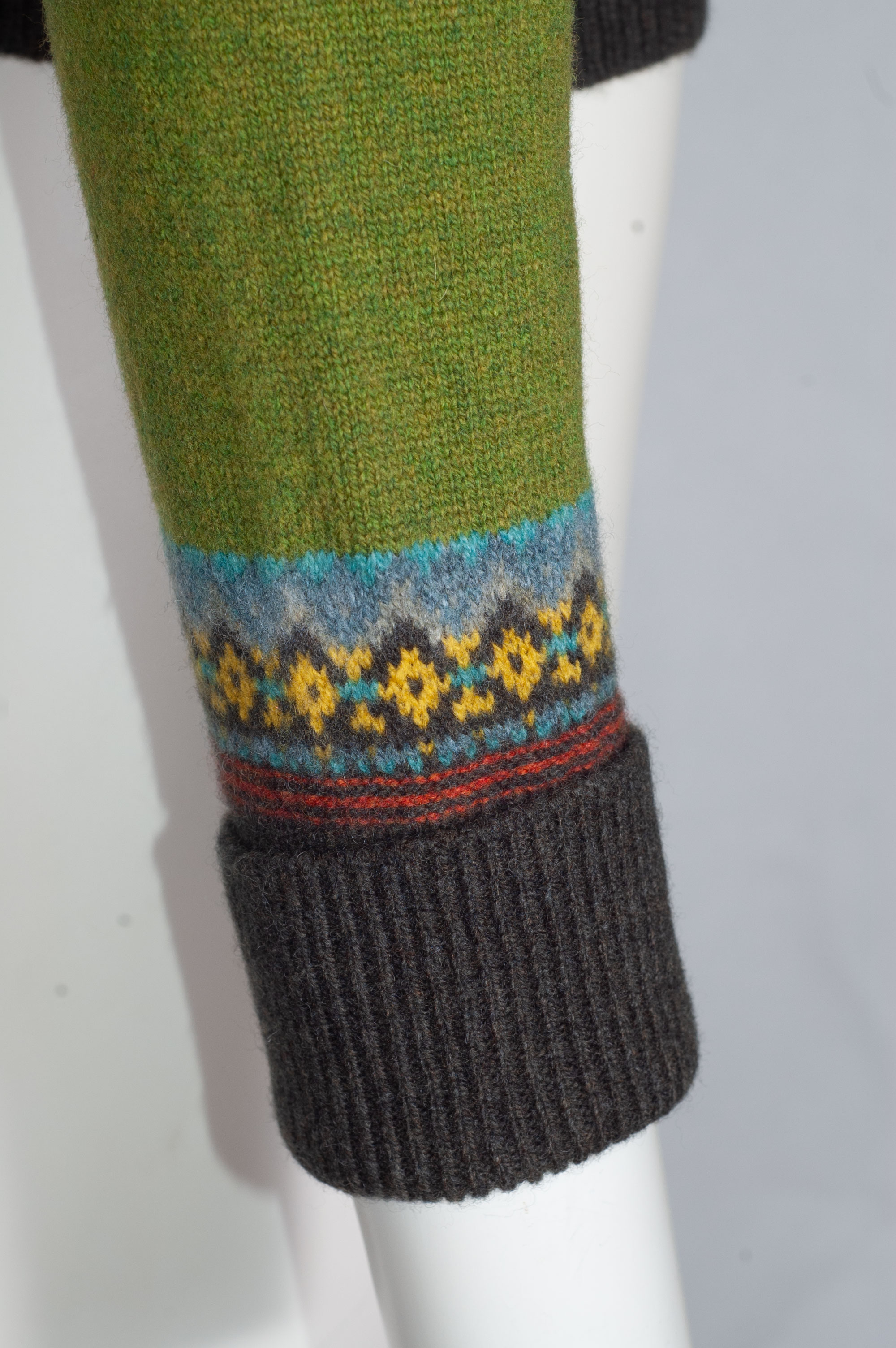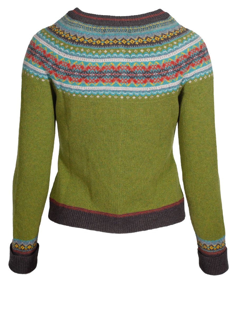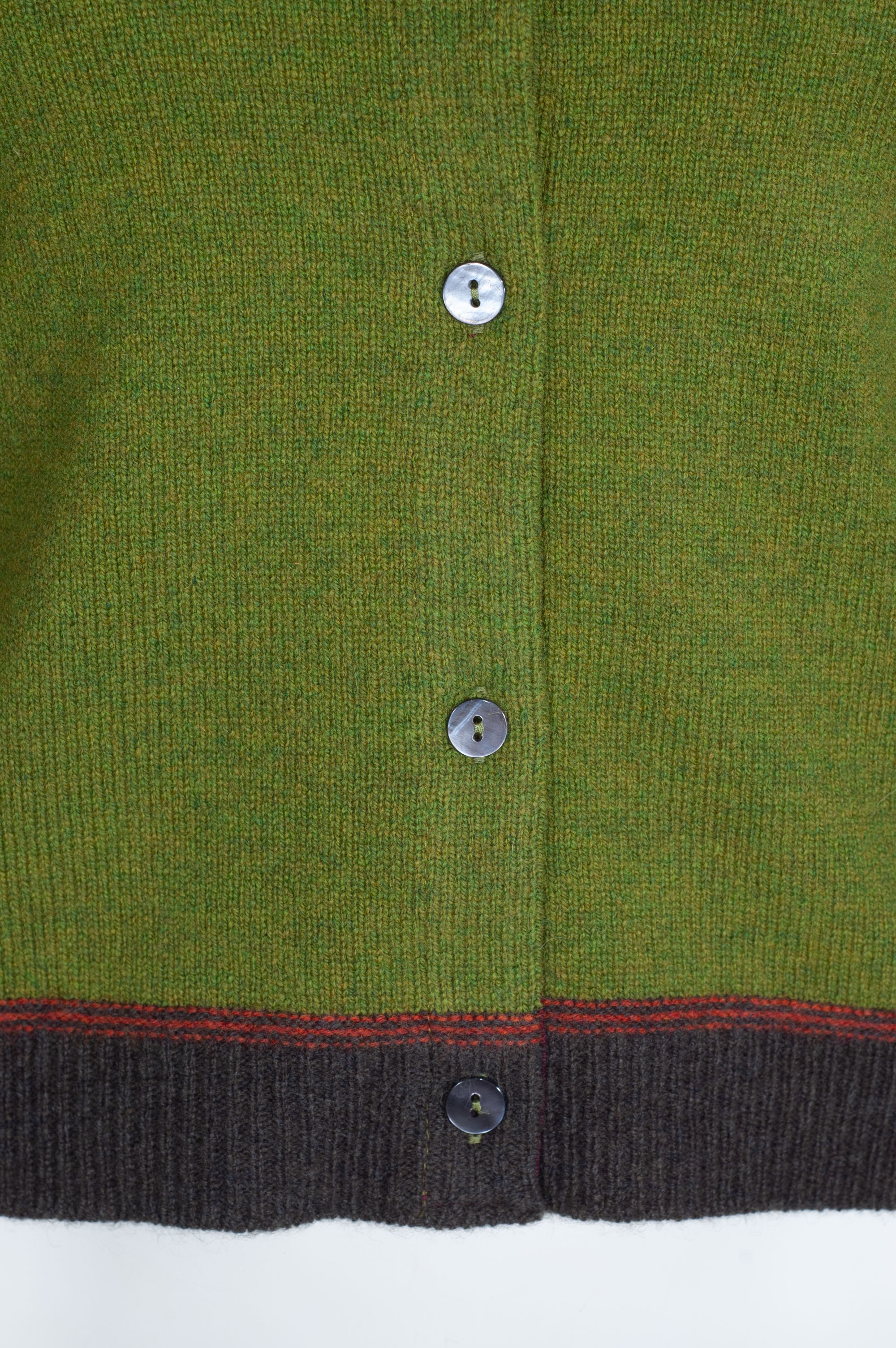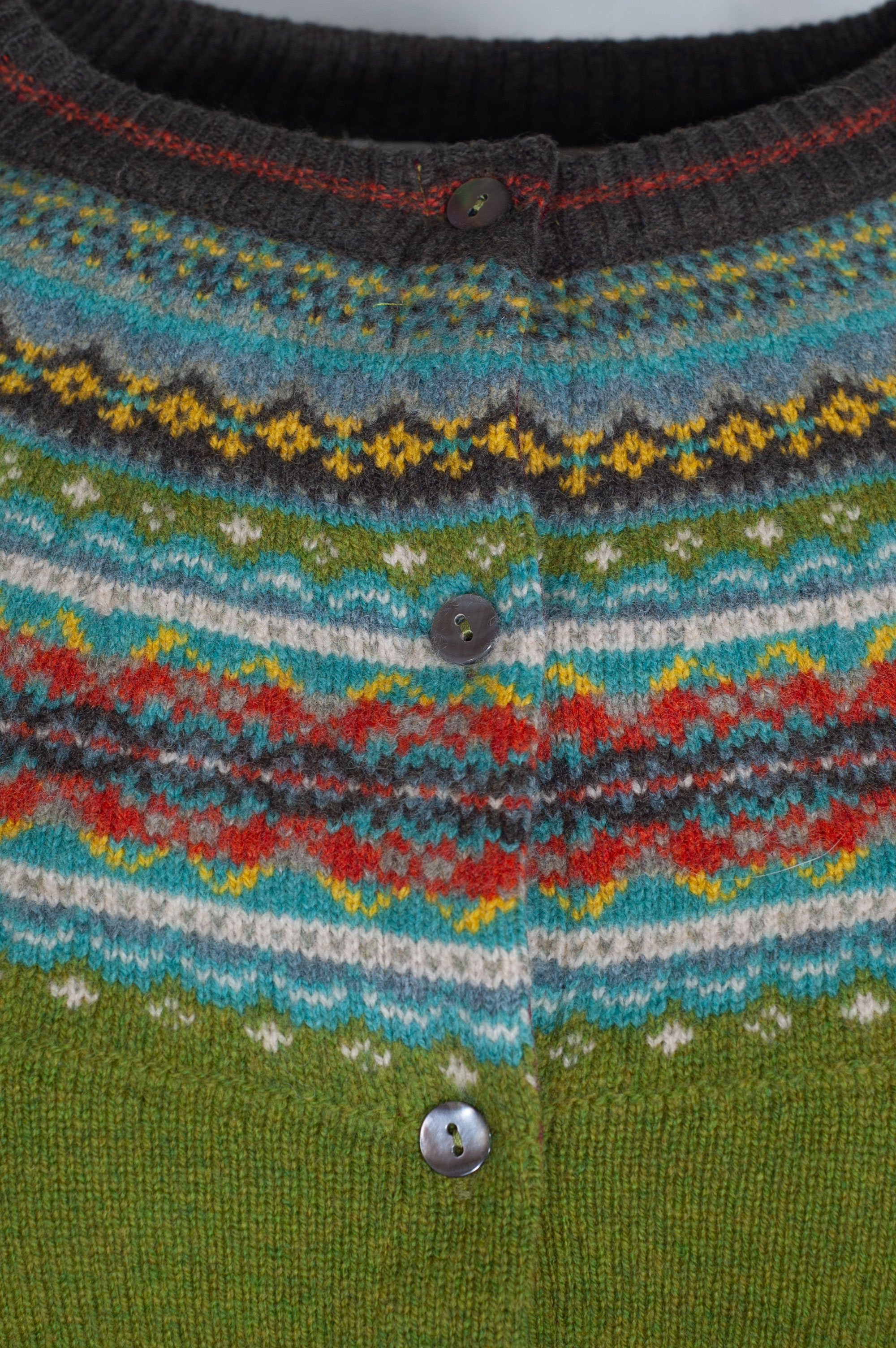 Zierlicher, kurzer Cardigan mit Tweedmuster-Detail nur an den Schultern, ideal für alle zierlichen und kleinen Kunden. Diese Strickjacke aus Lammwolle der Firma Eribè Knitwear verfügt über eine aufwendig bunt gemusterten Schulterbereich, der Bund ist mit einem grau-roten Abschluss abgehoben. Die moosgrüne Jacke ist ganz im alpinen Style gefertigt. Die weiche Lammwolle macht diese Damenjacke garantiert zu Ihrem Lieblingsstück. Geschlossen wird sie mit Perlmuttknöpfen. Die graubraunen Armabschlüsse sind umgeschlagen und auch hier findet sich das bunte Muster wieder.