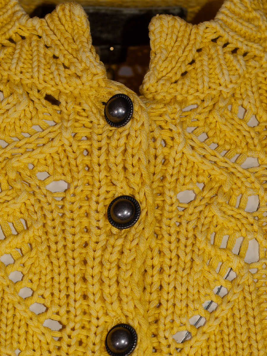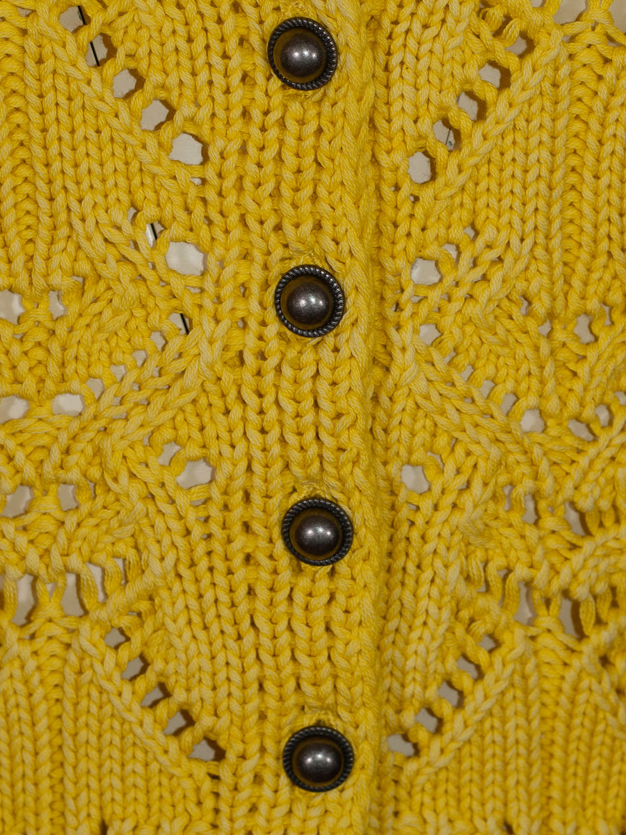 fei scho schee Strickjacke, gelb, grobes Häkelmuster, kurz