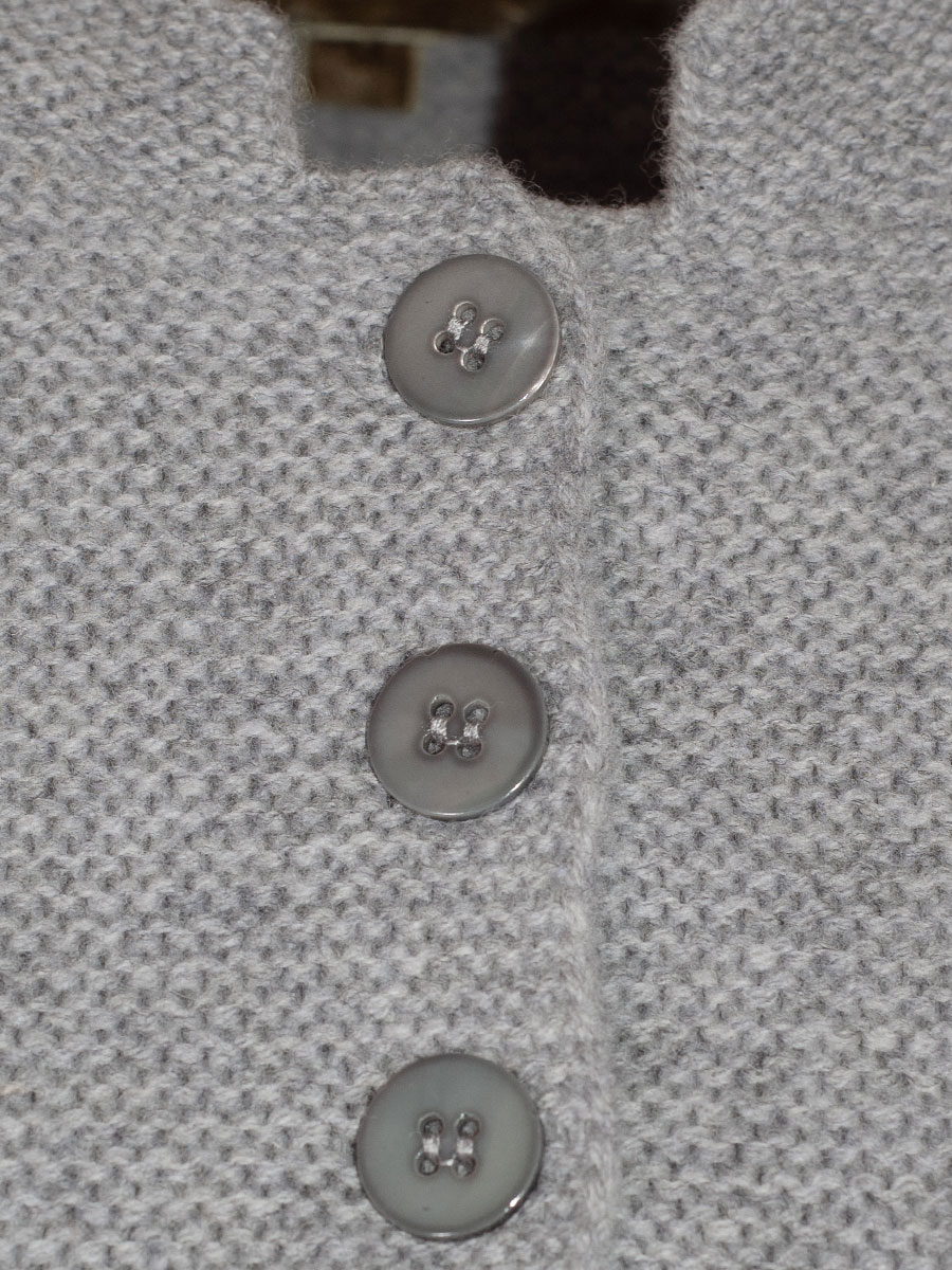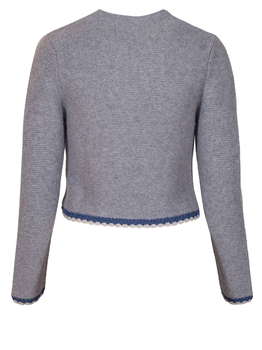 Kurze, hochwertige Damenstrickjacke in Hellgrau der Firma fei scho schee. Die Damenstrickjacke hat einen blau-beigen Häkelrand und wird mit Perlmuttknöpfen geschlossen. Ideal für Dirndl.