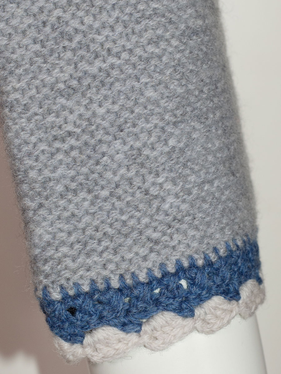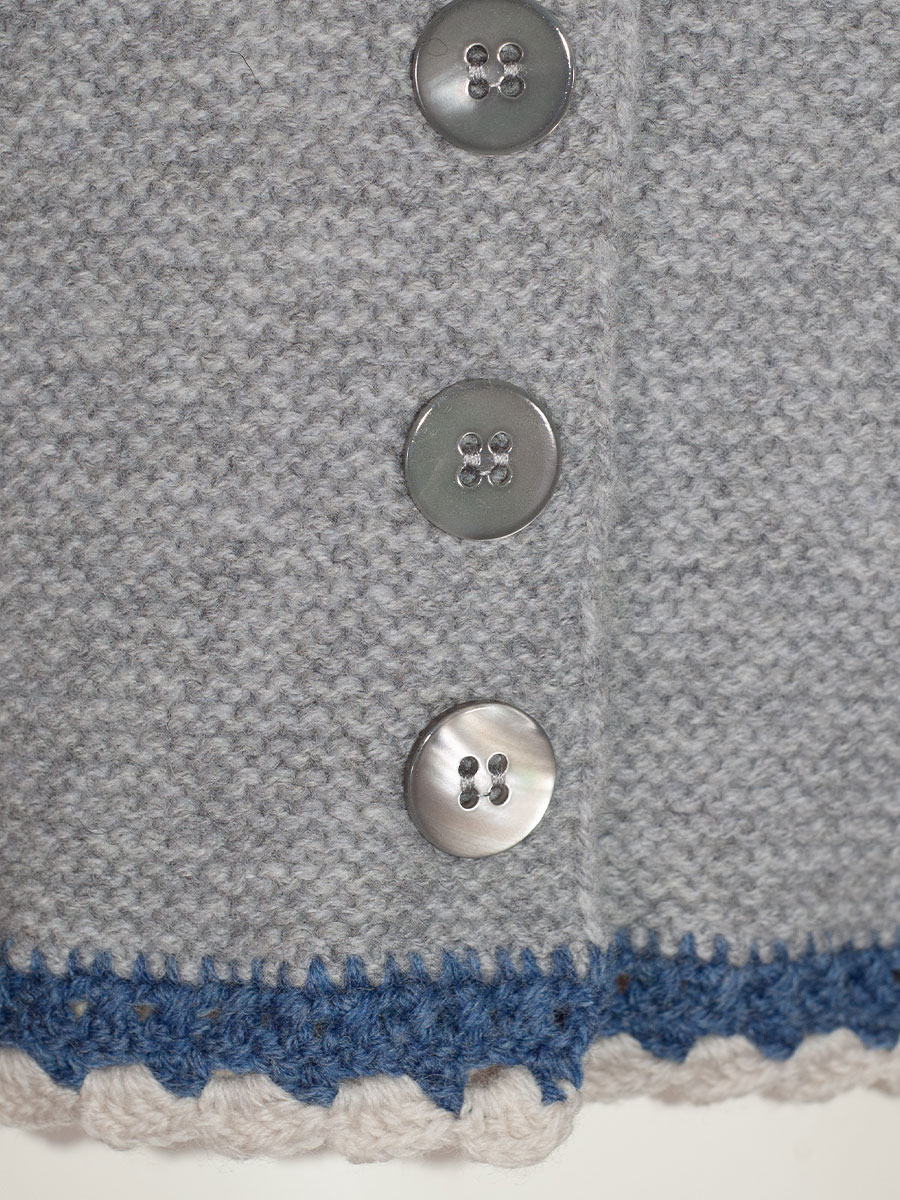 fei scho schee Strickjacke, hellgrau, Häkelrand in blau-beige, kurz