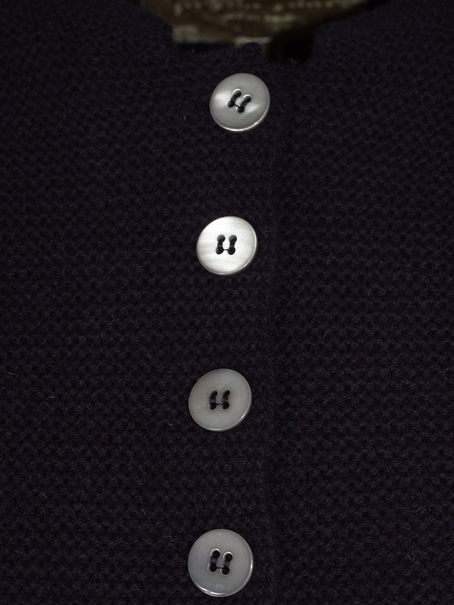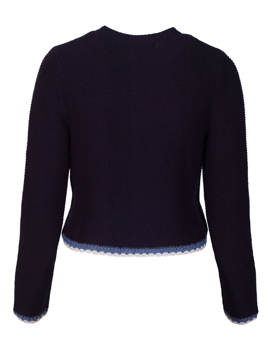 Kurze, hochwertige Damenstrickjacke in Marineblau der Firma fei scho schee. Die Damenstrickjacke hat einen hellblau-weißen Häkelrand und wird mit Perlmuttknöpfen geschlossen. Ideal für Dirndl.