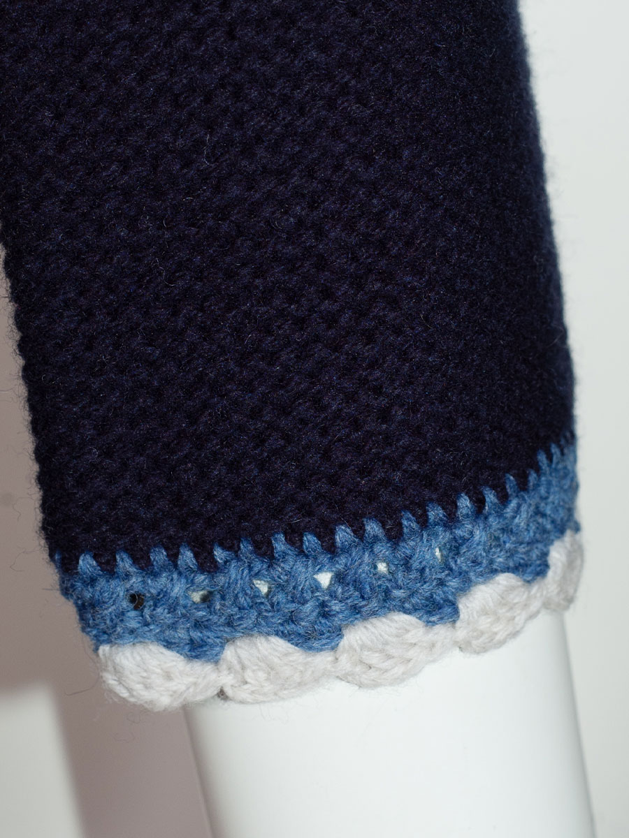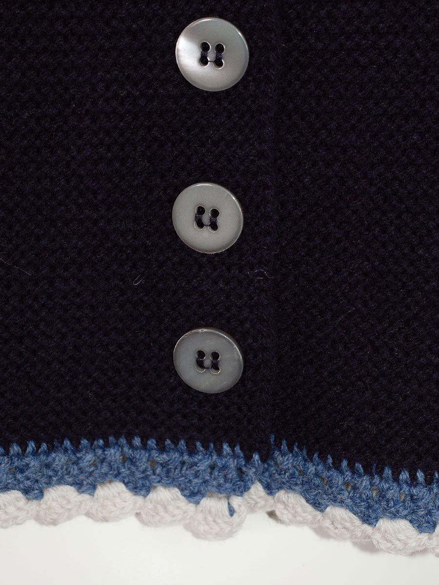 fei scho schee Strickjacke, marineblau, Häkelrand in hellblau-weiß, kurz