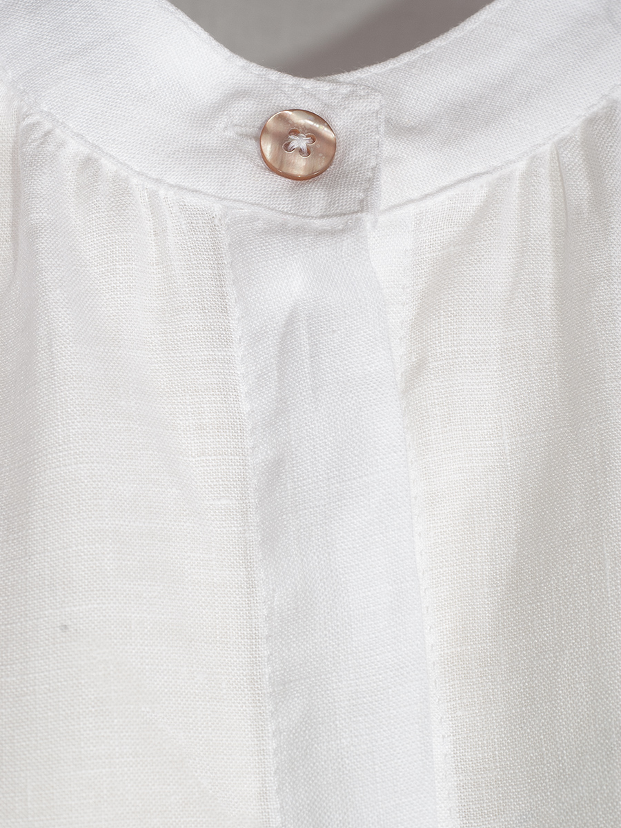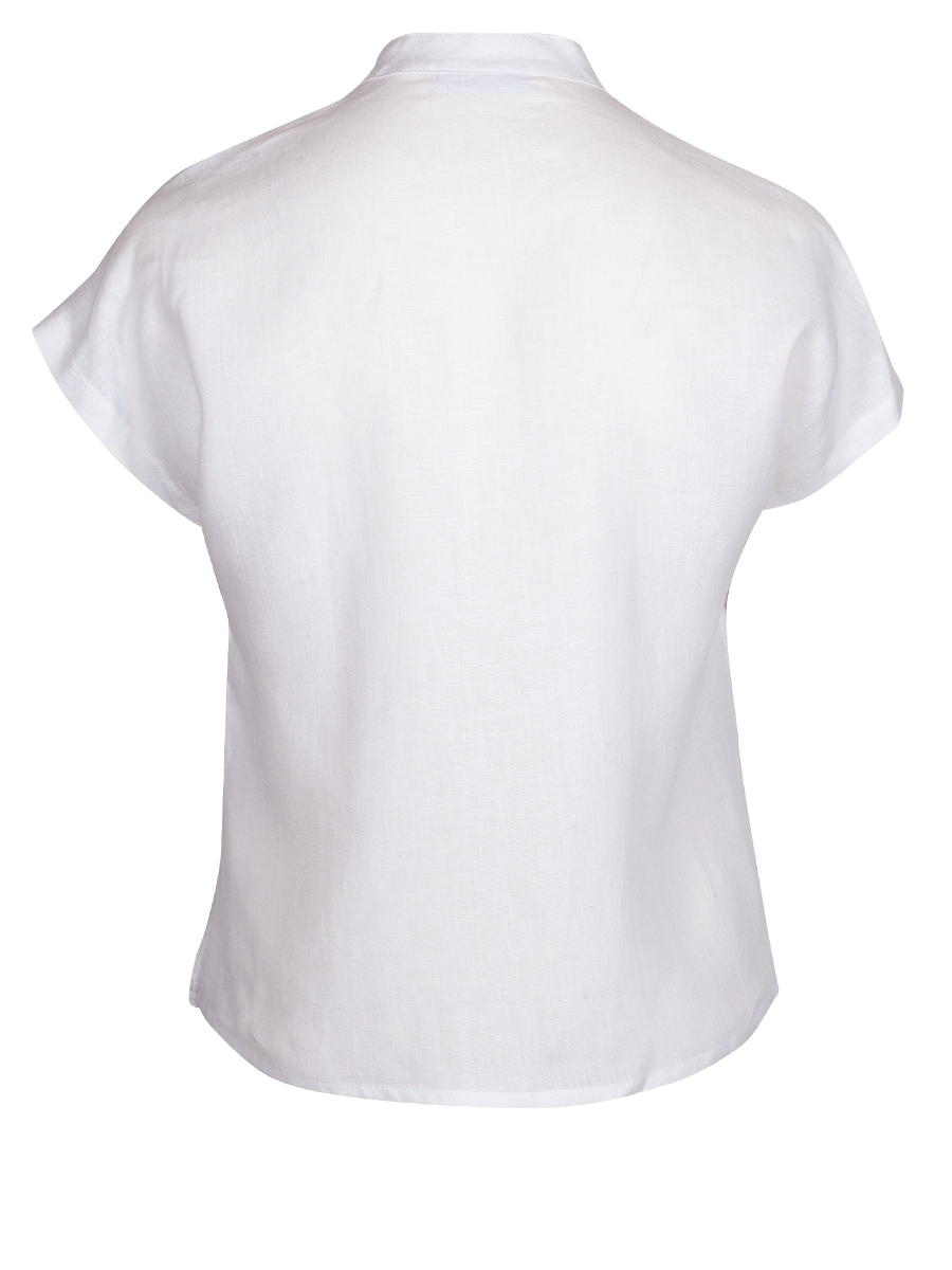 Locker geschnittene Leinenbluse Baltrun mit kurzen Ärmel aus der Kollektion Feli und Hans. Die weiße Damenbluse hat eine verdeckte Knopfleiste und einen kleinen Stehkragen. Die Bluse ist am Kragen leicht gerafft angenäht.