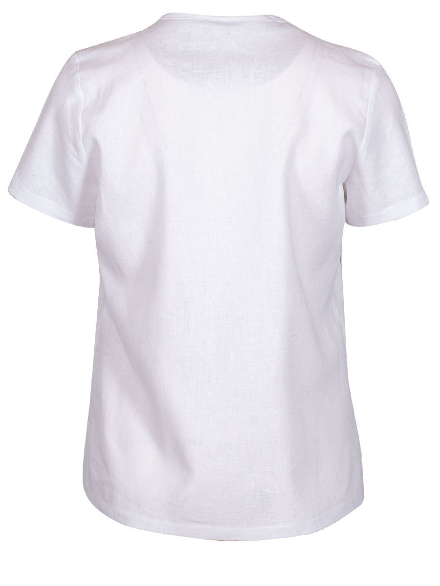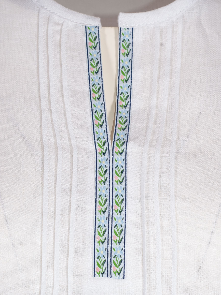 Sommerliches Shirt aus der Kollektion Felicitas von Feli und Hans. Das Damenshirt hat einen Rundhals mit V-Ausschnitt, welcher von einer blau-grünen Blümchenborte verziert ist. Neben dem Ausschnitt verlaufen schmale Falten. Die Vorderseite des Shirts ist aus angenehmen Leinen und die Rückseite aus Shirt-Stoff.