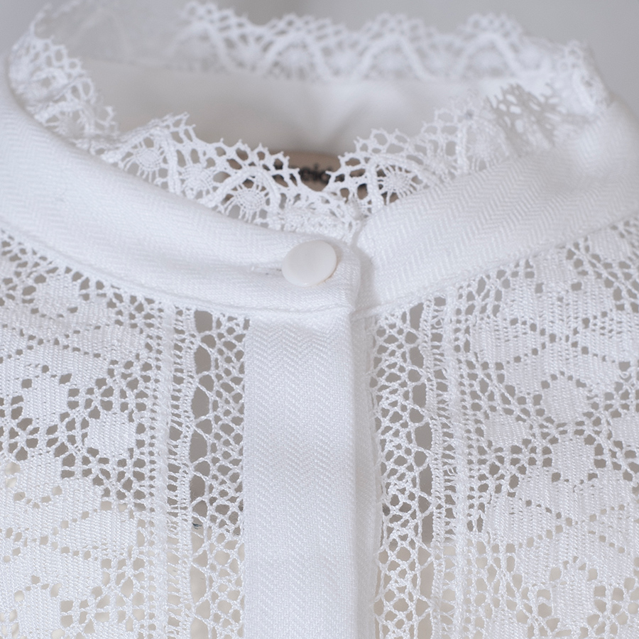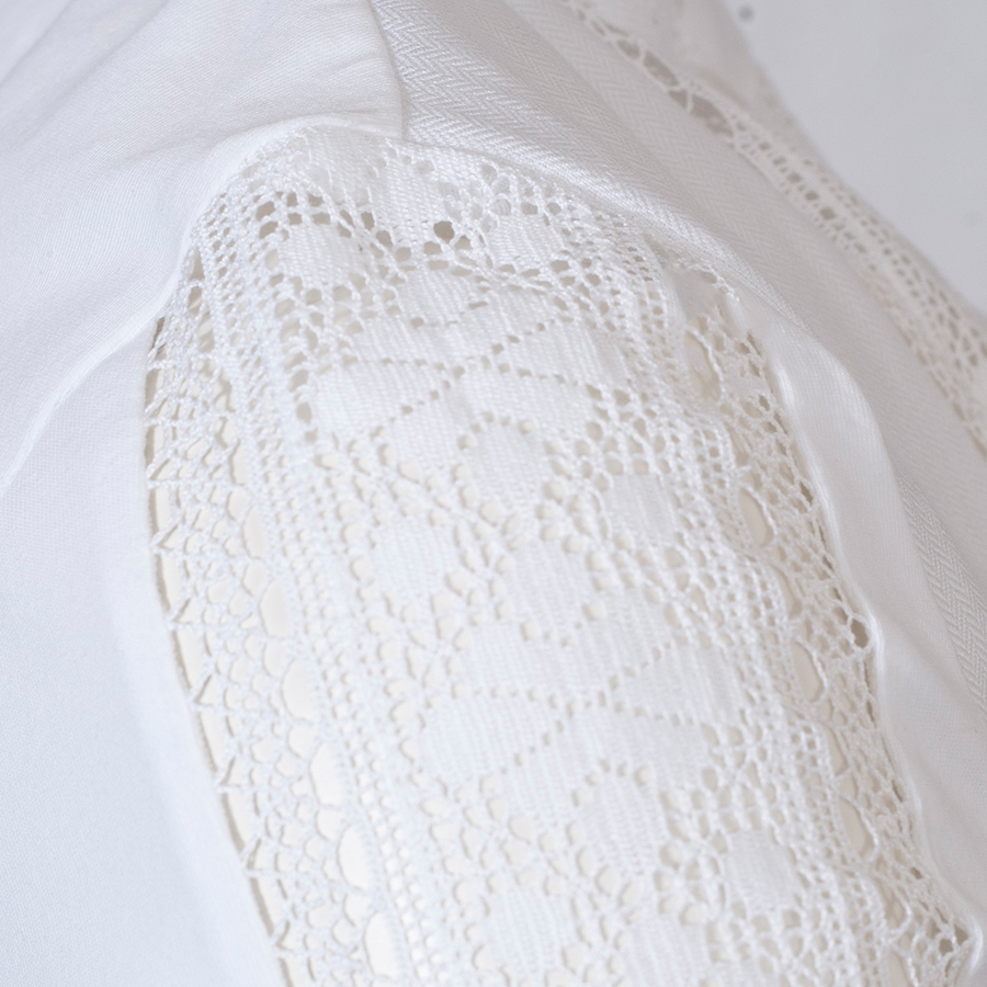 Elegante, weiße Leinen-Dirndlbluse der Qualitätsfirma Gottseidank. Die weiße Halbarm-Bluse und hat eine wunderschöne Vorderseite und Arme aus Spitze. Die Armabschlüsse sind aufwendig mit Biesen und Spitzen verarbeitet. Der Rücken der Dirndlbluse und die Innenseite der Arme sind aus elasthischem Jerseystoff. Die Bluse hat unterhalb der Brust einen Gummizug und zwei Bändchen, um die Bluse nach unten zu ziehen. Die Knopfleiste der Stretchbluse ist verdeckt.