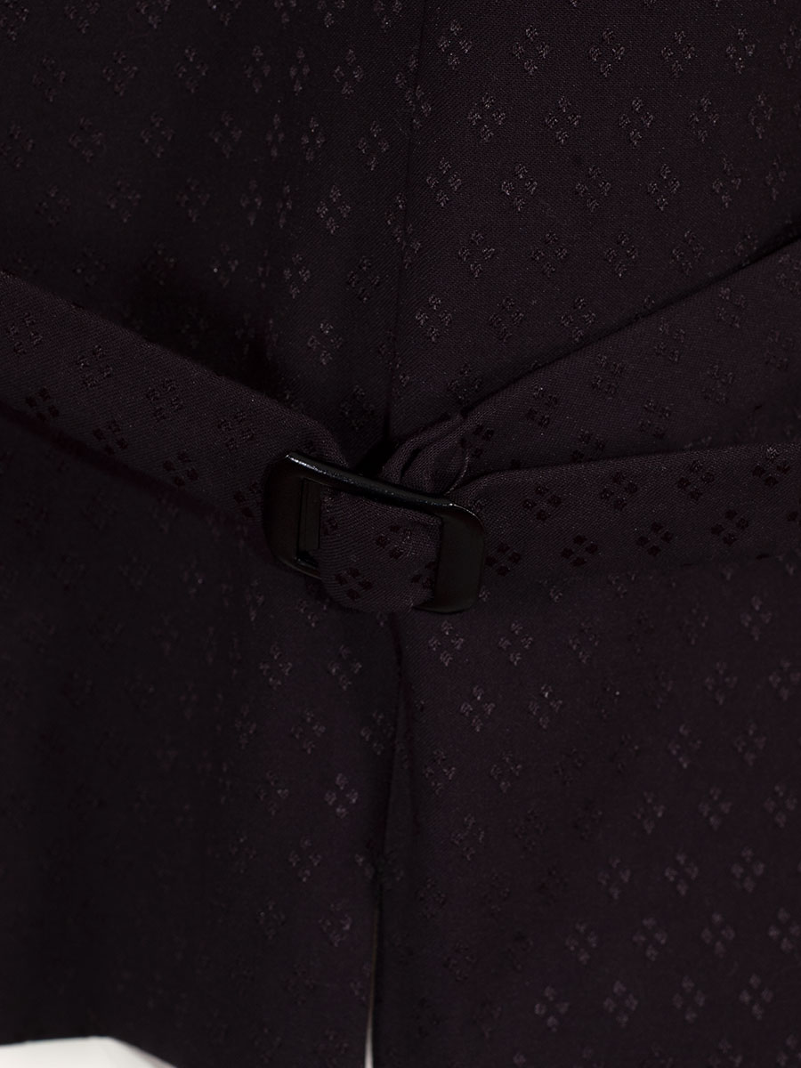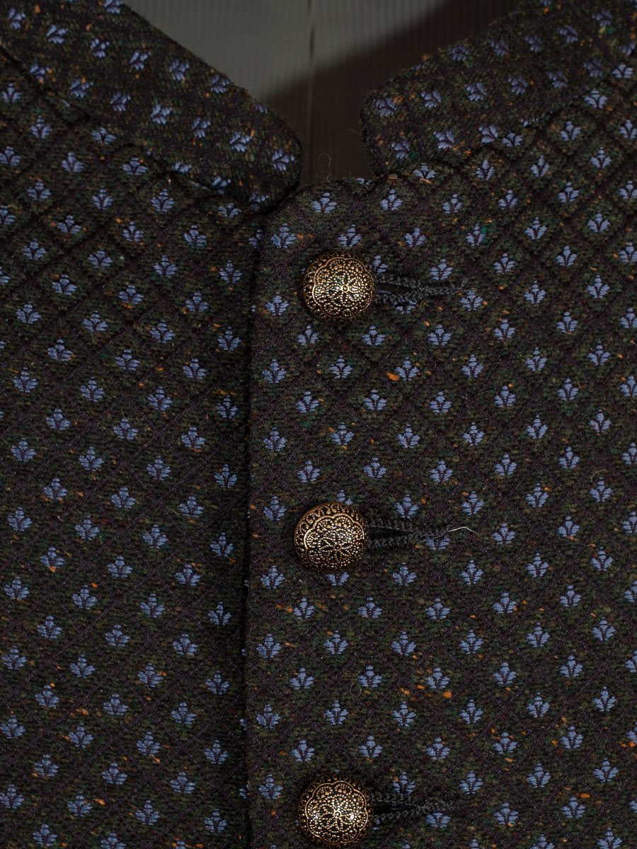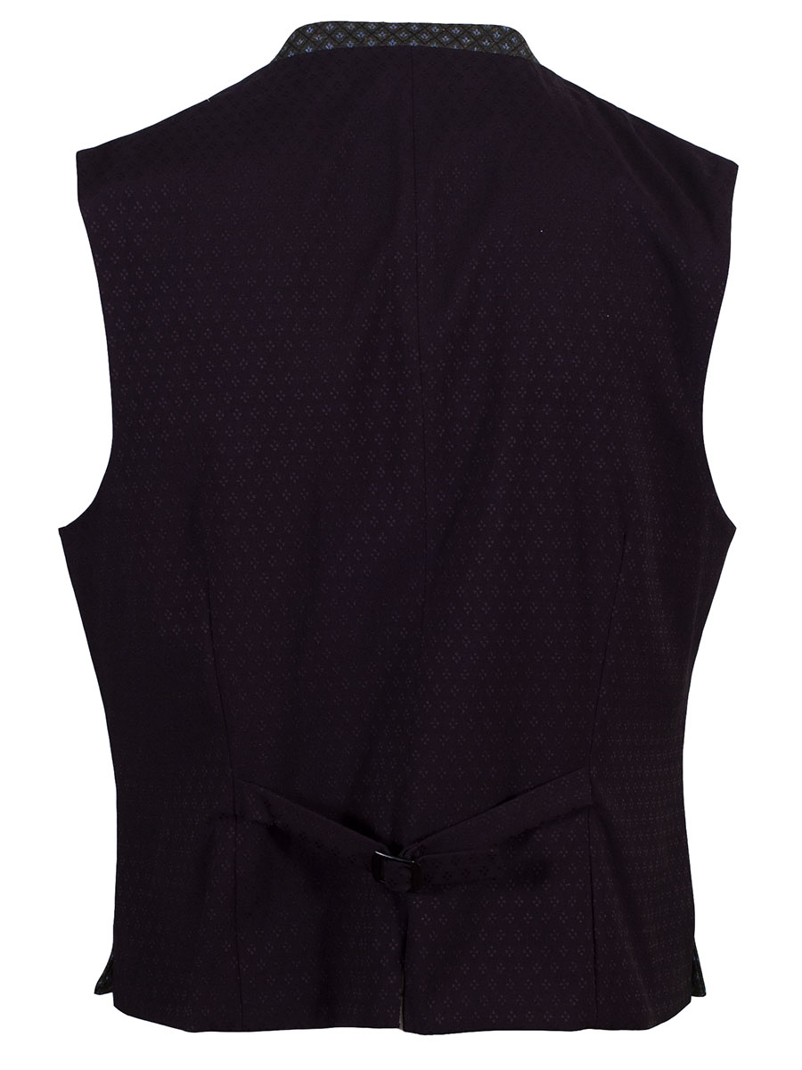 Elegante, tannengrüne Stretch-Herrenweste mit einer blau gemusterten gewebten Vorderseite. Der schwarze Rücken der hochgeschlossenen Weste ist leicht gemustert und hat einen Riegel zum Verstellen der Weite. Die Trachtenweste hat 3 Taschen und wird mit Kugelknöpfen geschlossen.