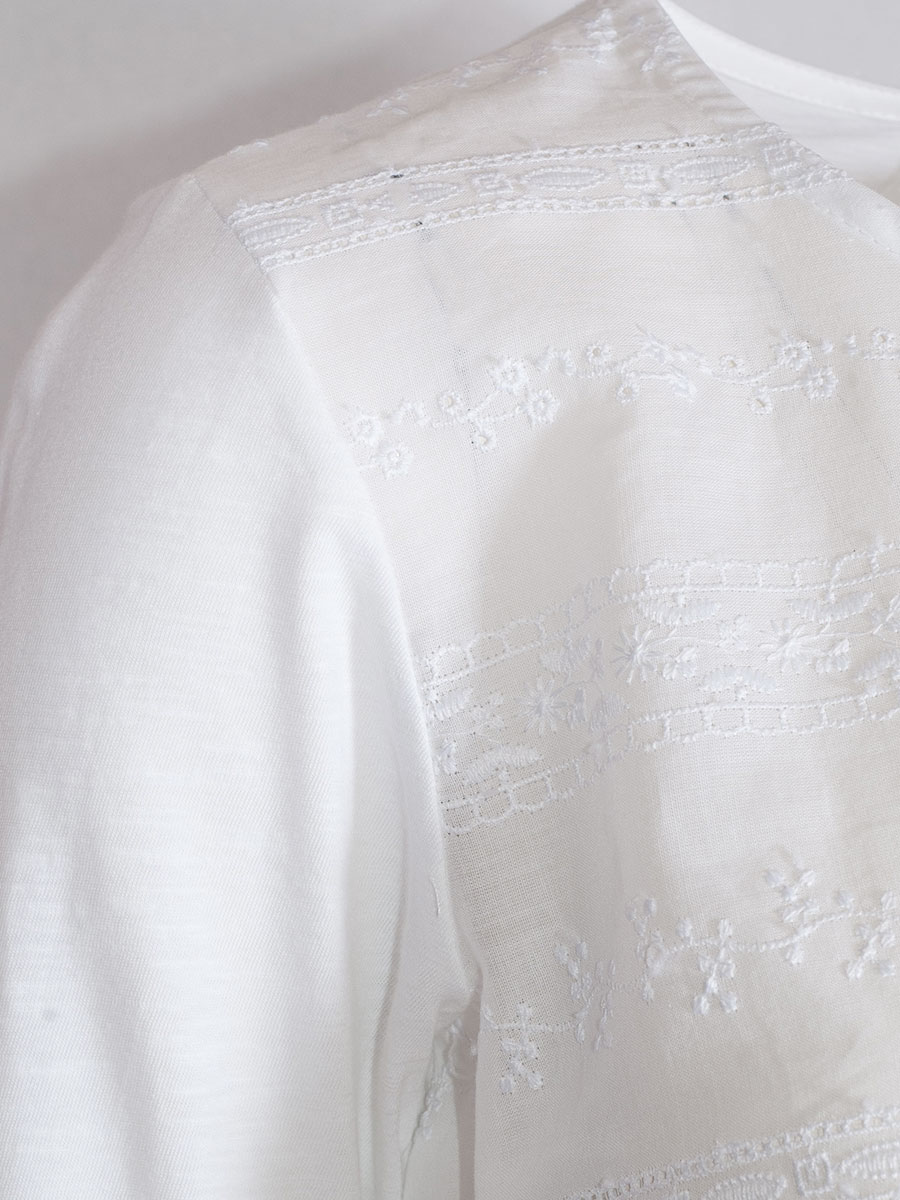 Langarm Blusenshirt in weiß der Firma Hammerschmid mit Rundhals. Die Bluse ist auf der Vorderseite mit Lochmuster und feinen Blumen-Stickereien verziert. Für die langen Arme und den Rücken wurde Shirtstoff verwendet. Die Shirtbluse kann wunderbar zum Rock oder zur Hose getragen werden.