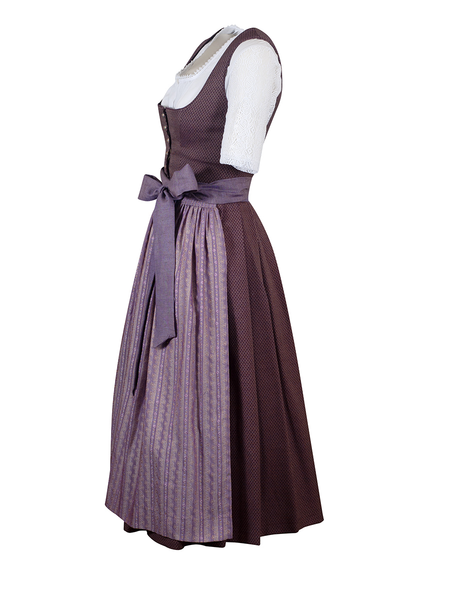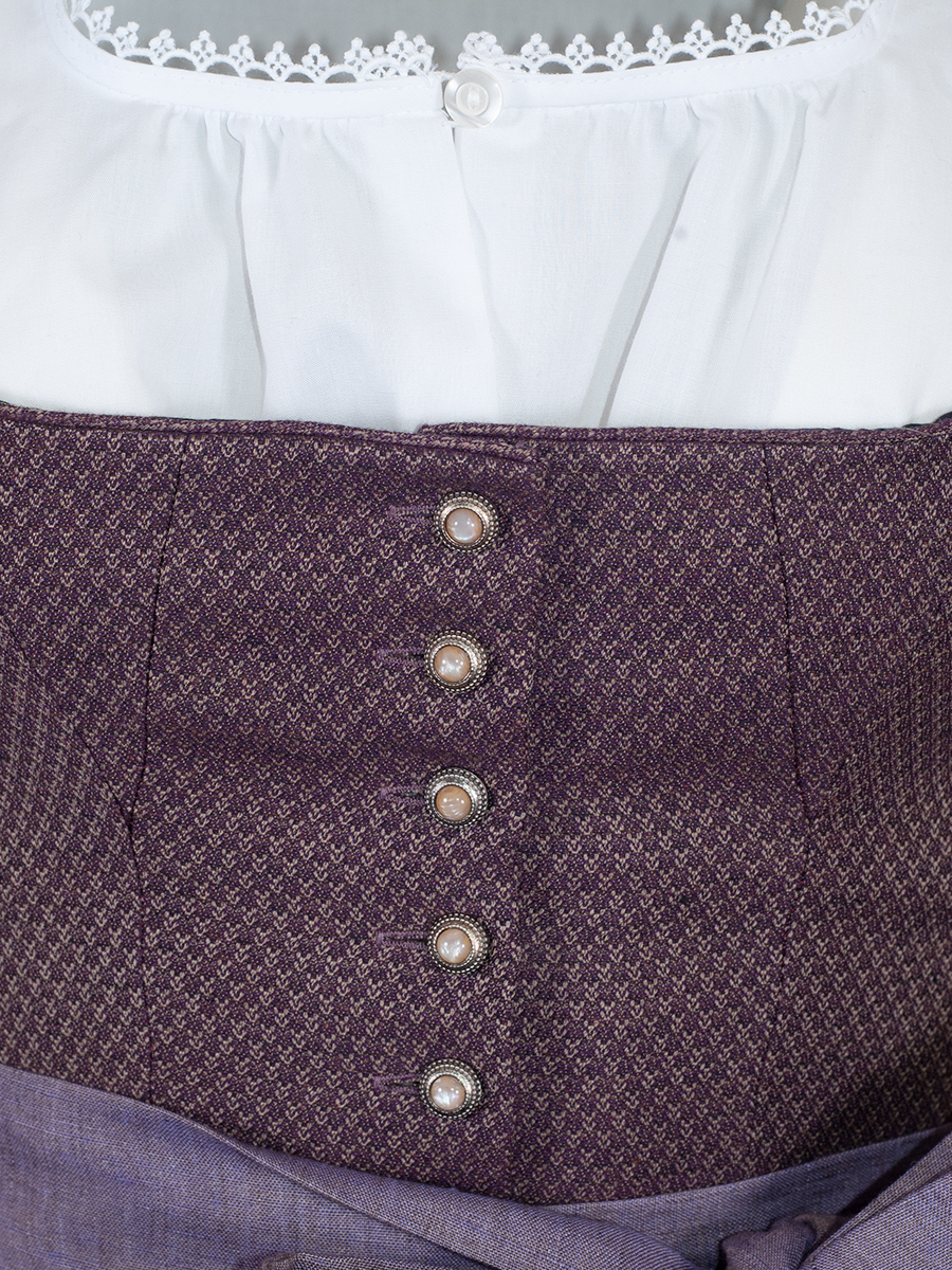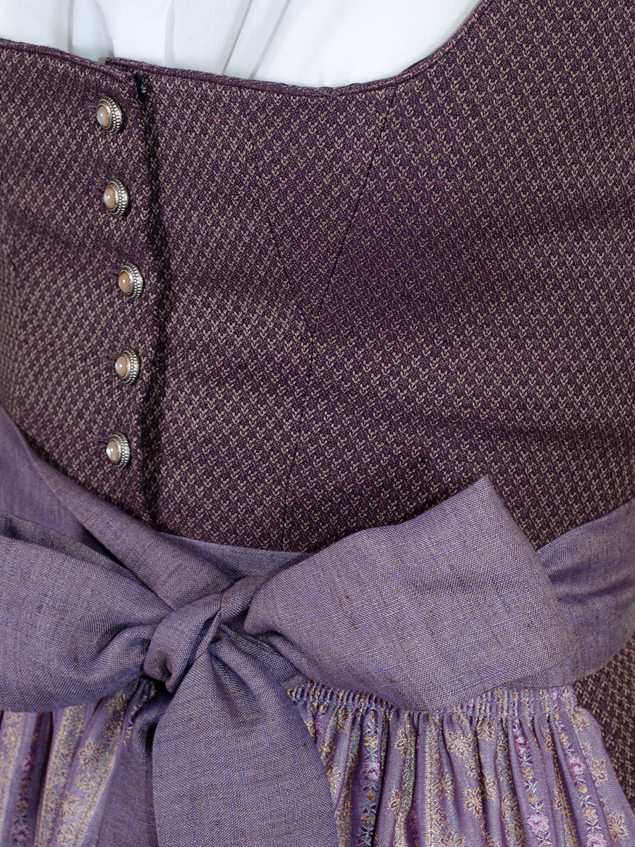 Festliches Dirndlkleid in lila mit einer farblich passenden flieder-beige gewebten Schürze. Diese hat ein fliederfarbenes Schürzenband aus Leinen. Das Dirndlkleid ist aus einem etwas festeren lila-beige gewebten Stoff und hat einen abgerundeten Ausschnitt. Die Knöpfe haben in der Mitte einen beigefarbenen Stein und sind silberfarben eingefasst. Ein wunderschönes herbstliches Dirndl für viele festliche Anlässe.