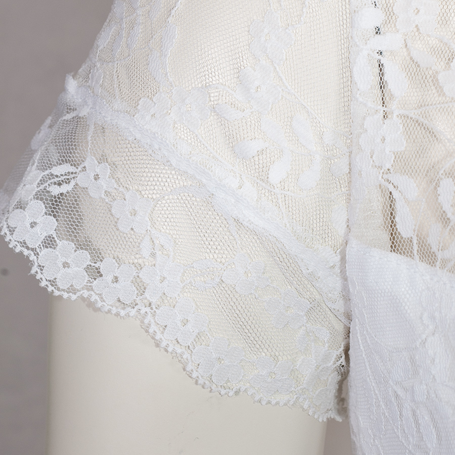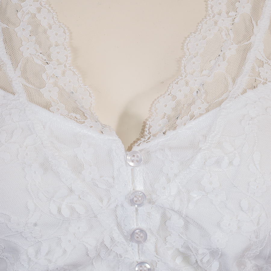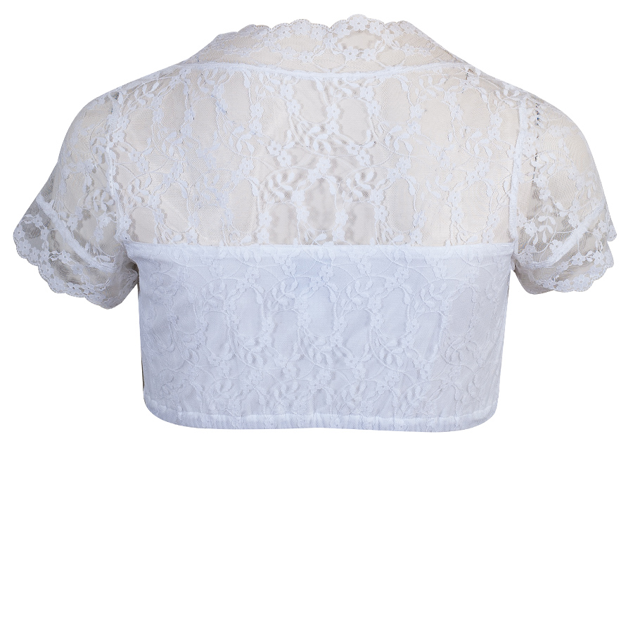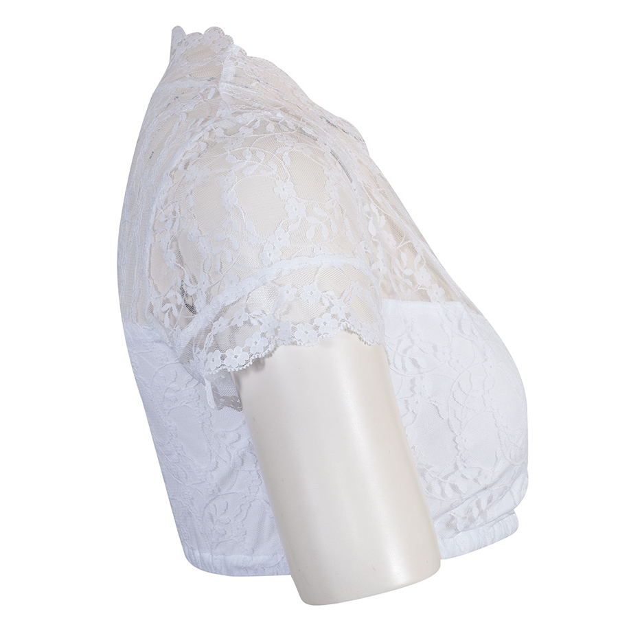 Sommerliche Dirndlbluse aus feiner, leichter Spitze mit kurzen Armen und V-Ausschnitt. Der dünne Spitzenstoff ist am Dekoltee und zur Hälfte am Rücken mit einem elastischen Baumwollstoff unterlegt. So dass die Bluse hier blickdicht ist. Die Bluse hat einen kleinen Spitzenkragen. Eine Gummizug sorgt für einen rutschfesten Sitz.