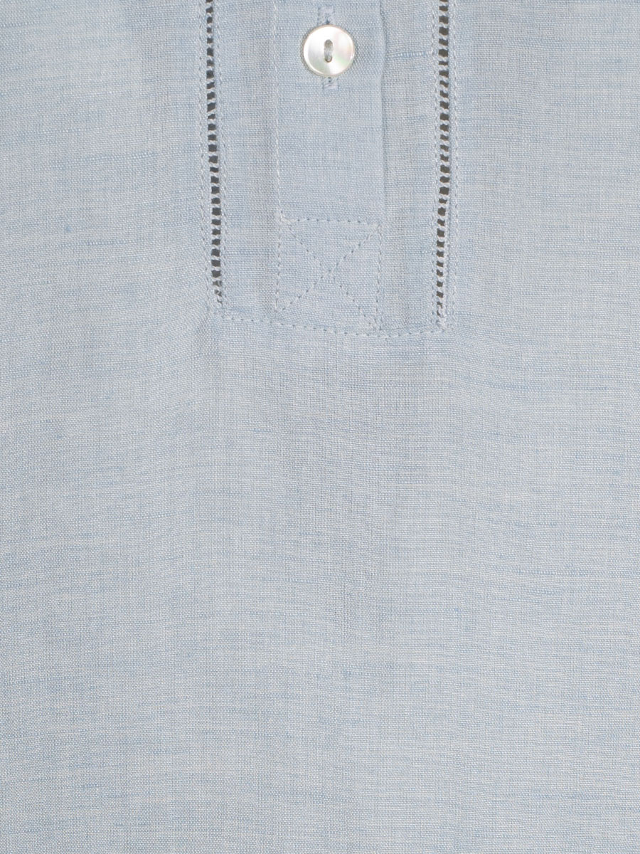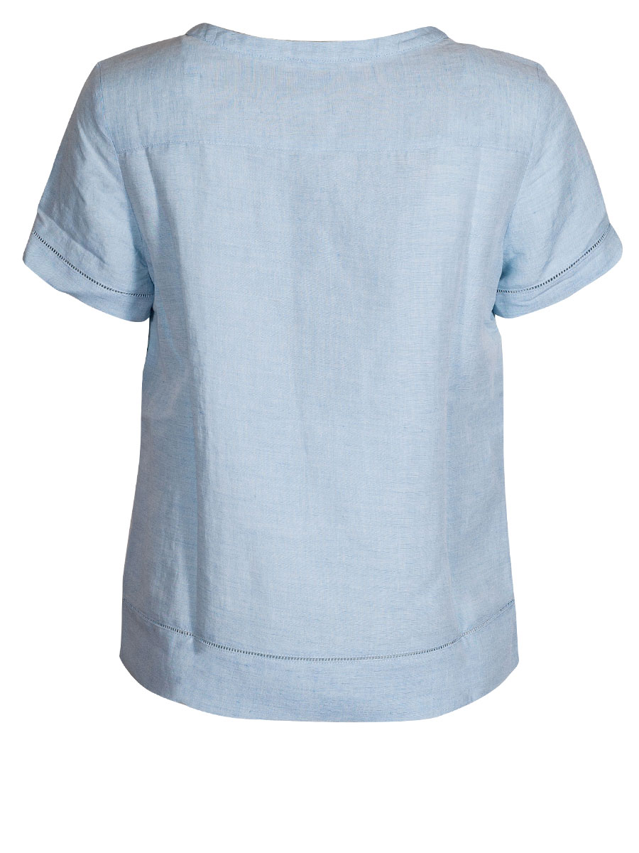 Sommerliche Kurzarmbluse der Firma Hammerschmid aus einem leichtem Leinenmix. Die hellblaue Damenbluse hat feine Lochborten neben der kurzen Knopfleiste, am Körperabschluss und an den Armabschlüssen.