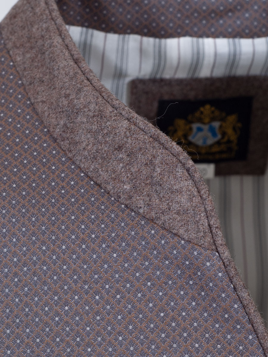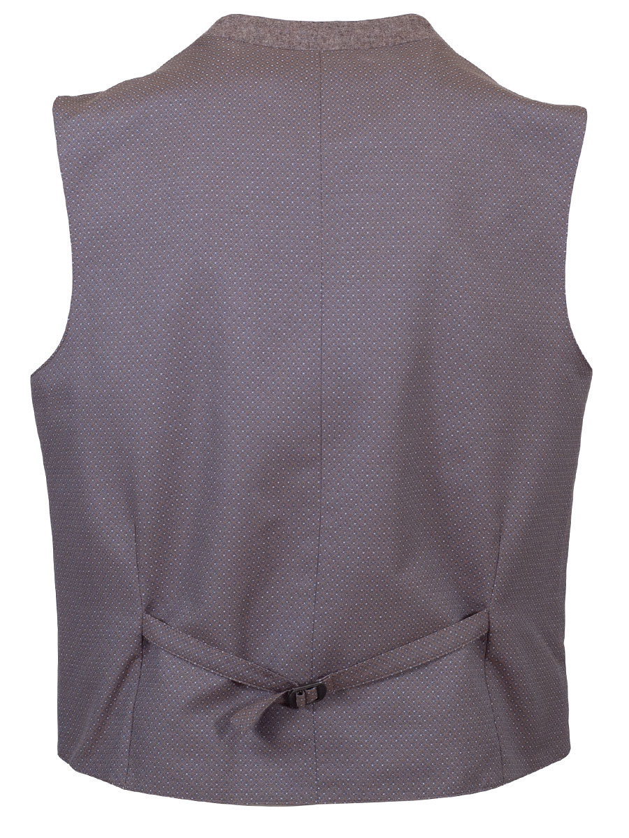 .Elegante Herrenweste der Qualitätsfirma Hammerschmid. Die Vorderseite der Trachtenweste ist in einem grau-braunen Rauthenmuster gewebt und wird mit gemusterten Knöpfen geschlossen. Passend zum braunen Lodenkragen sind die drei Taschen und die Knopfleiste braun paspoliert. Die Weste hat einen dezenten V-Ausschnitt. Der Rücken ist ebenfalls grau-braun und hat einen Riegel zum Verstellen der Weite.