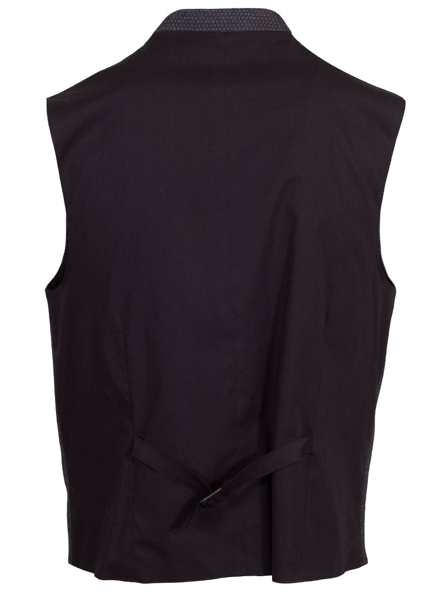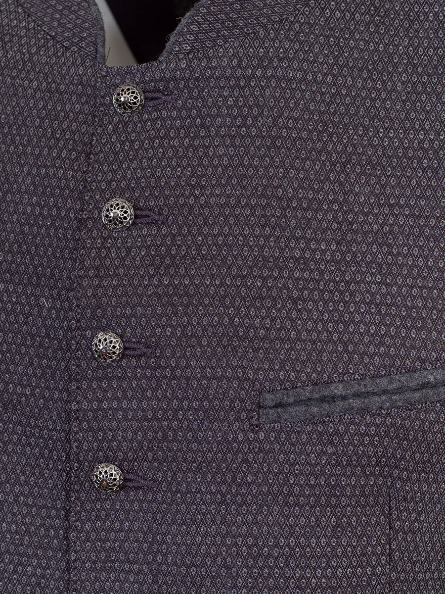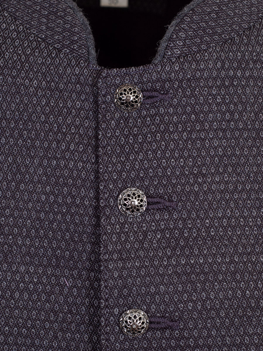 Schicke elegante Herren-Trachtenweste in der Farbe dunkelgrau mit gemusterten Knöpfen. Der Stoff der Herrenweste ist in sich rautenförmig gemustert, auch der Stehkragen. Die Weste hat 3 Paspoltaschen und eine Innentasche. Am schwarzen Futterrücken befindet sich ein Riegel zum Verstellen der Weite.