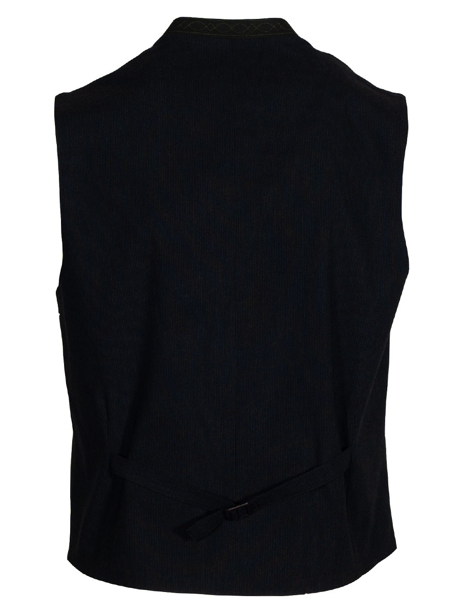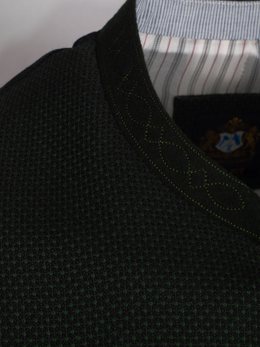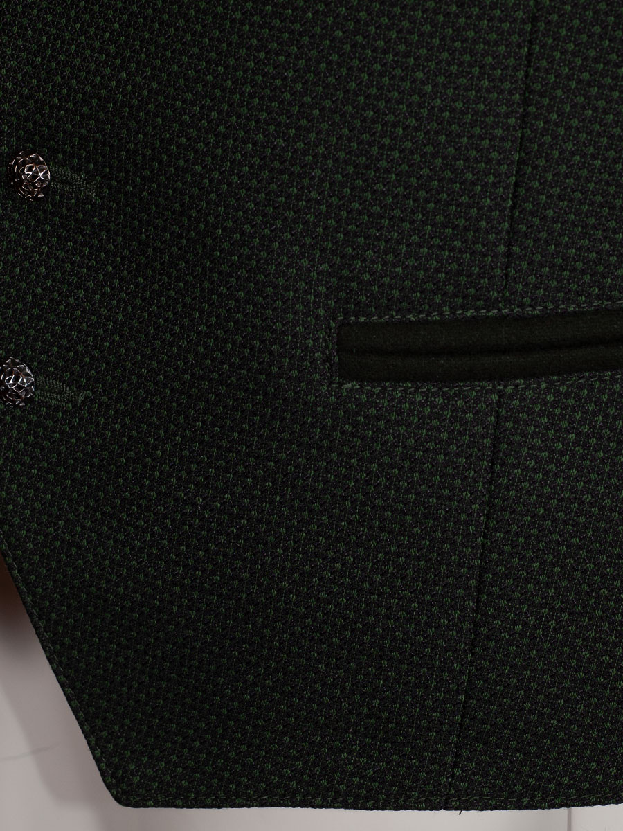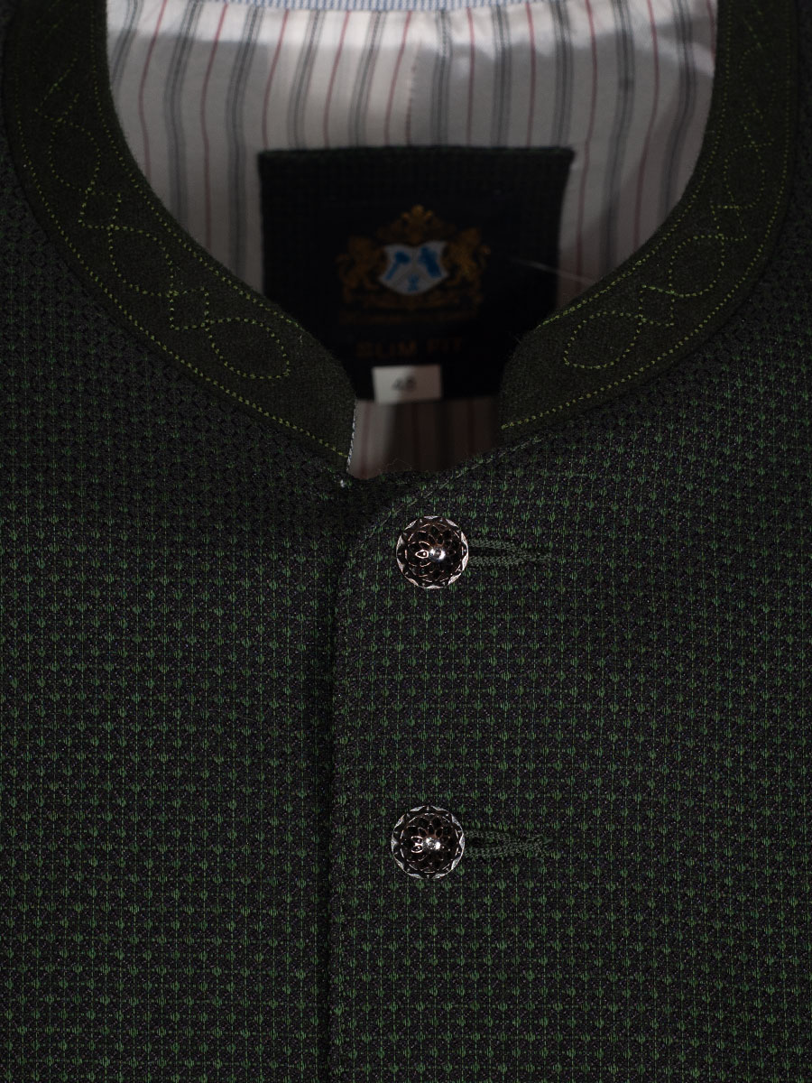Schicke elegante Herren-Trachtenweste in der Farbe grün mit gemusterten Knöpfen. Der Stoff der Herrenweste ist in sich rautenförmig gemustert, auch der Stehkragen. Die Weste hat 3 Paspoltaschen und eine Innentasche. Am schwarzen Futterrücken befindet sich ein Riegel zum Verstellen der Weite.