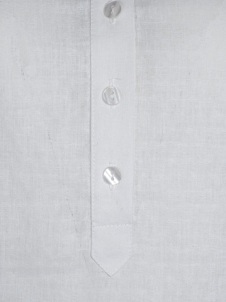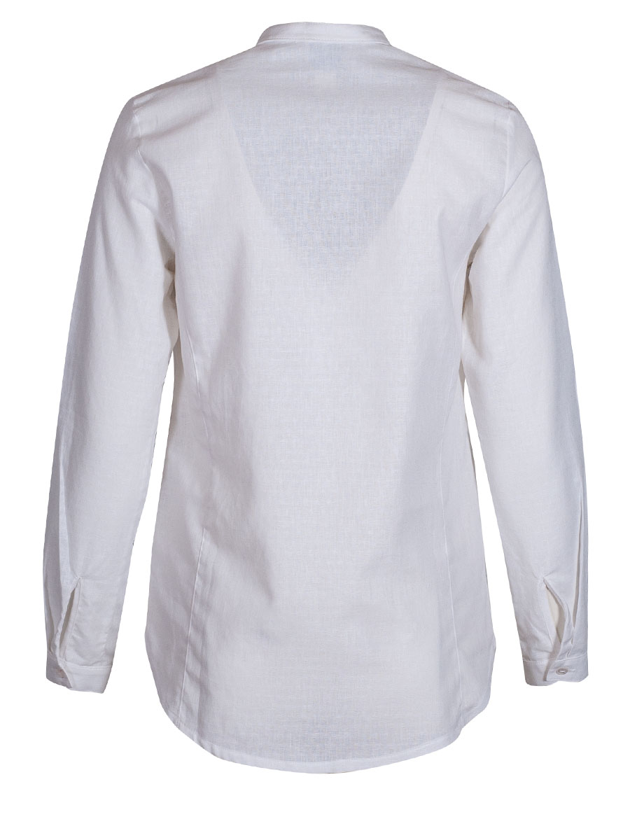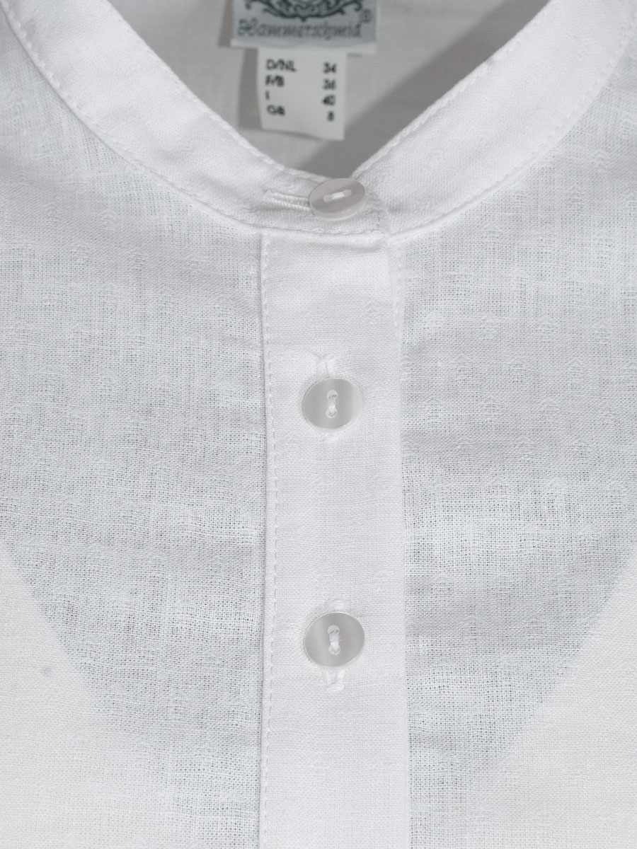 Weiße Langarmbluse der Firma Hammerschmid mit Stehkragen. Der weiße Mixstoff aus Baumwolle und Leinen ist in sich gemuster. Die Damenbluse wird bis zur Hälfte mit weißen Knöpfen geschlossen und ist somit als Pfoad gearbeitet. Das Rückenteil ist verlängert geschnitten.