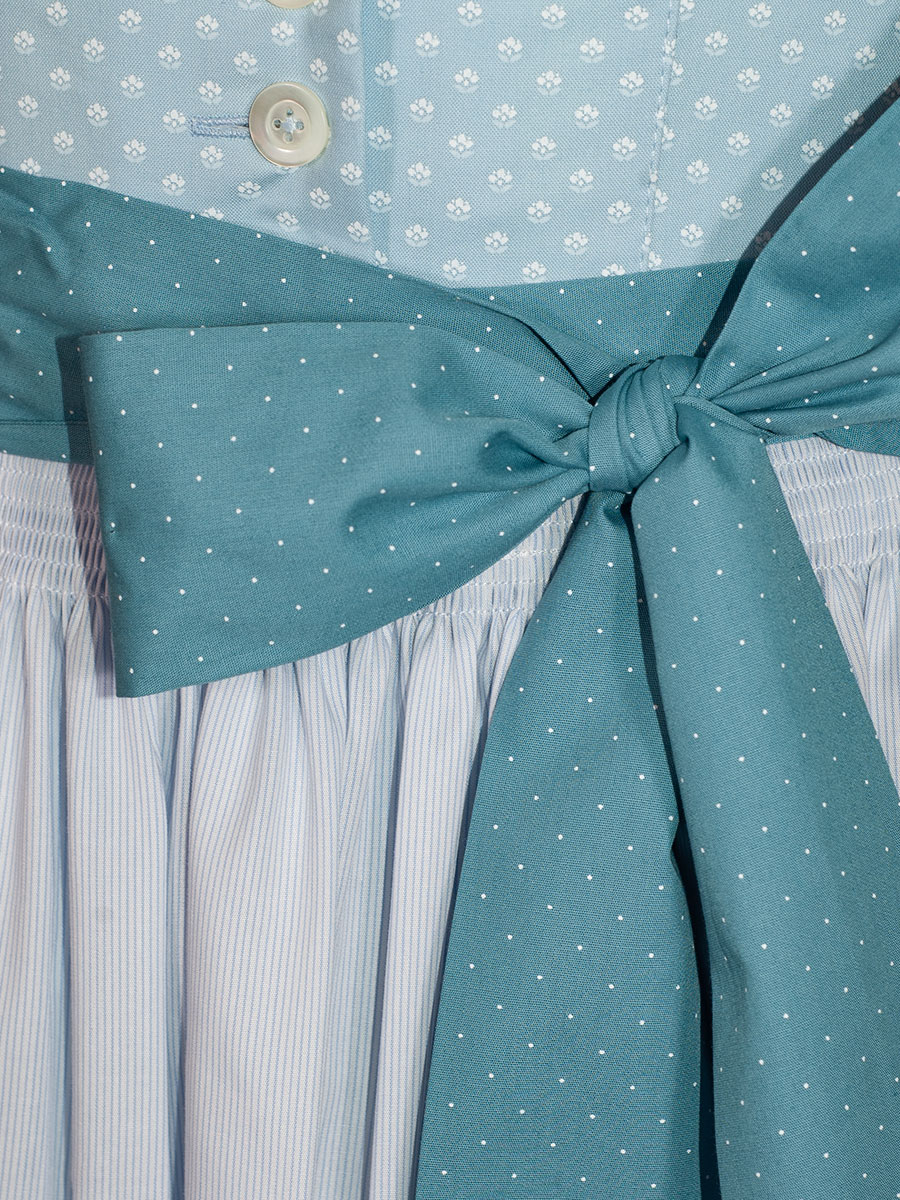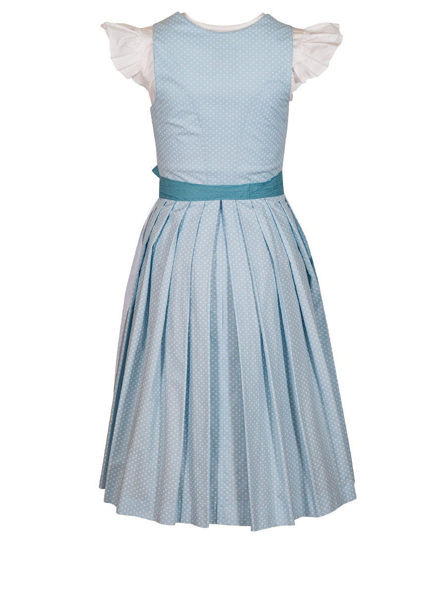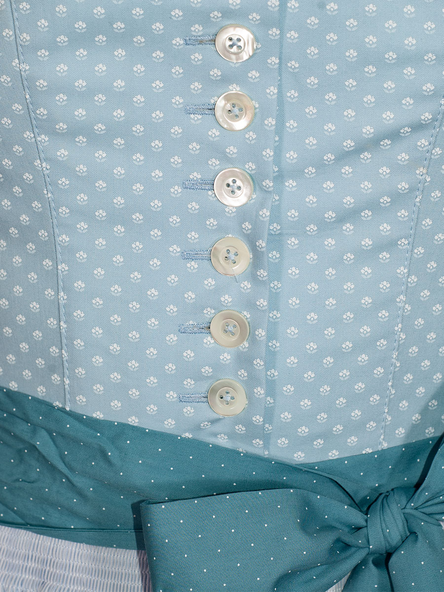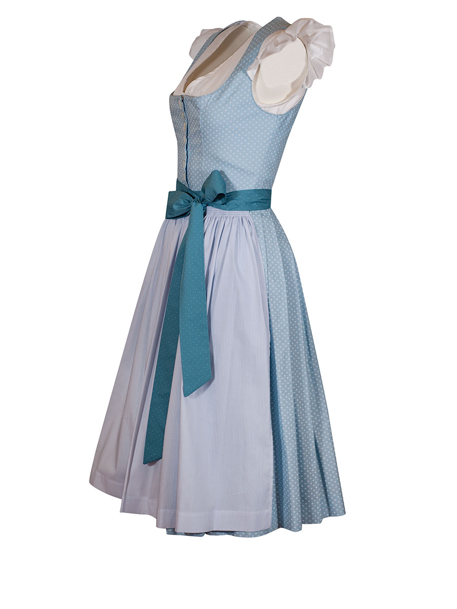 Baumwolldirndl aus der Pillersee-Reihe der Firma Hammerschmid. Mit dem freundlichen Hellblau ist es ein wunderschönes Sommerdirndl mit zartem Muster. Das schlichte Oberteil hat einen runden Ausschnitt und wird mit Perlmuttknöpfen geschlossen. Die zartblaue, einfarbige Schürze passt zum Kleid und gibt mit dem leuchtenden Schürzenband in Türkis einen heiteren Farbtupfer.