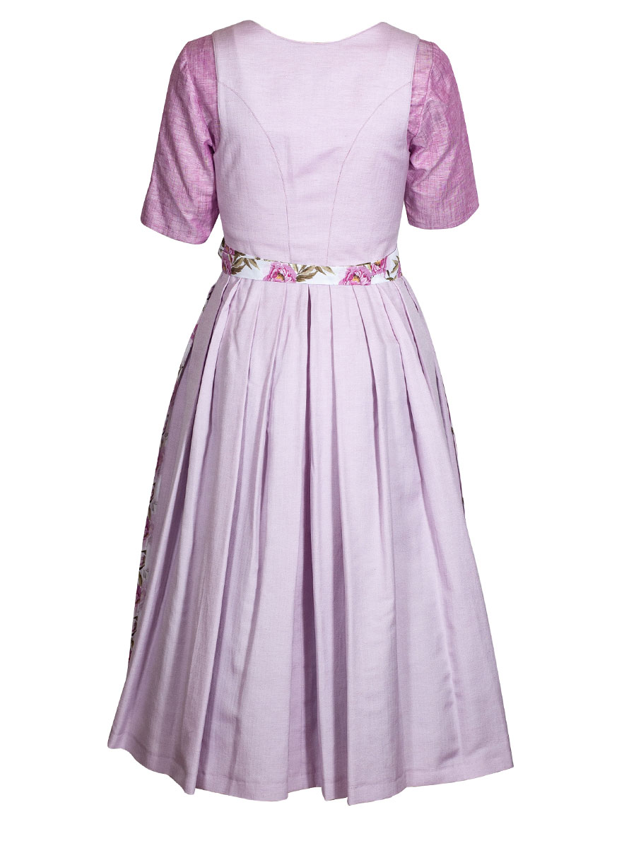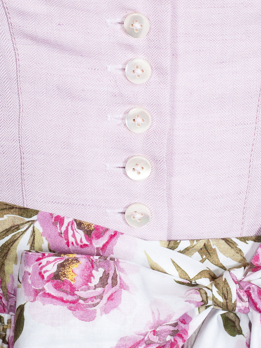 Rosefarbenes Dirndlkleid mit zwei Rocktaschen der Firma Hammerschmid. Der Dirndlstoff ist im Fischgradmuster gewebt. Geschlossen wird das schlichte Oberteil mit weißen Perlmutt-Knöpfen. Die helle Schürze ist im Allover-Print mit großen pinkfarben Blumen bedruckt. Ein wunderschönes freundliches Sommerdirndl.