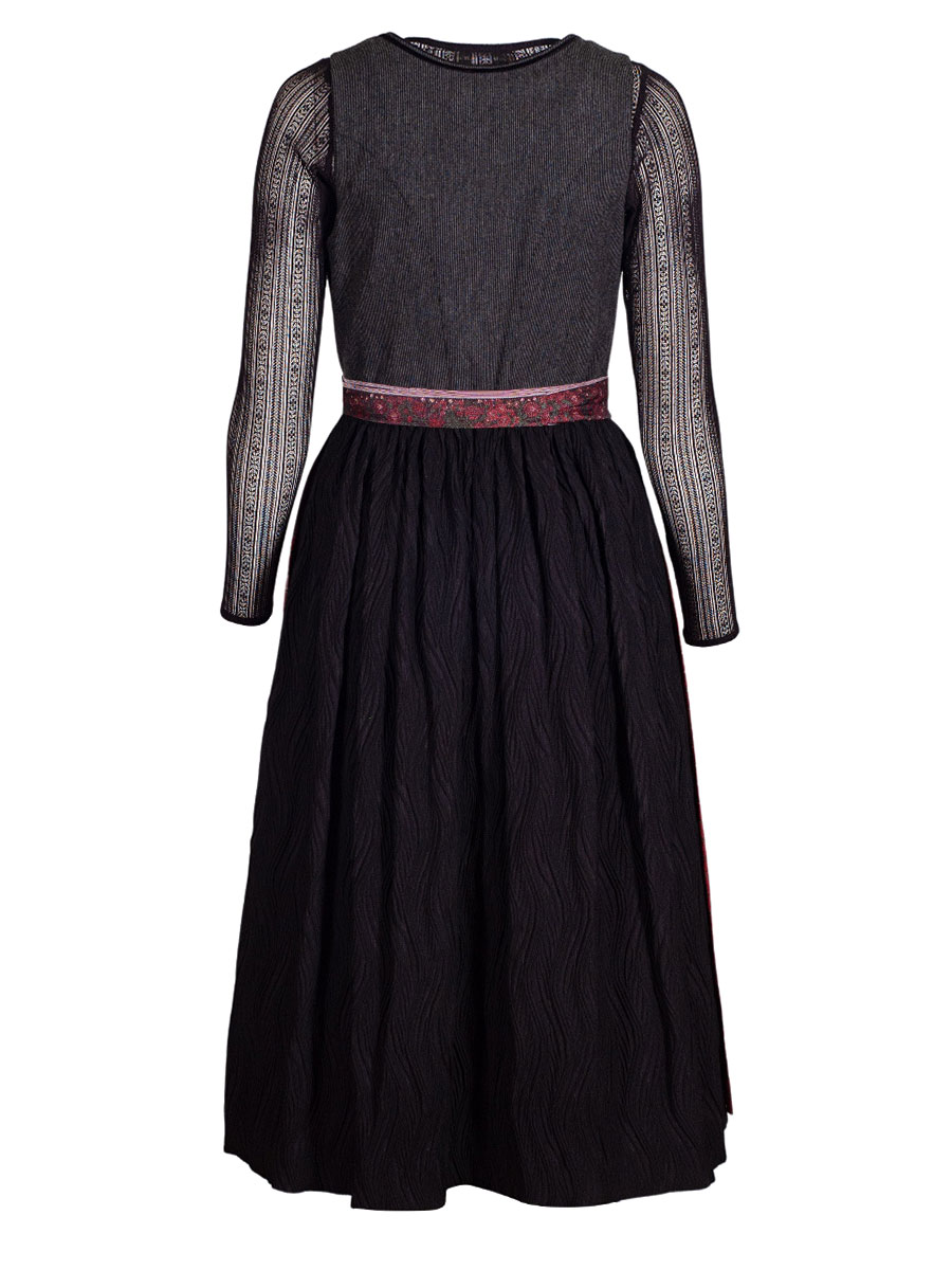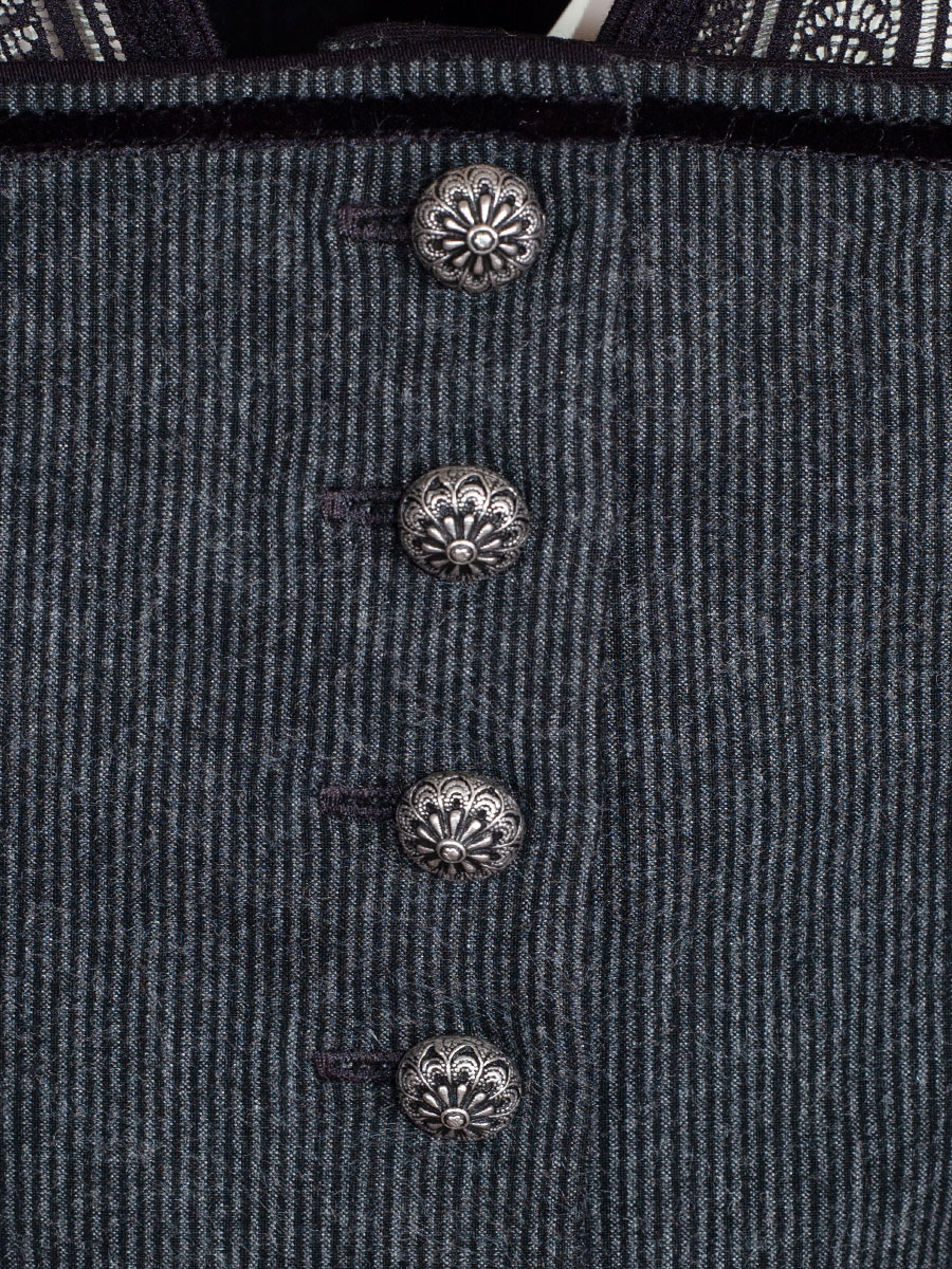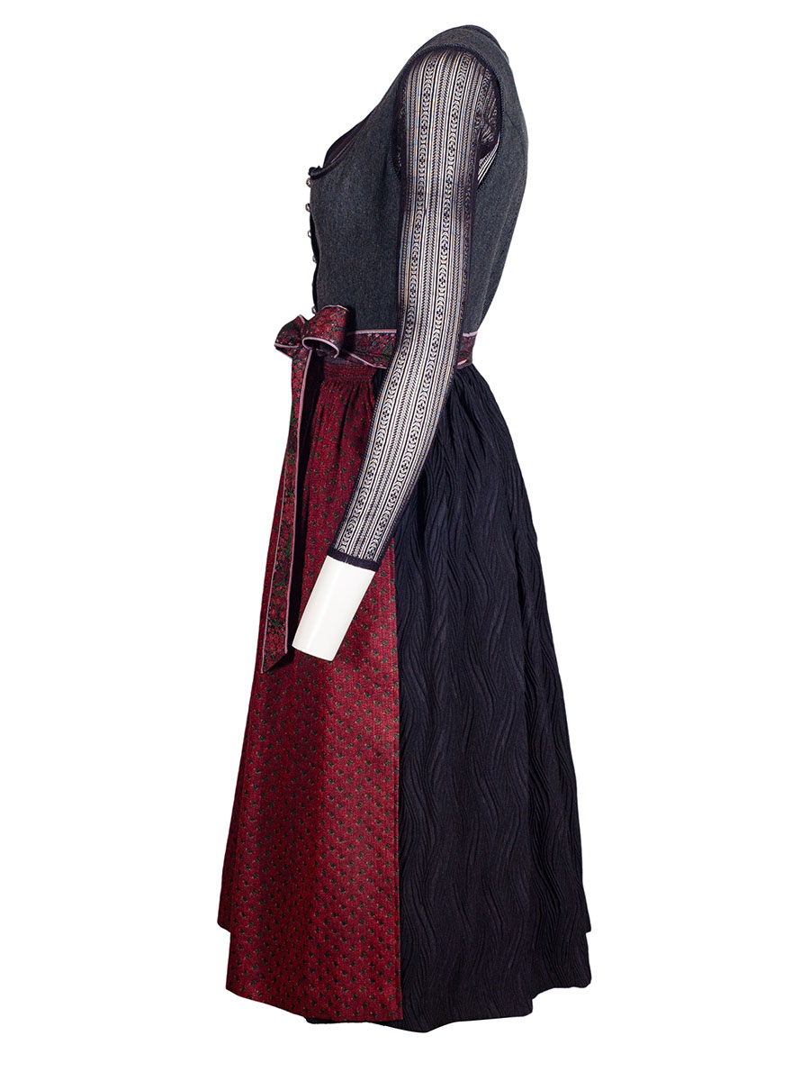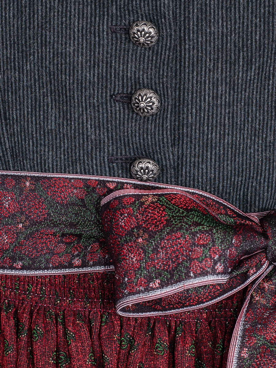 Wunderschönes Dirndl aus dem Hause Hammerschmid mit einem ausgefallenen Stoff-Mix. Das Oberteil ist mit feinen Nadelstreifen in grau und schwarz gemusert und hat einen runden Ausschnitt, welcher mit einer schwarzen Samtborte verziert ist. Metallknöpfe mit Blümchenmuster schließen das Dirndl. Der schwarz Rock ist struktuiert und in sich gemustert und erinnert in der Haptik an einen Plisseerock. Die rote Schürze ist mit grünen Röschen gewebt und hat einen ebenfalls in diesen Farben gewebte Borte als Schürzenband.