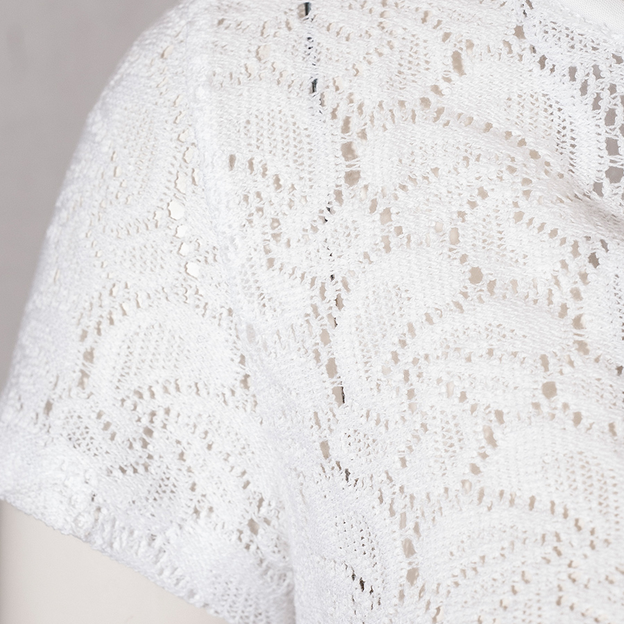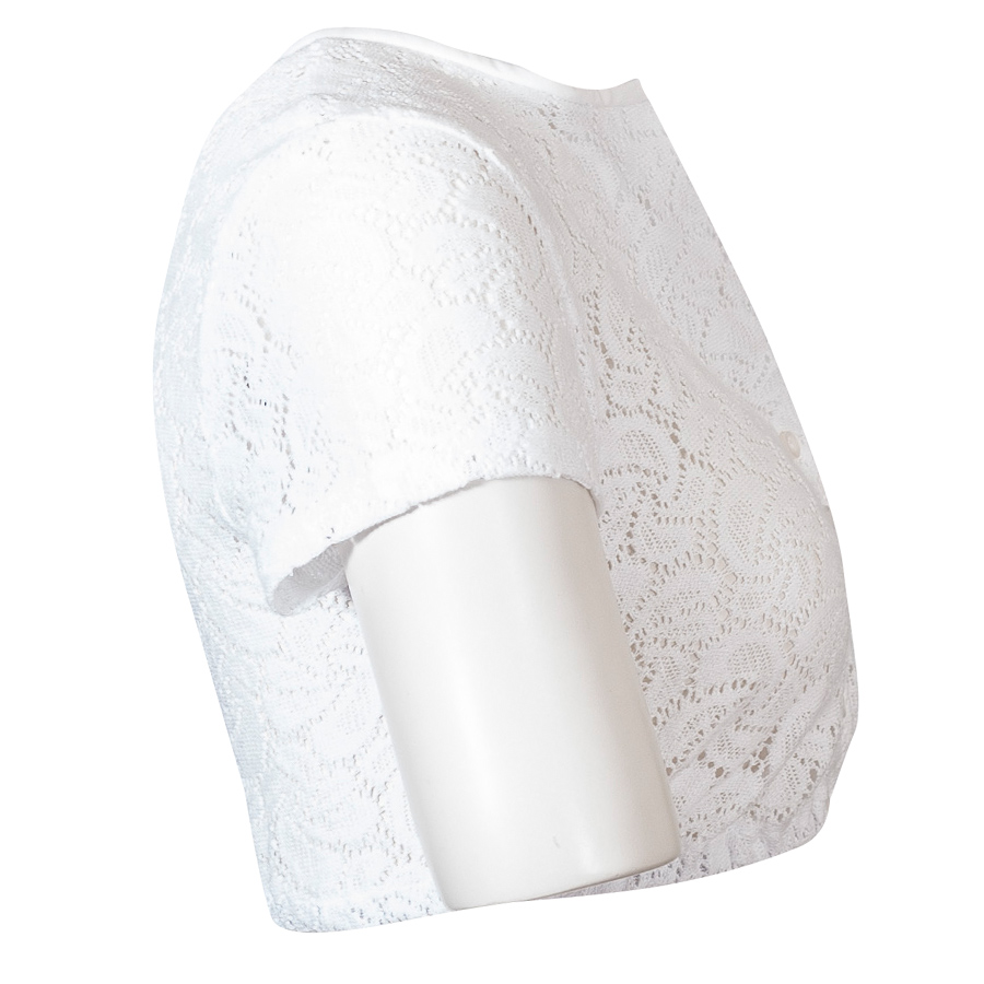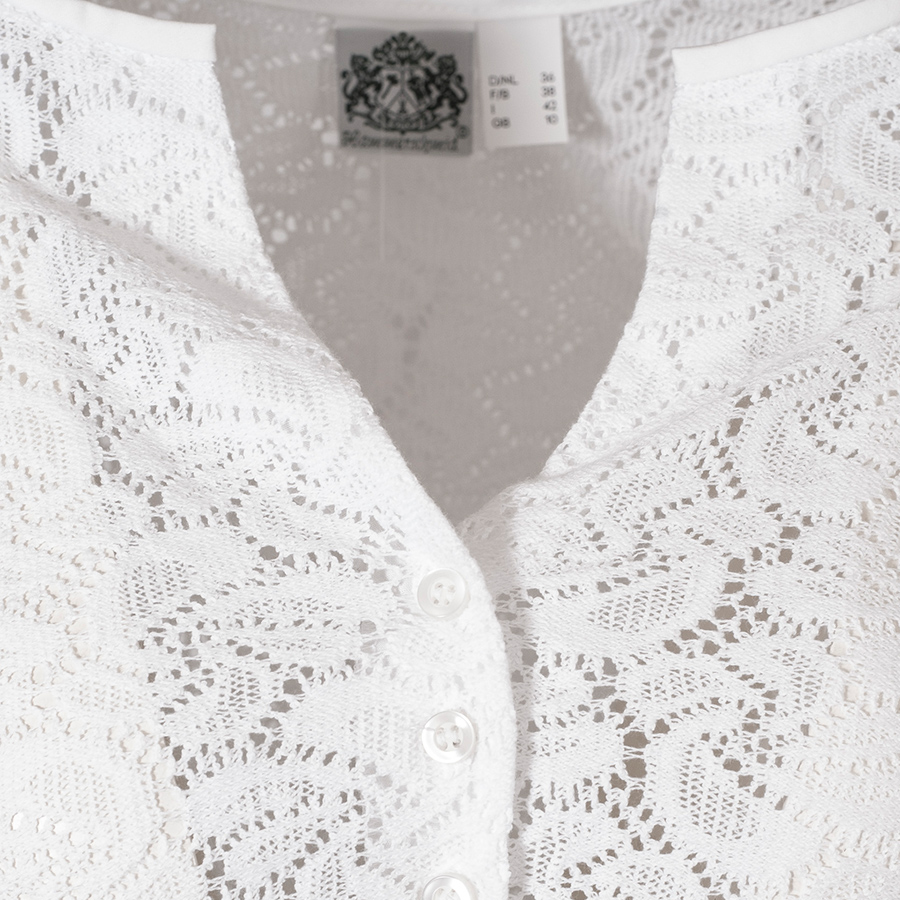 Hochgeschlossene Dirndlbluse aus Shirtstoff der Firma Hammerschmid. Die weiße Dirndlbluse mit blumenförmigen Lochmuster hat kurze Arme und einen V-Ausschnitt. Ein Gummizug unterhalb der Brust sorgt für einen rutschfesten Sitz.