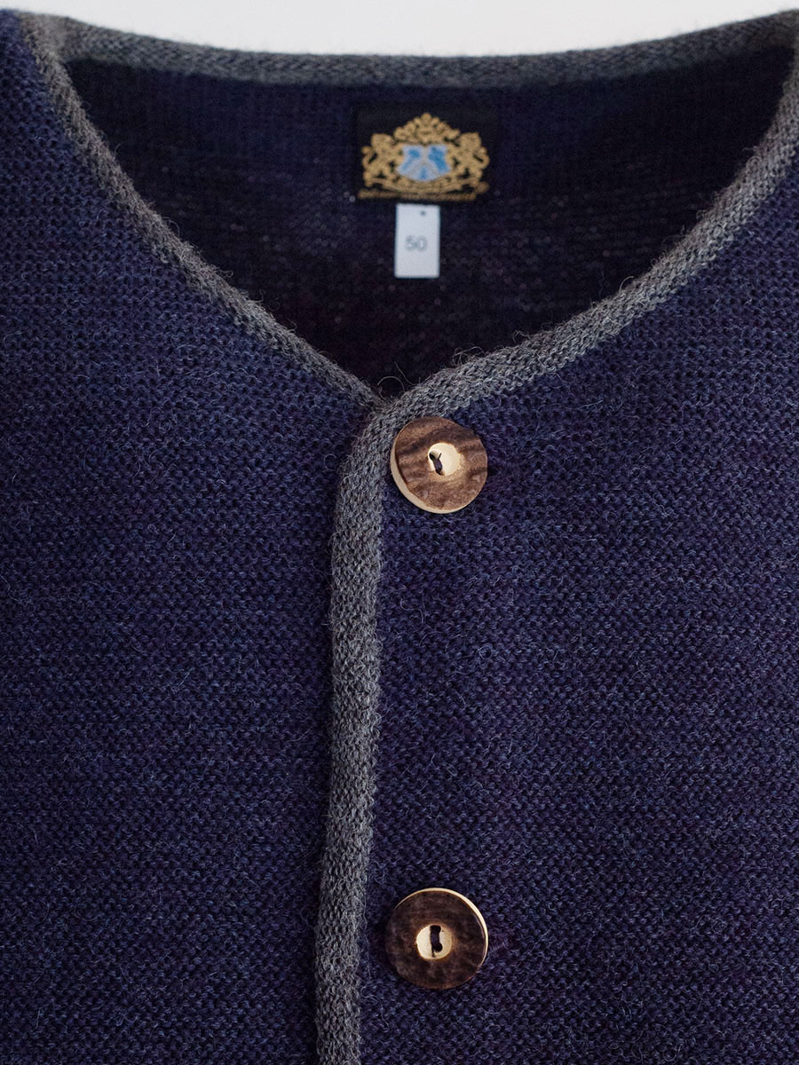 Glatt gestrickte Herren-Strickjacke der Firma Hammerschmid in blau mit dunkelgrauer Einfassung. Zum Schließen wurden hier passend Hirschhornknöpfe (Imitat) gewählt.