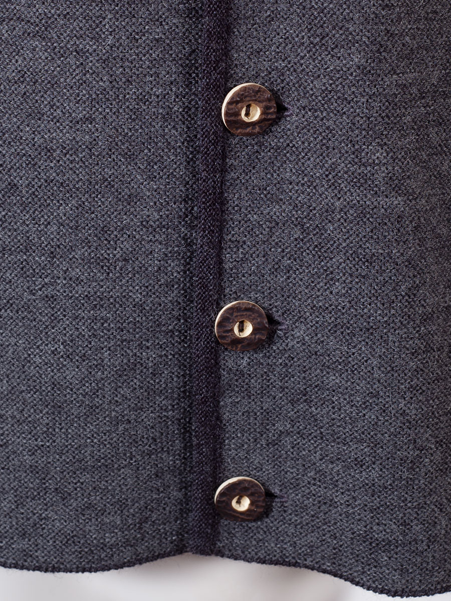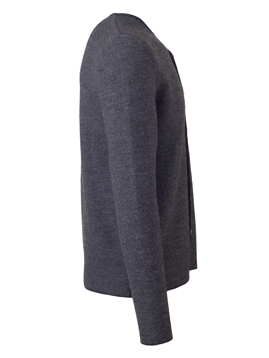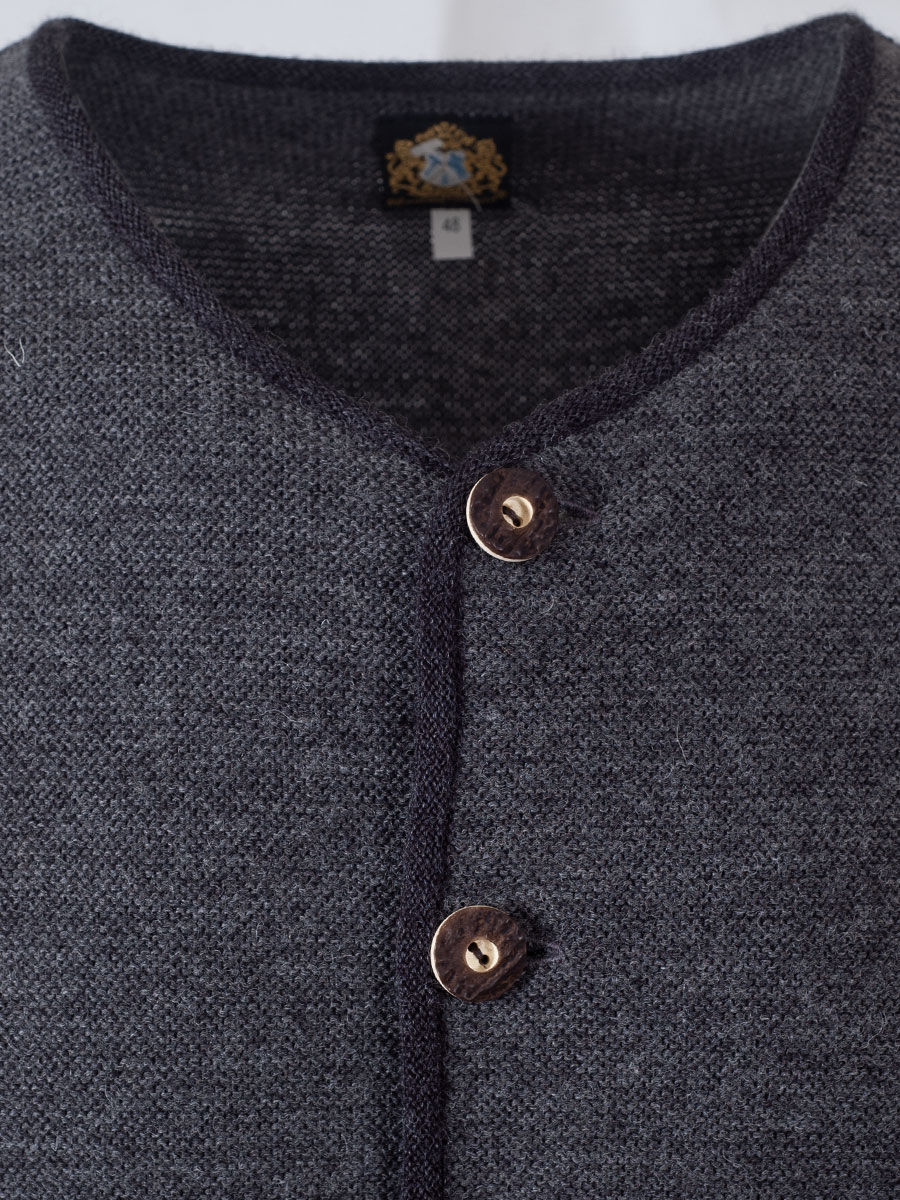 Glatt gestrickte Herren-Strickjacke der Firma Hammerschmid in grau mit anthrazitfarbener Einfassung. Zum Schließen wurden hier passend Hirschhornknöpfe (Imitat) gewählt.