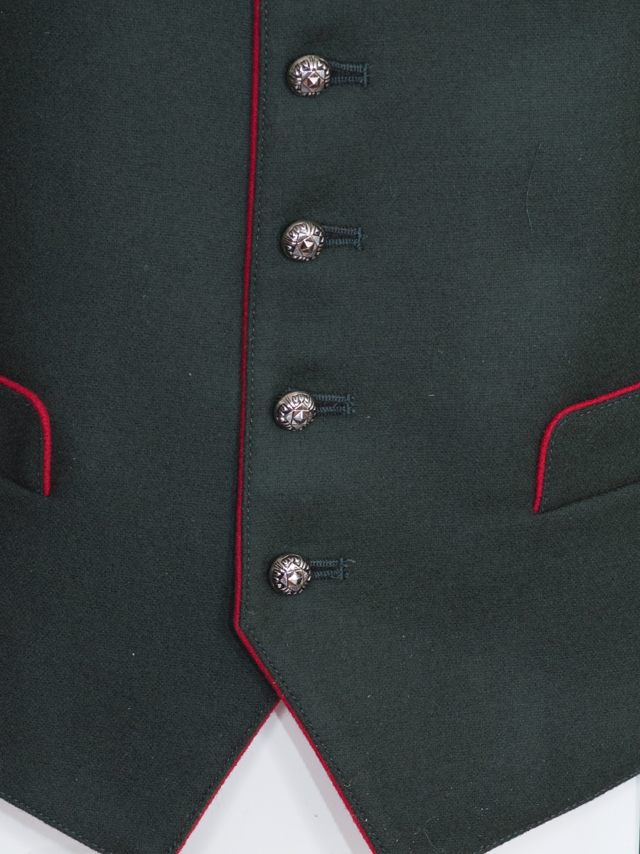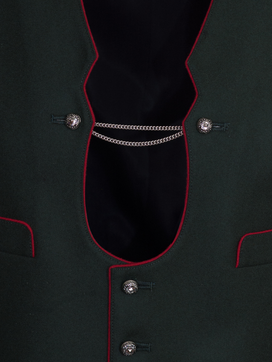 Schicke elegante Herren-Trachtenweste in der Farbe grün. Die Weste ist am Ausschnitt und am Kragen rot paspoliert. Der herzförmige Ausschnitt macht den Steg des Hosenträgers sichtbar. Über dem Ausschnitt ist eine silberne Kette. Die Herrenweste hat 2 Seiten- und 2 Brusttaschen. Am schwarzen Baumwollrücken befindet sich ein Riegel zum Verstellen der Weite.