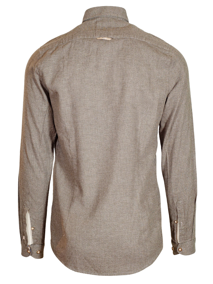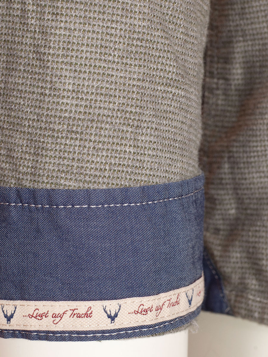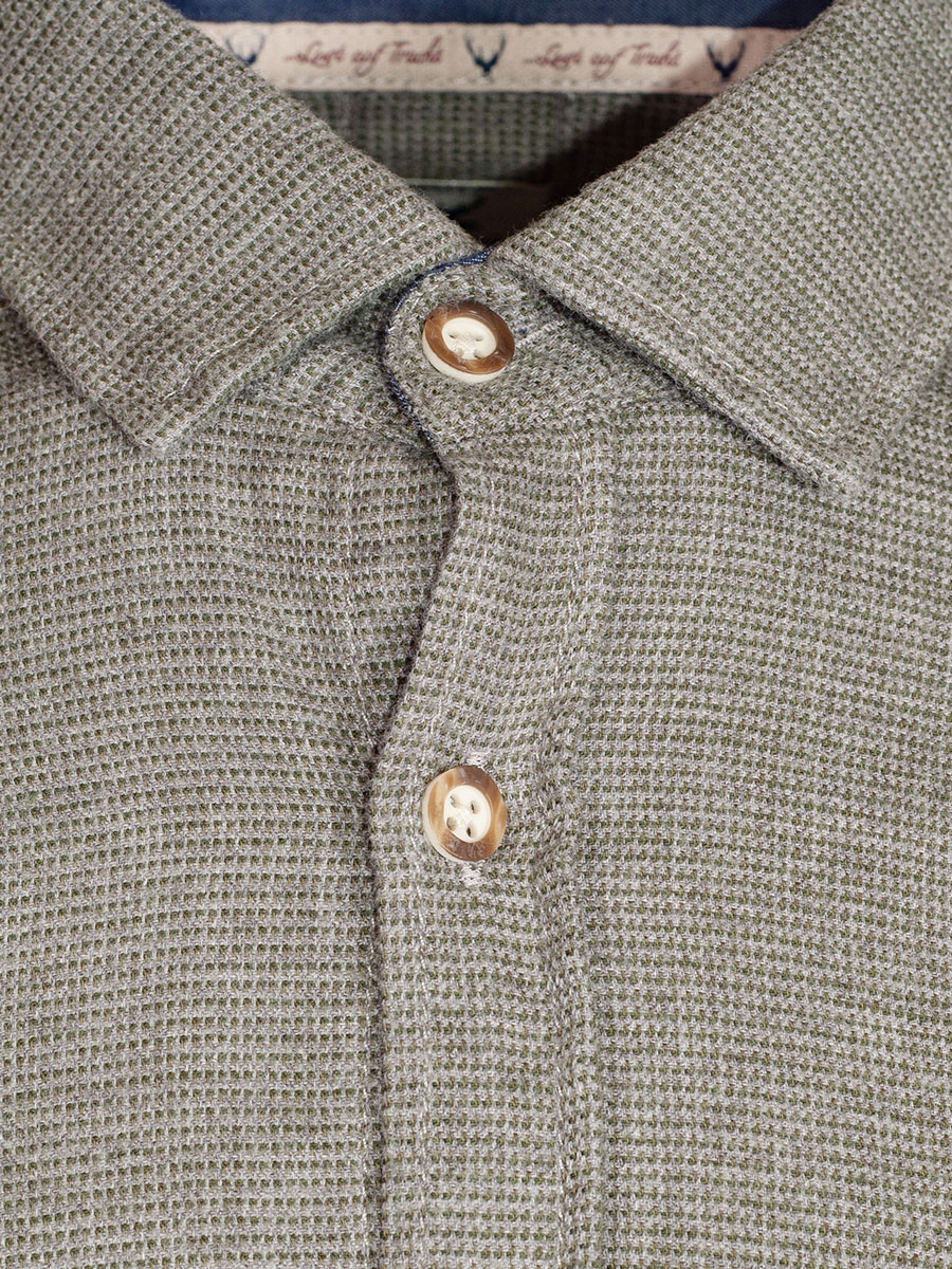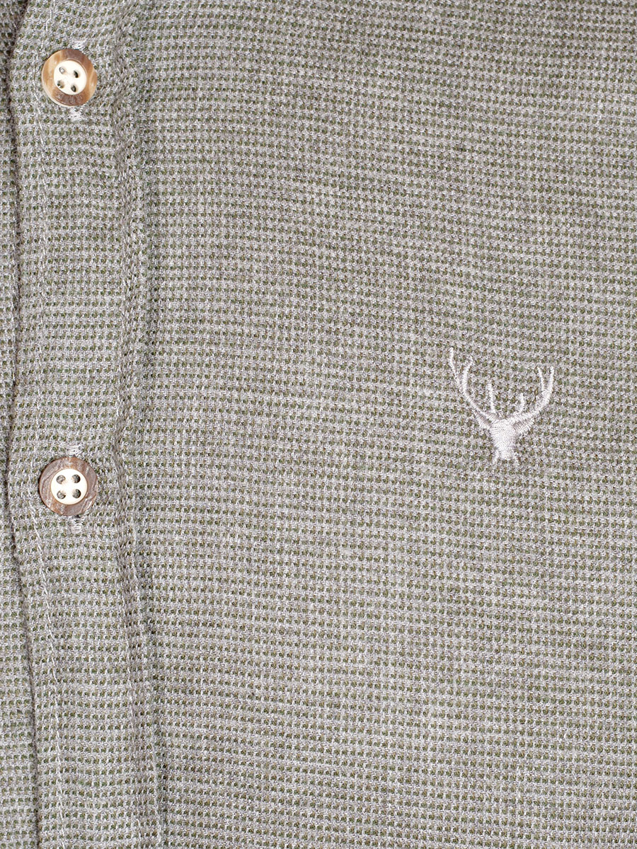 Olivfarbenes Herrenhemd der Firma hatico leicht in sich gemustert in SlimFit. Das Trachtenhemd ist mit kleinen Hirschhornknöpfen durchgeknöpft und hat einen Liegekragen. Die Innenseite von Kragen und Manschetten sind einfarbig blau mit einer Bordüre abgesetzt. Die Brust ziert ein heller Hirschstick. Der weiche Baumwollstoff ist sehr angenehm zu tragen.