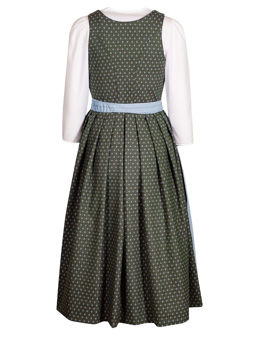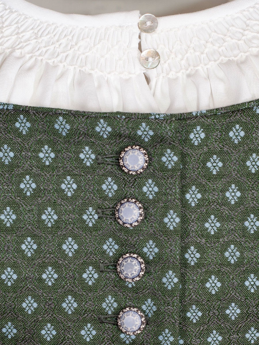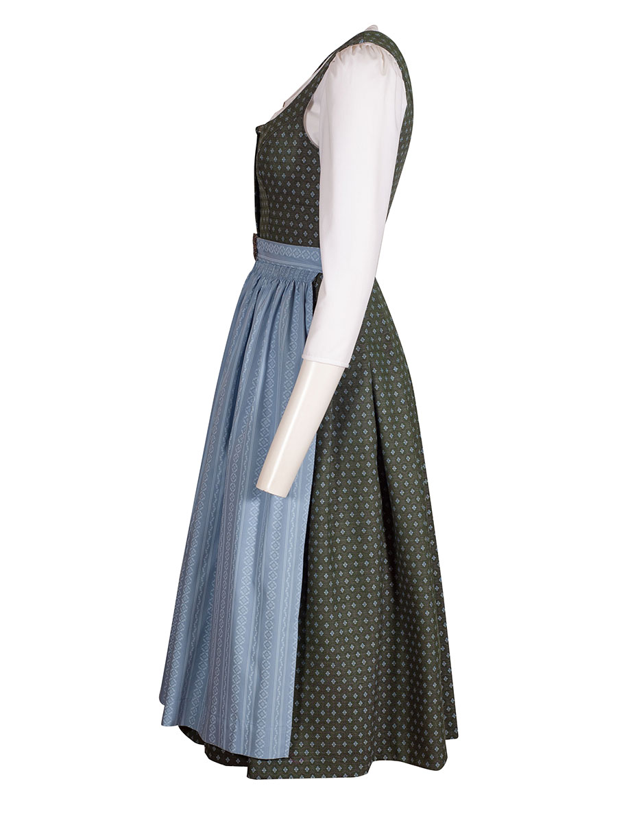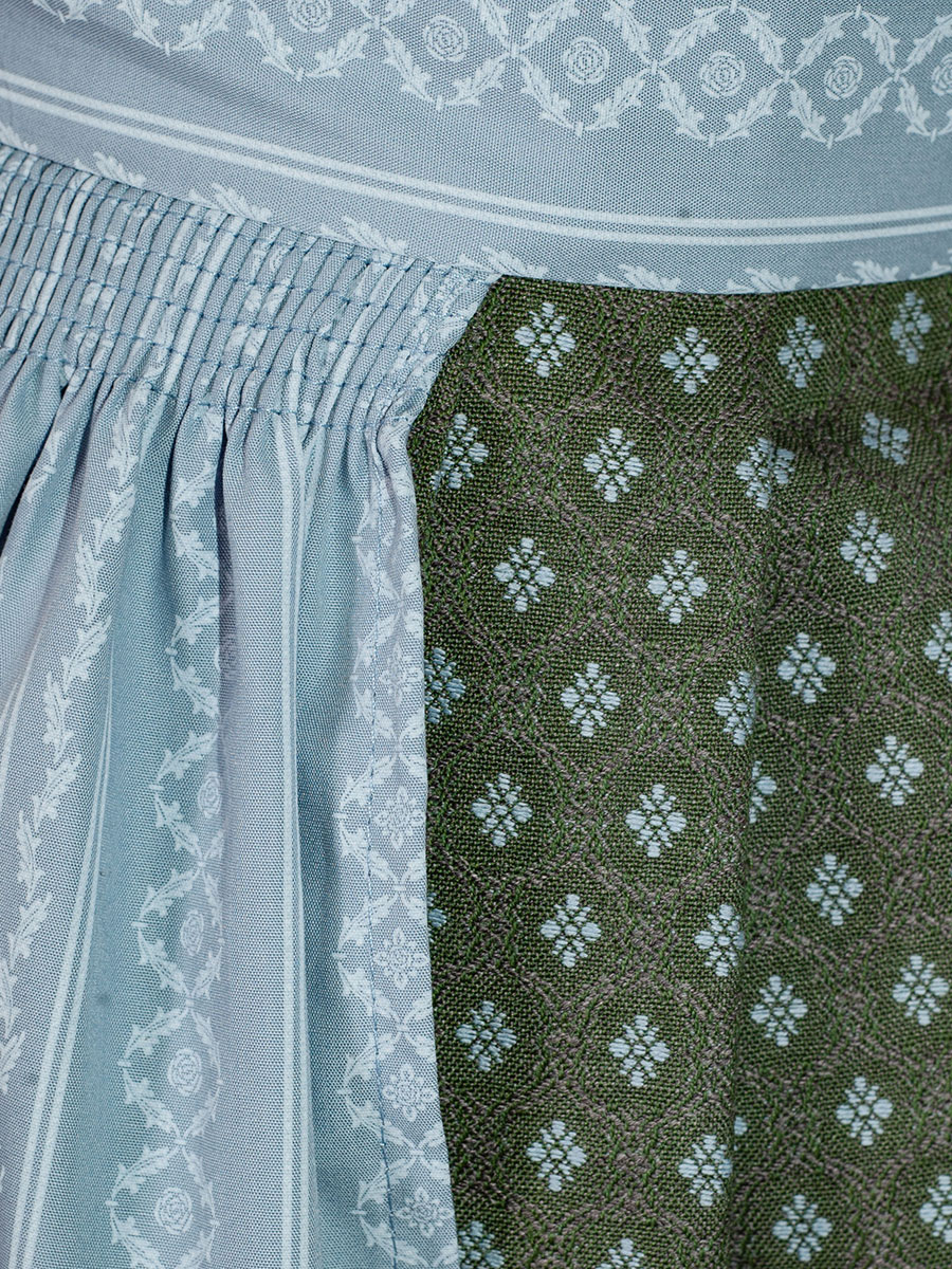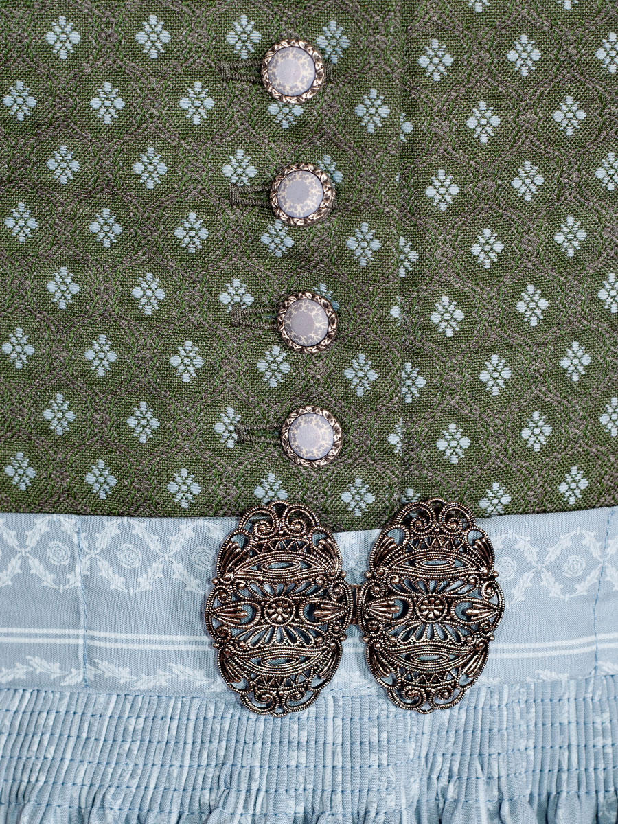 Ein herbstliches Dirndl aus Schurwolle. Oberteil und Rock sind in einem grünen Stoff gewebt mit hellblauen Blümchen. Wunderschöne Motivknöpfe schließen das Stretch-Oberteil. Elegant wirkt die Schürze mit der silbernen Schließe anstelle einer Schleife. Die Schürze selbst ist hellblau mit hellem längsgestreiftem Muster.