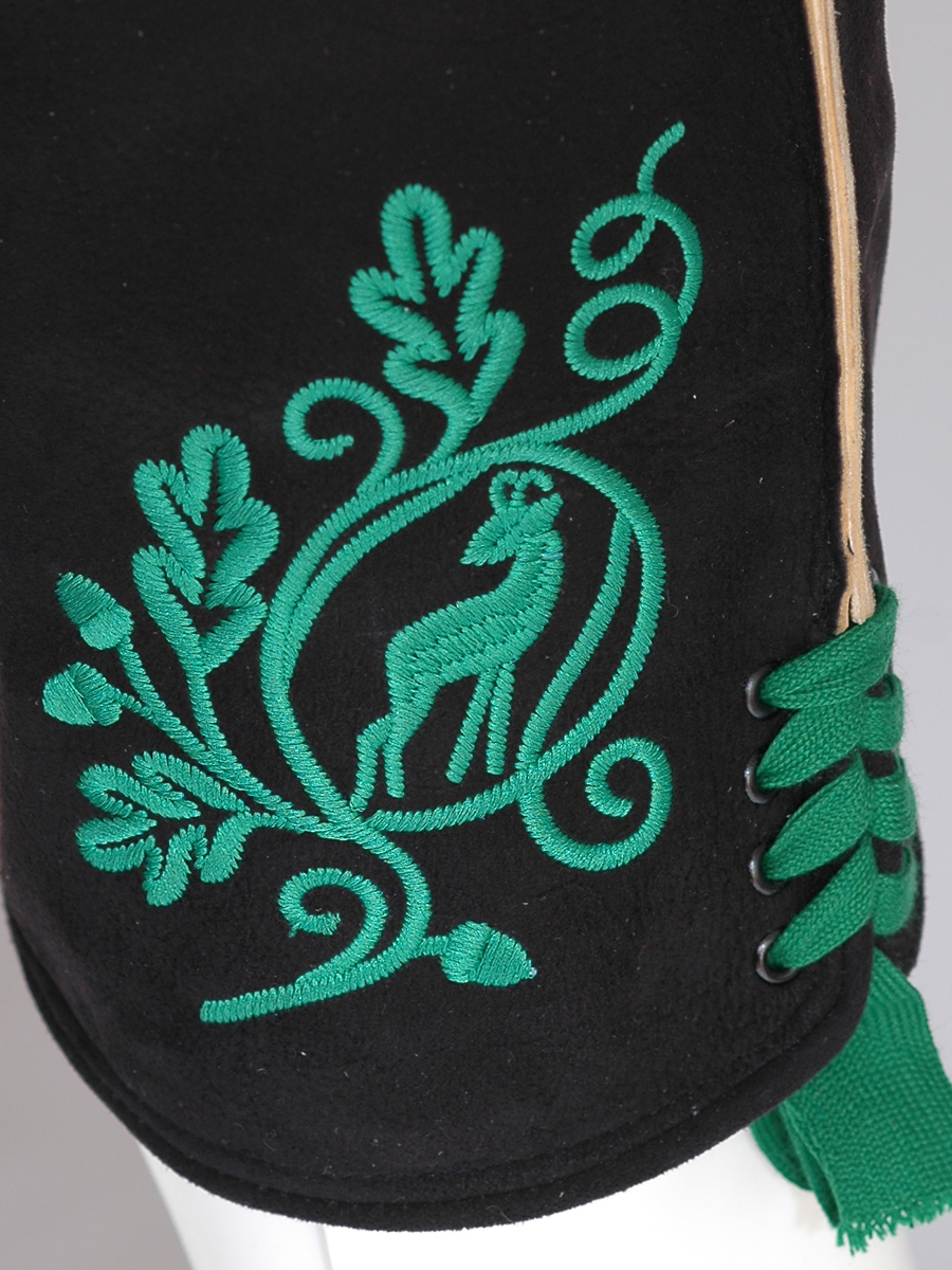 Lederhose aus echtem, sämina gegerbten Hirschleder. Die Hose ist am Latz, am Bein und an der Messertasche maschinenbestickt in Handstick-Optik. Am Beinabschluss wurden farblich passenden grünen Wollbändern verwendet. Die Hirschlederhose kann am Bund in der Weite reguliert werden.