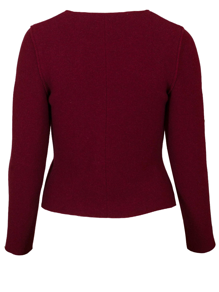 Die bordeauxrote Damenjacke wird mit schimmernde Perlmuttknöpfe in Holzoptik geschlossen. Rechts und links gibt es je eine kleine dezente Tasche.